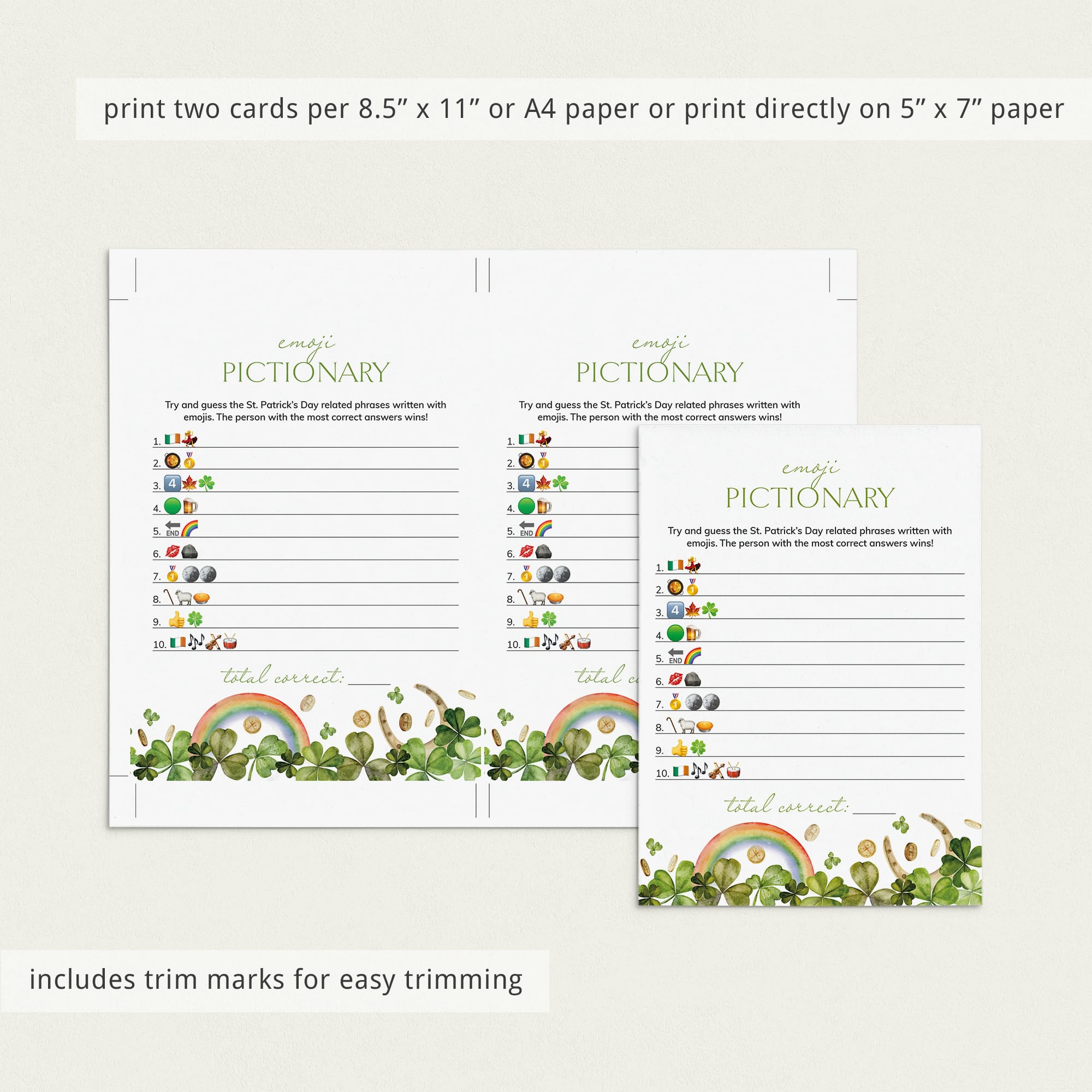 This Saint Patrick's Day emojis game is an instant download. After purchase you will receive a download link immediately on screen. Also within minutes of your order and payment, an e-mail will be sent to you with a link for your download.