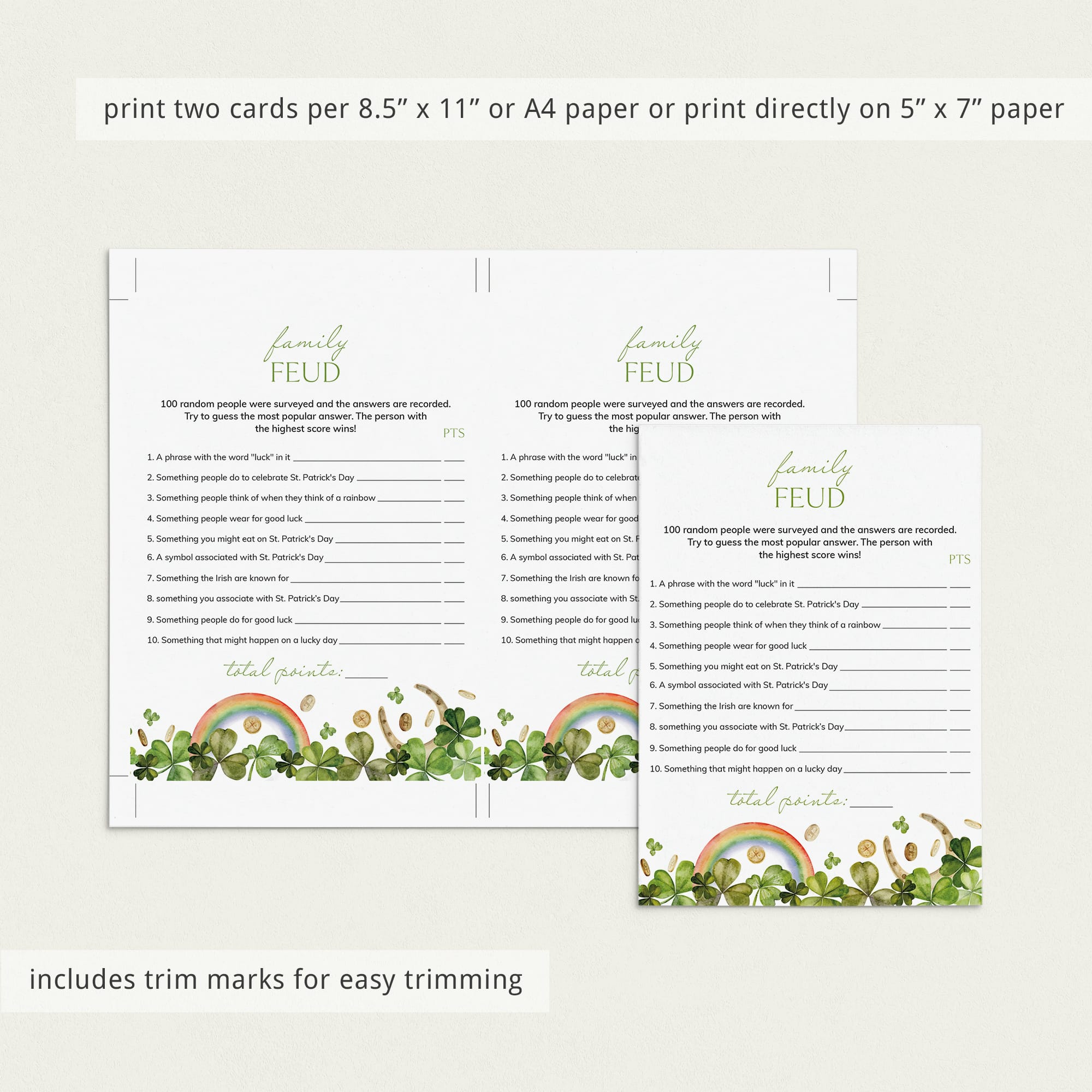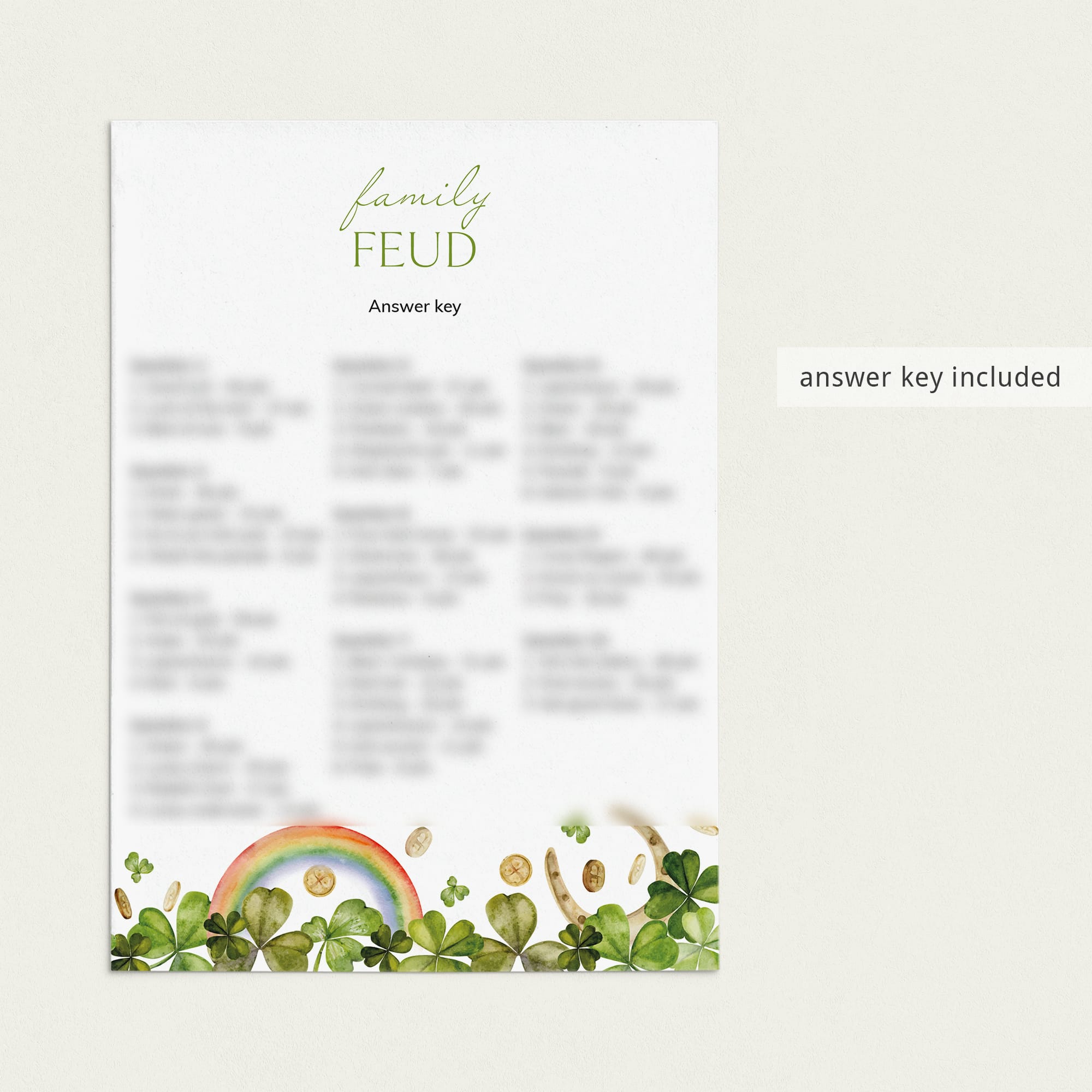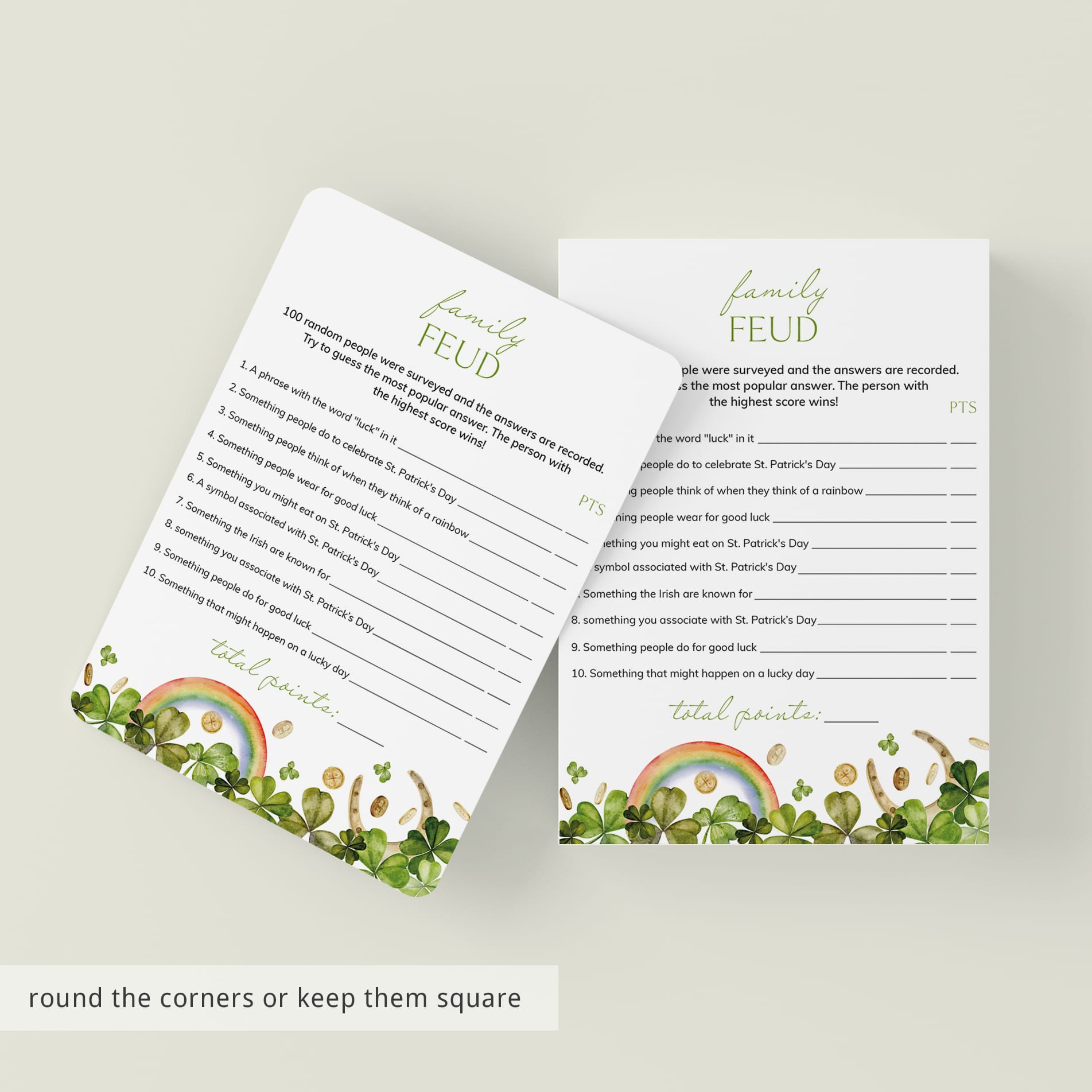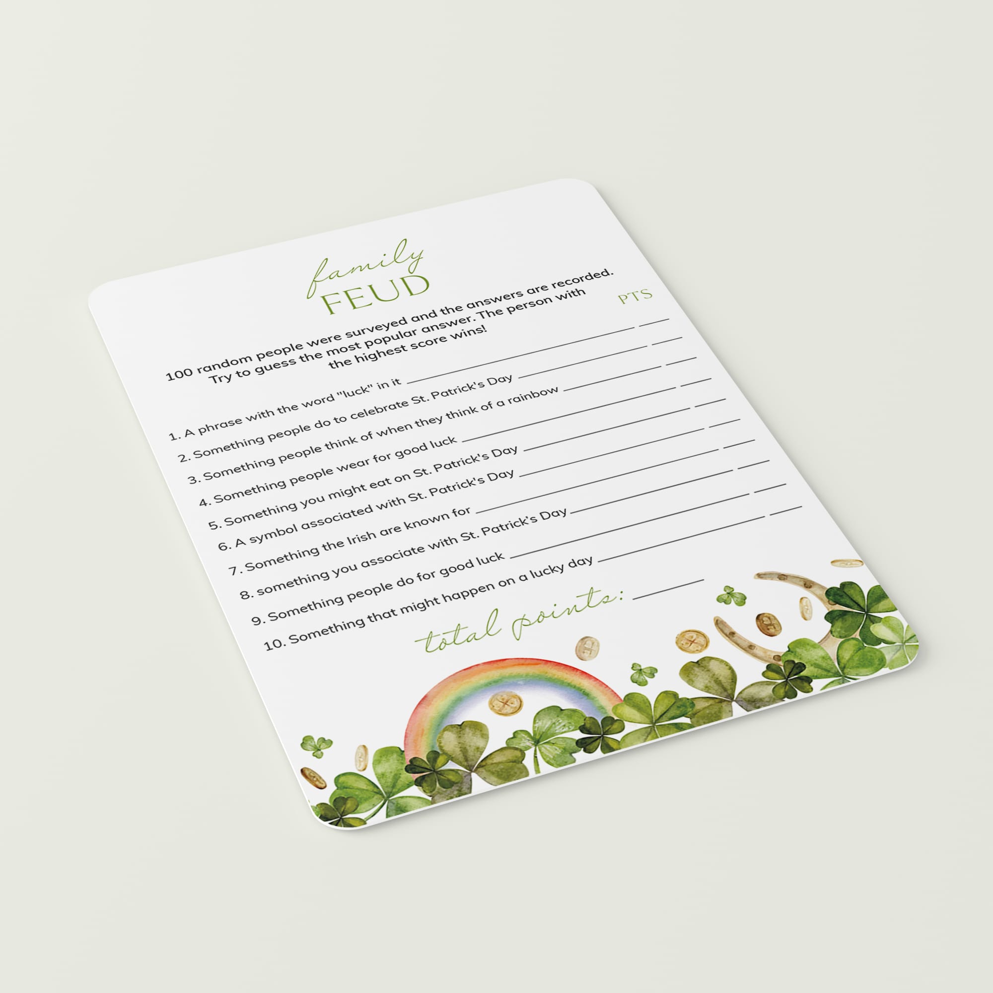 Add some fun to your St Patricks Day Party with this St Patricks Day Family Feud game. Family Feud is one of the best game shows ever. Have your friends and family compete to guess the most popular answer to 10 St. Patrick's Day themed family feud questions. An answer key with the family feud answers and points is included. The person or team with the highest score wins!