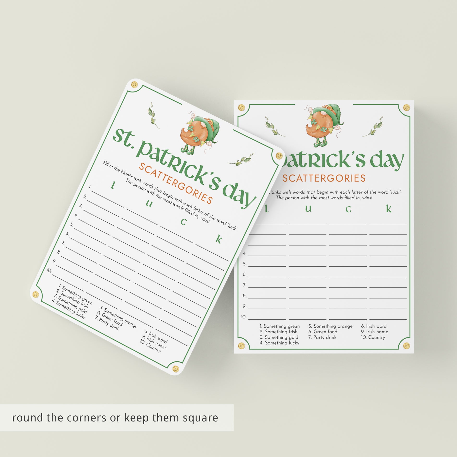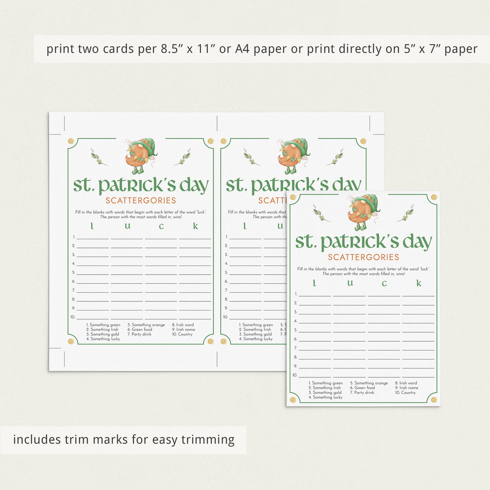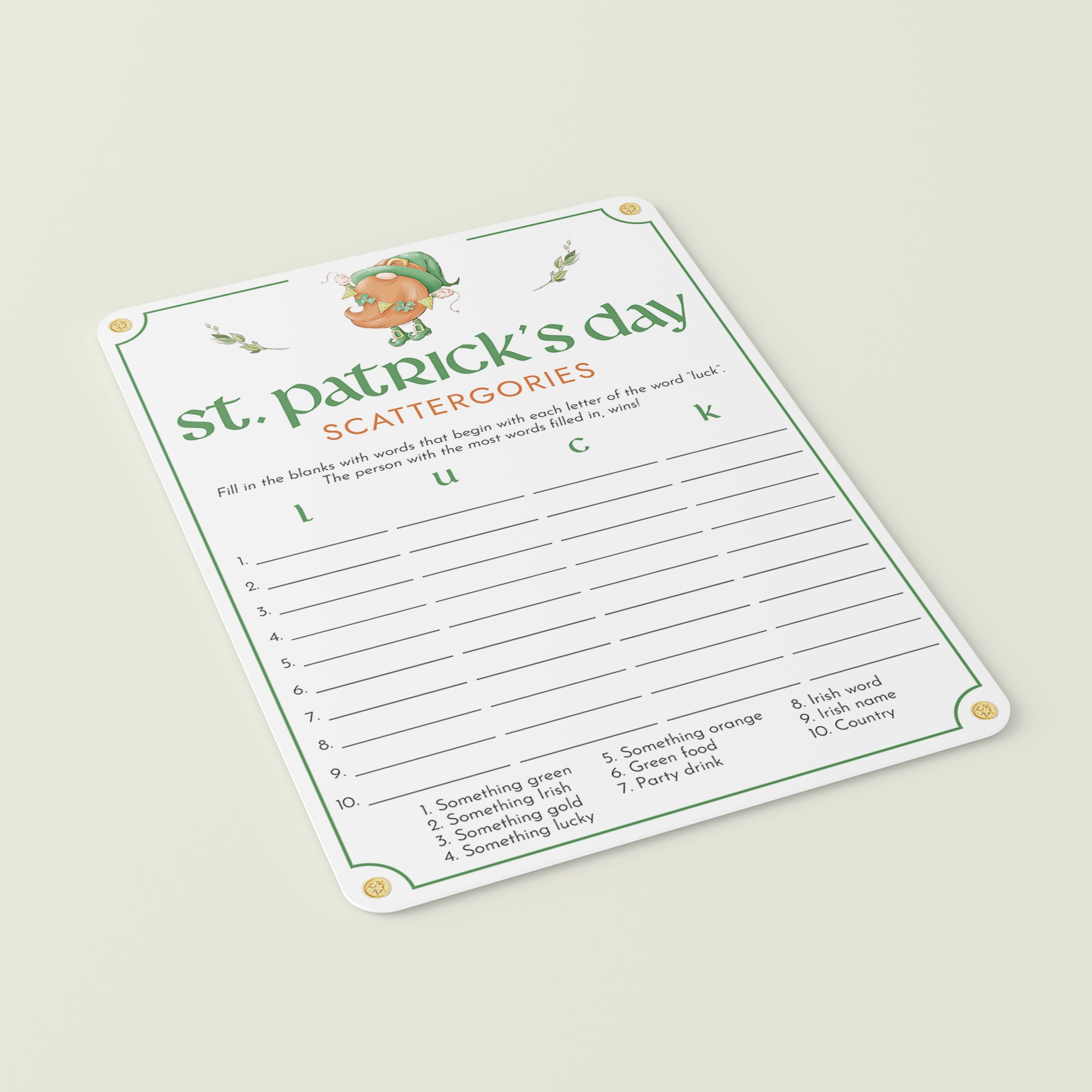 How many words can you fill in with the letters "L", "U", "C" and "K"? Play St Patrick's Day Scattergories to ensure lots of fun and laughter. This fun game card with Saint Paddy gnome is great fun for all ages. You can play St. Patrick's Day Scattergories in your classroom, at work or at home with family and friends.