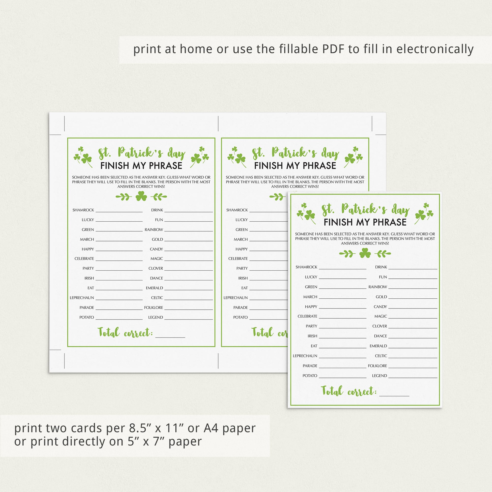 For an in-person St Patrick's Day office party, download and print the game cards as many times as you need. We recommend printing on a nice heavy card stock for highest quality feel. Print right from your computer in a matter of minutes or have the cards printed at your favorite print shop.