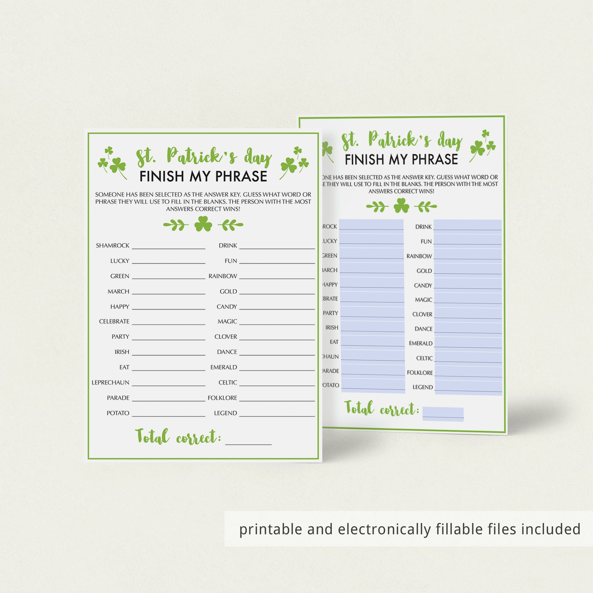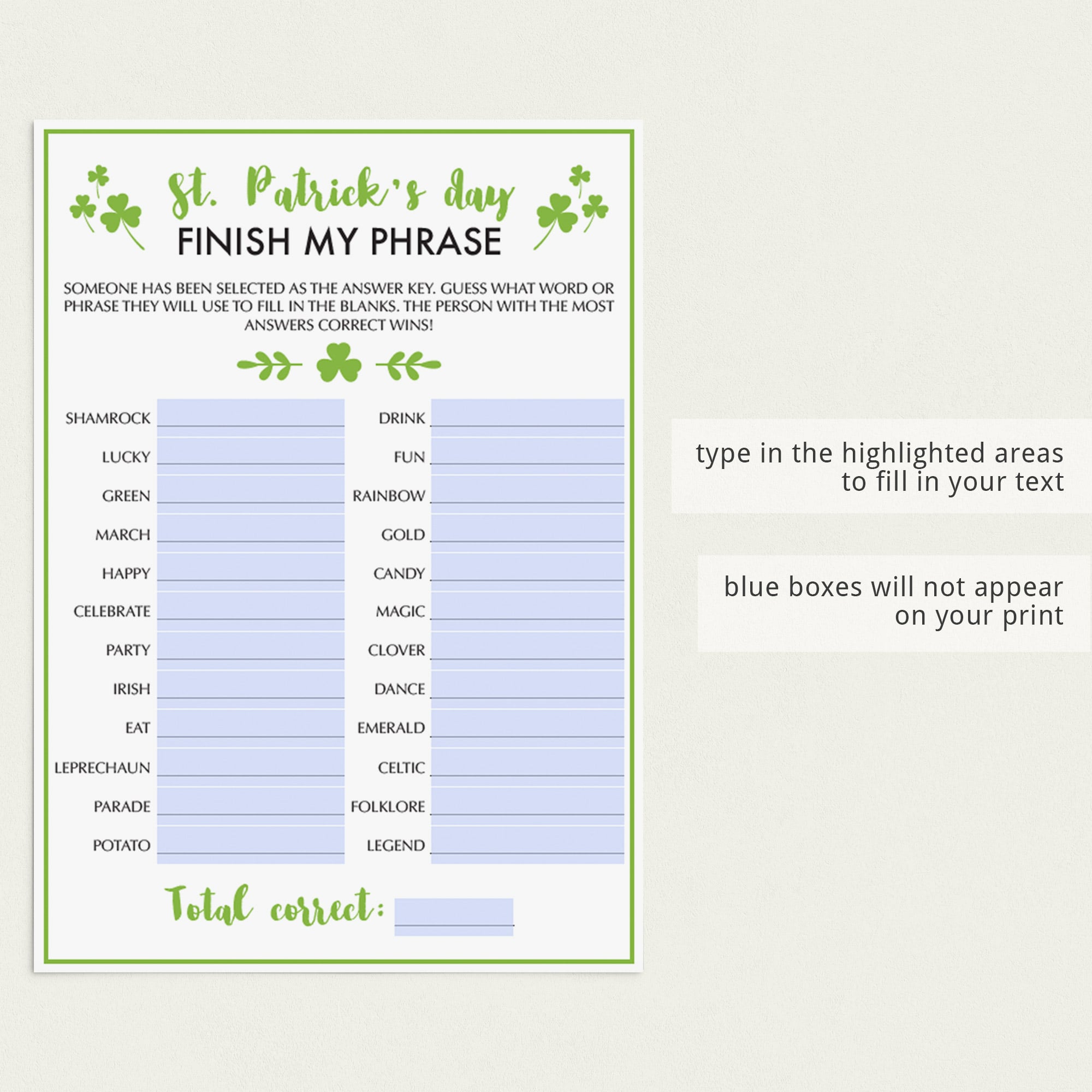 Saint Patrick's Day Finish My Phrase is a great game to play at the office. It is a fun activity for all ages and very easy to play. You can play this game in-person with your co-workers or over a video call app like Teams or Zoom. Printable and electronically fillable files are included.