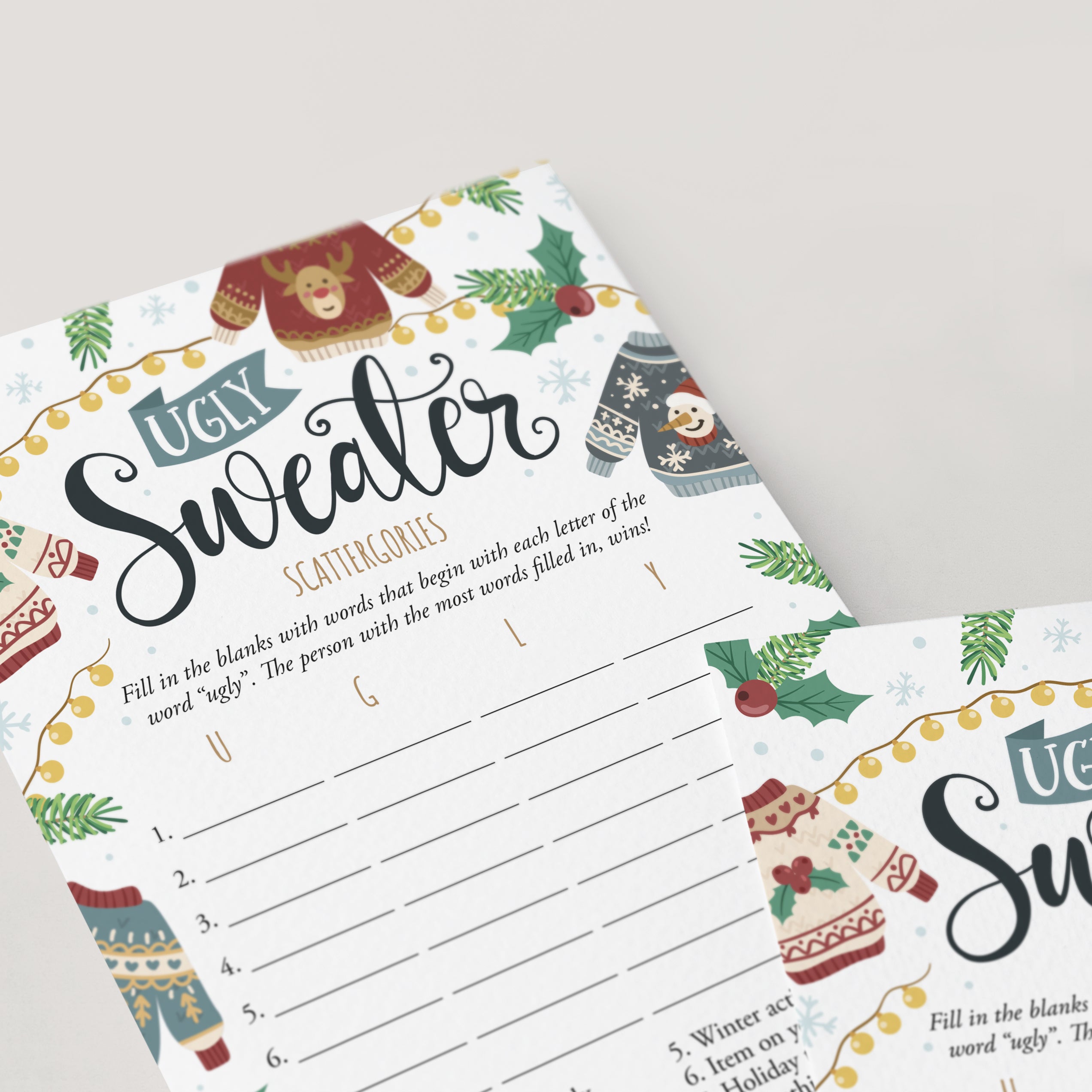 How to play the Christmas Scattergories game? Simply hand out one of these Ugly Sweater game cards and a pen to your guests. They will have to come up with as many words related to the categories at the bottom of the sheet. The difficulty is that the words must begin with the letters in the word "UGLY". The person that gets the most words filled in within the set time, wins!