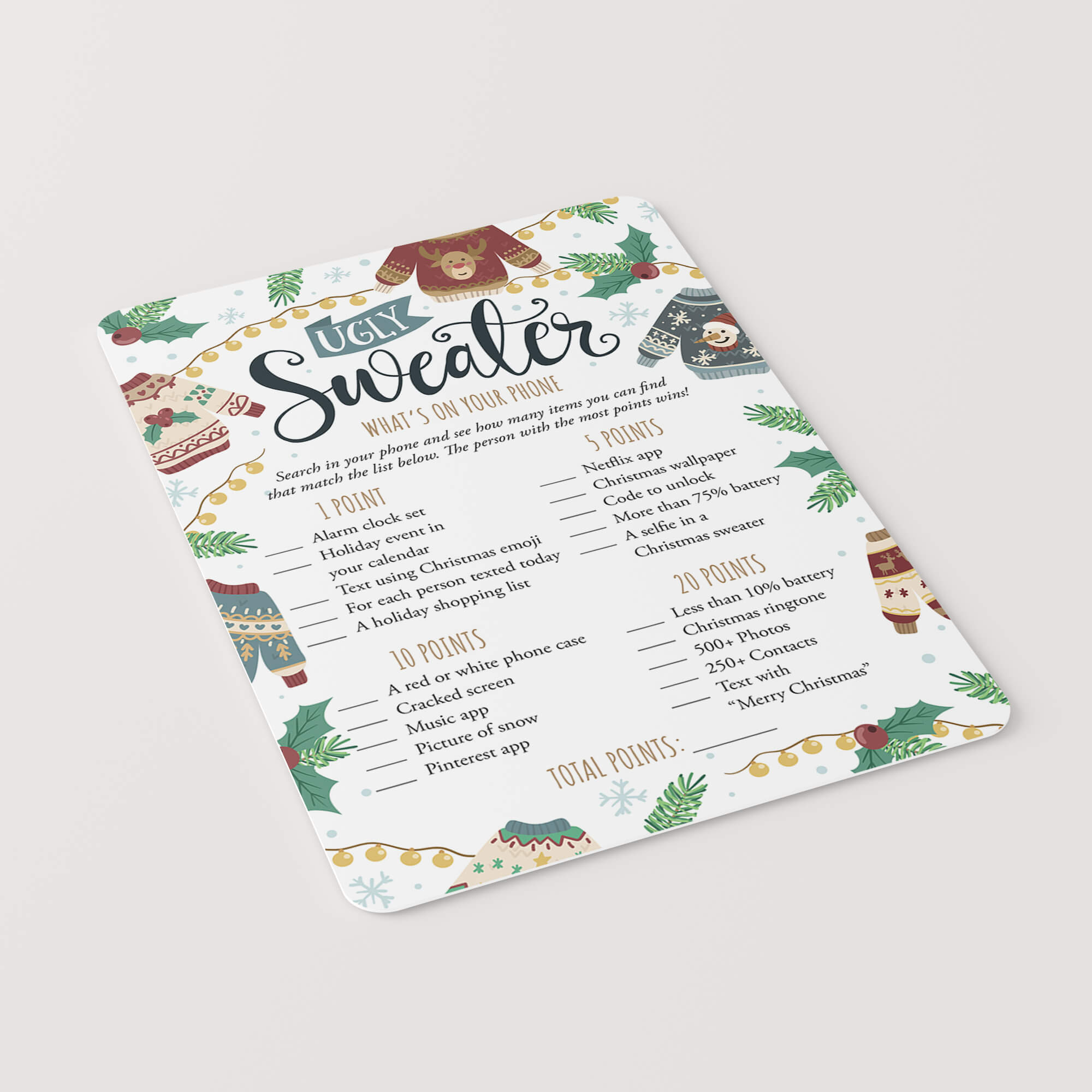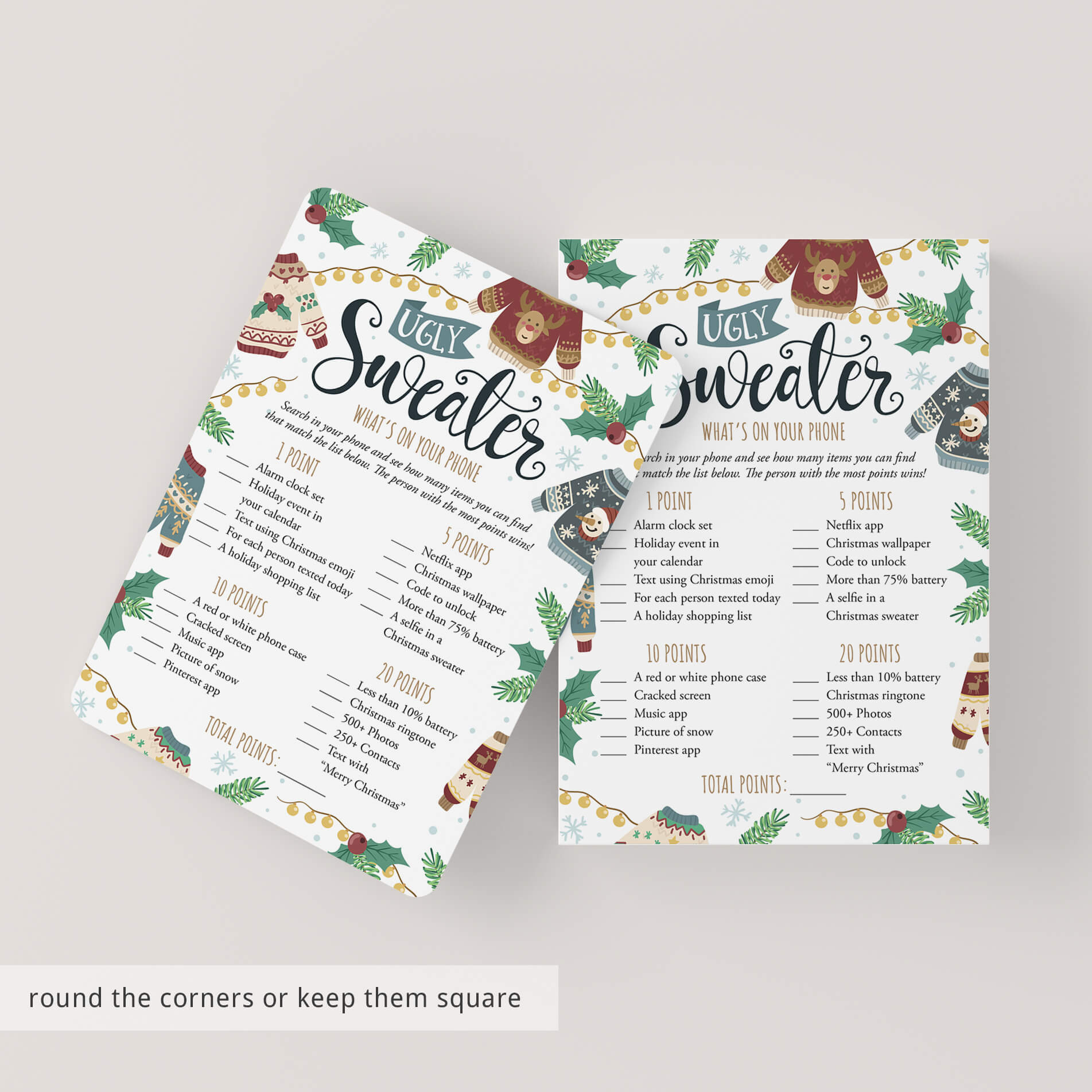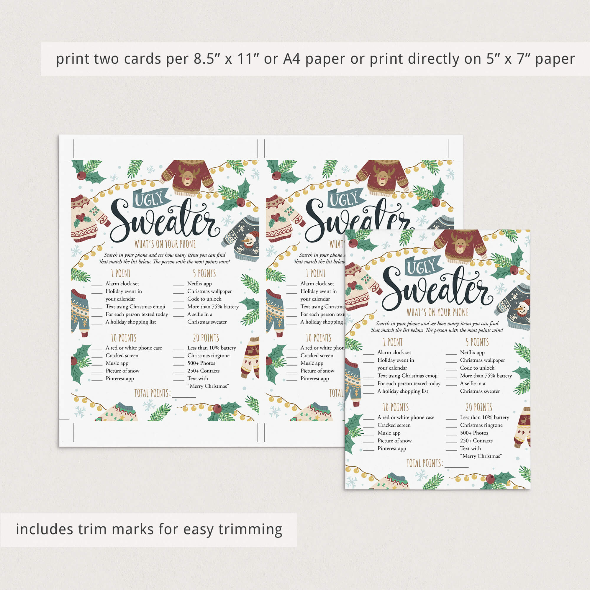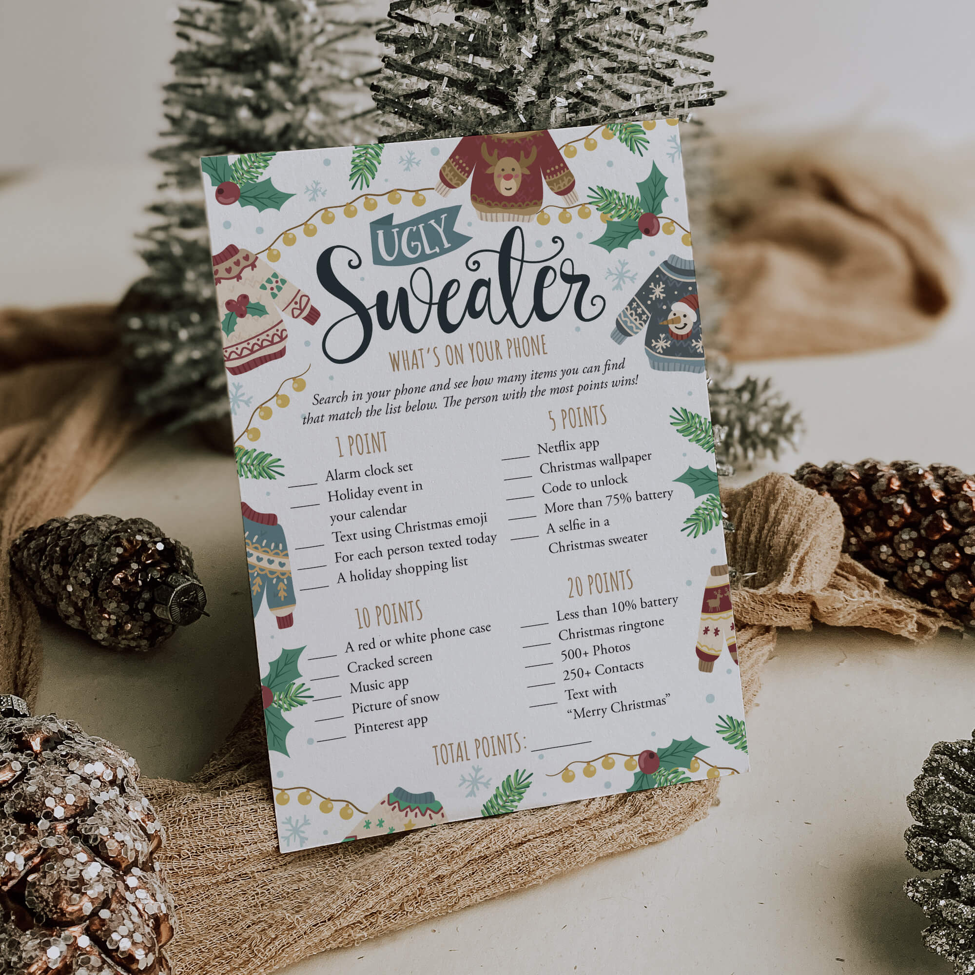 Are you looking for a fun ice breaker game for your Ugly Sweater party? Play What's On Your Phone with these funny game cards with tacky Christmas jumpers. The game is super easy to prepare for and simple to play.