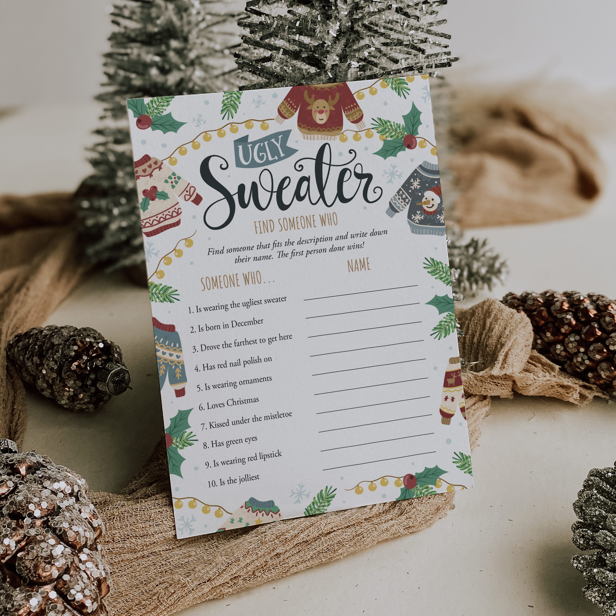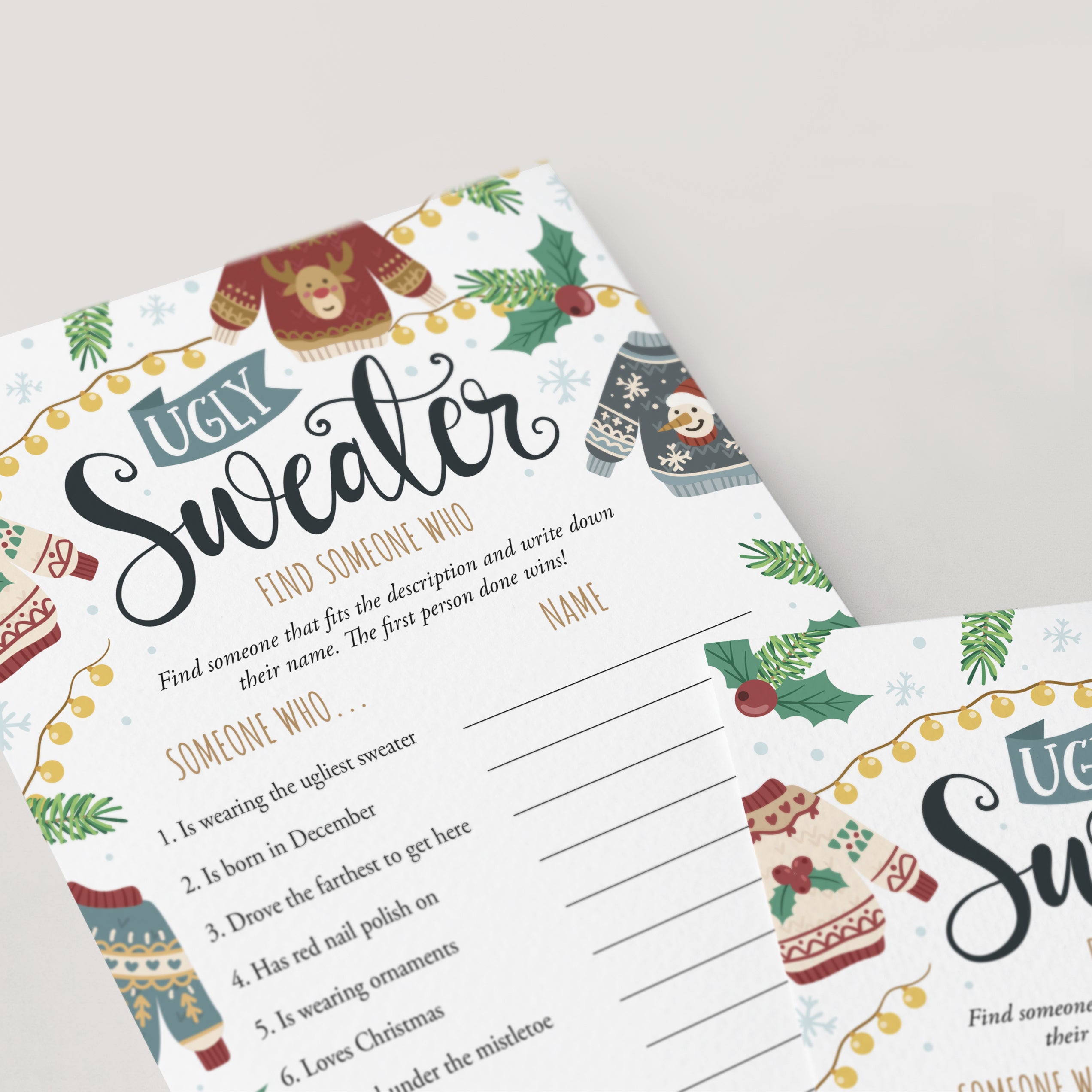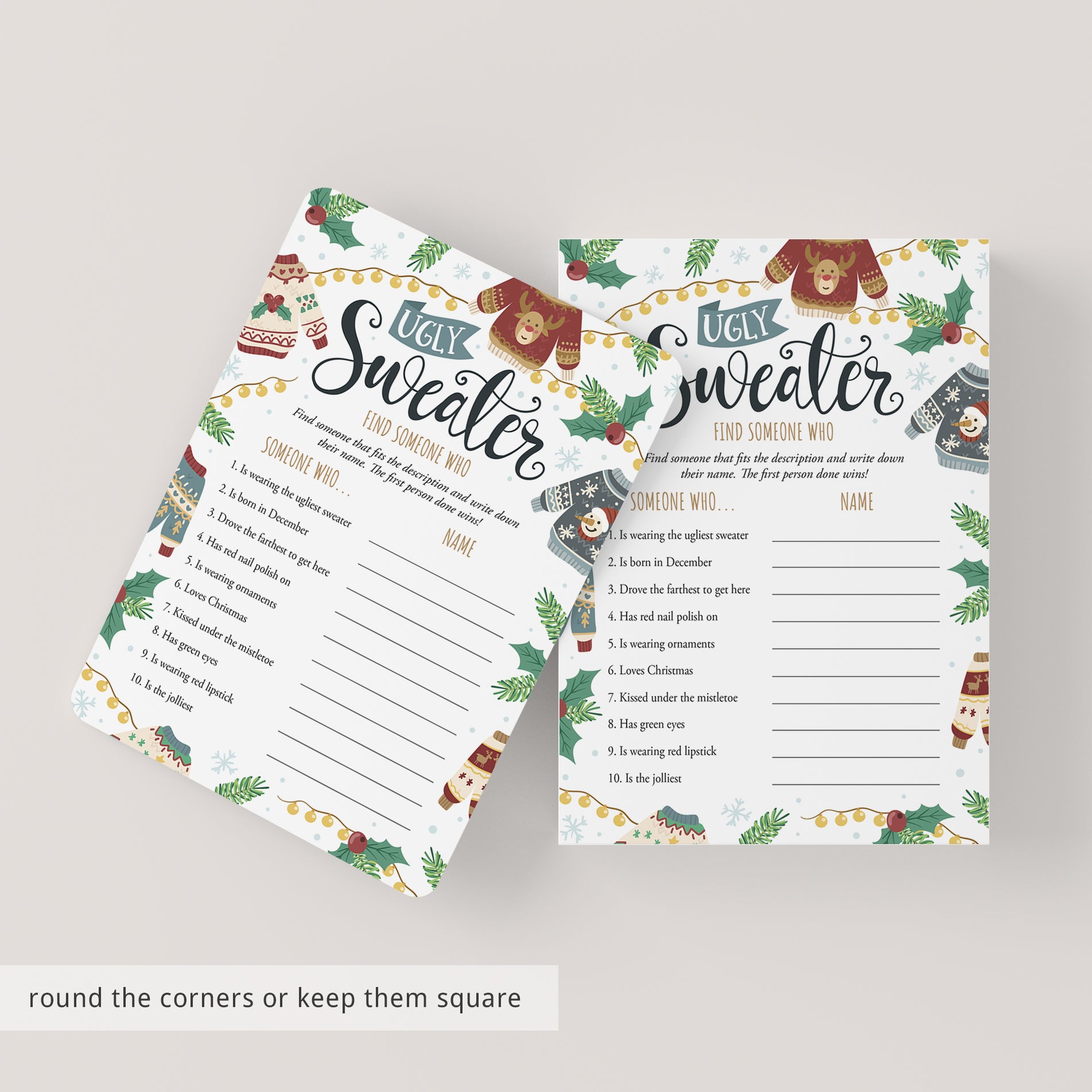 Are you hosting an Ugly Sweater Christmas Party? Make sure your guests jingle and mingle with this funny icebreaker game: Find Someone Who. Let everyone find a person that matches the descriptions. Who is wearing the ugliest sweater? And who has green eyes? The first person done wins.