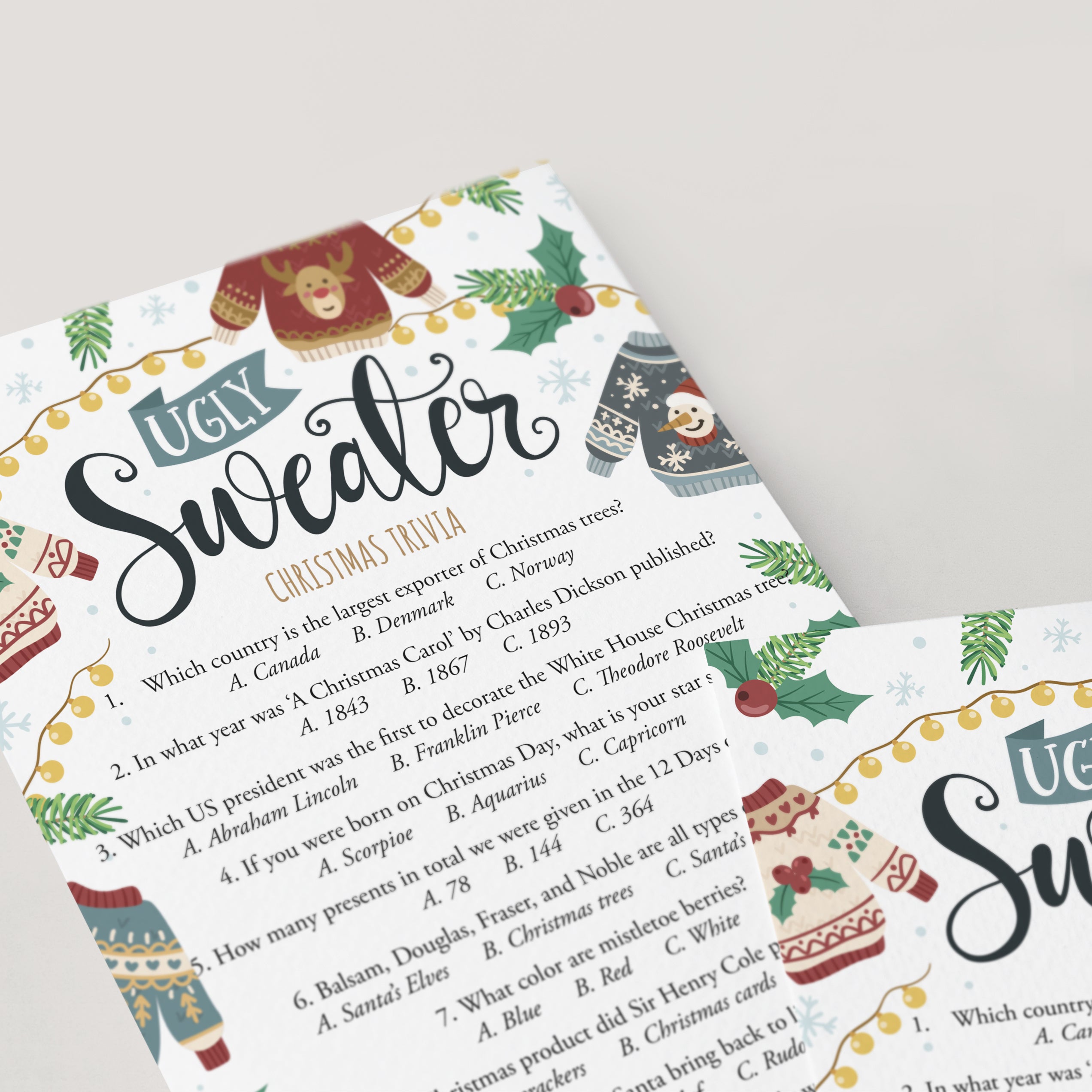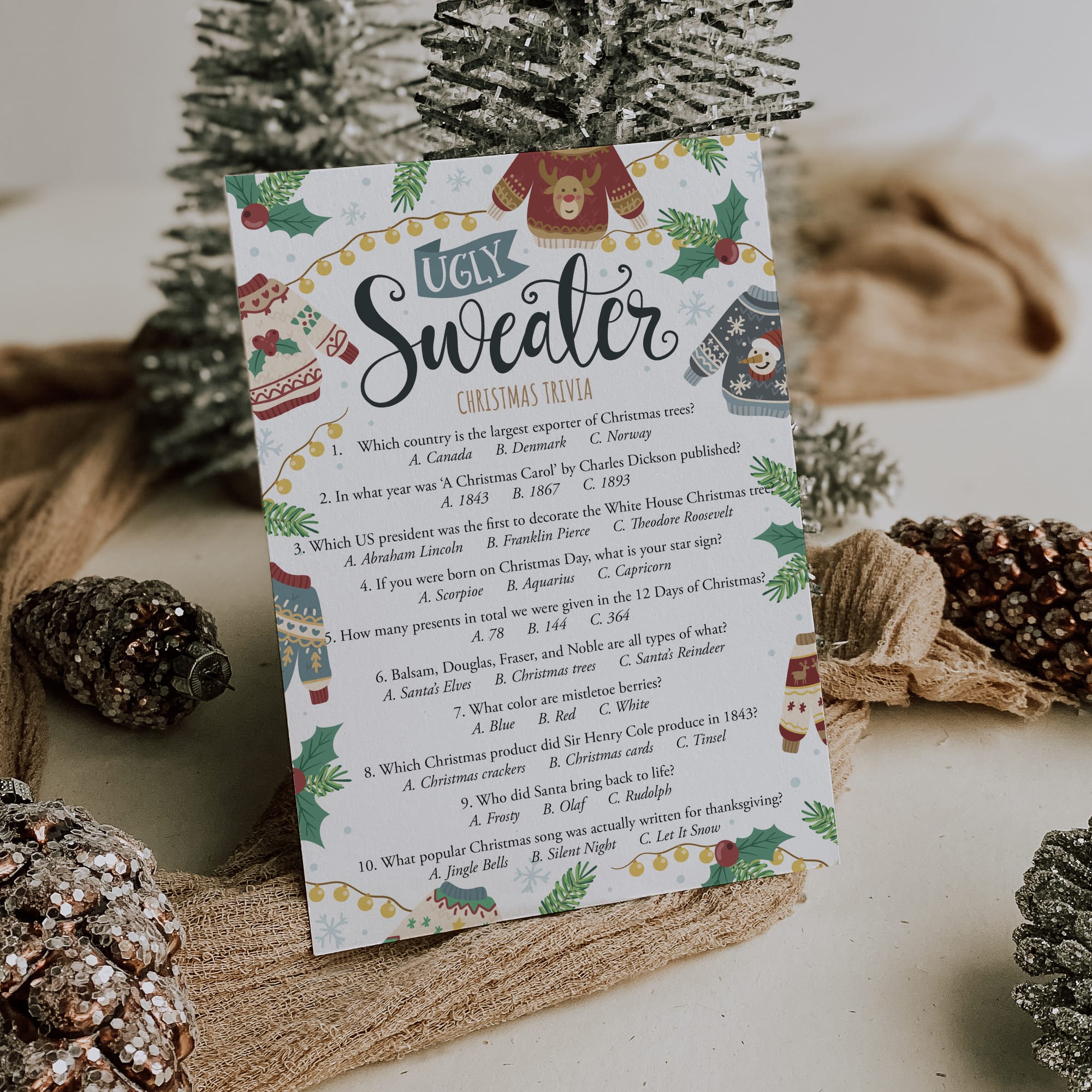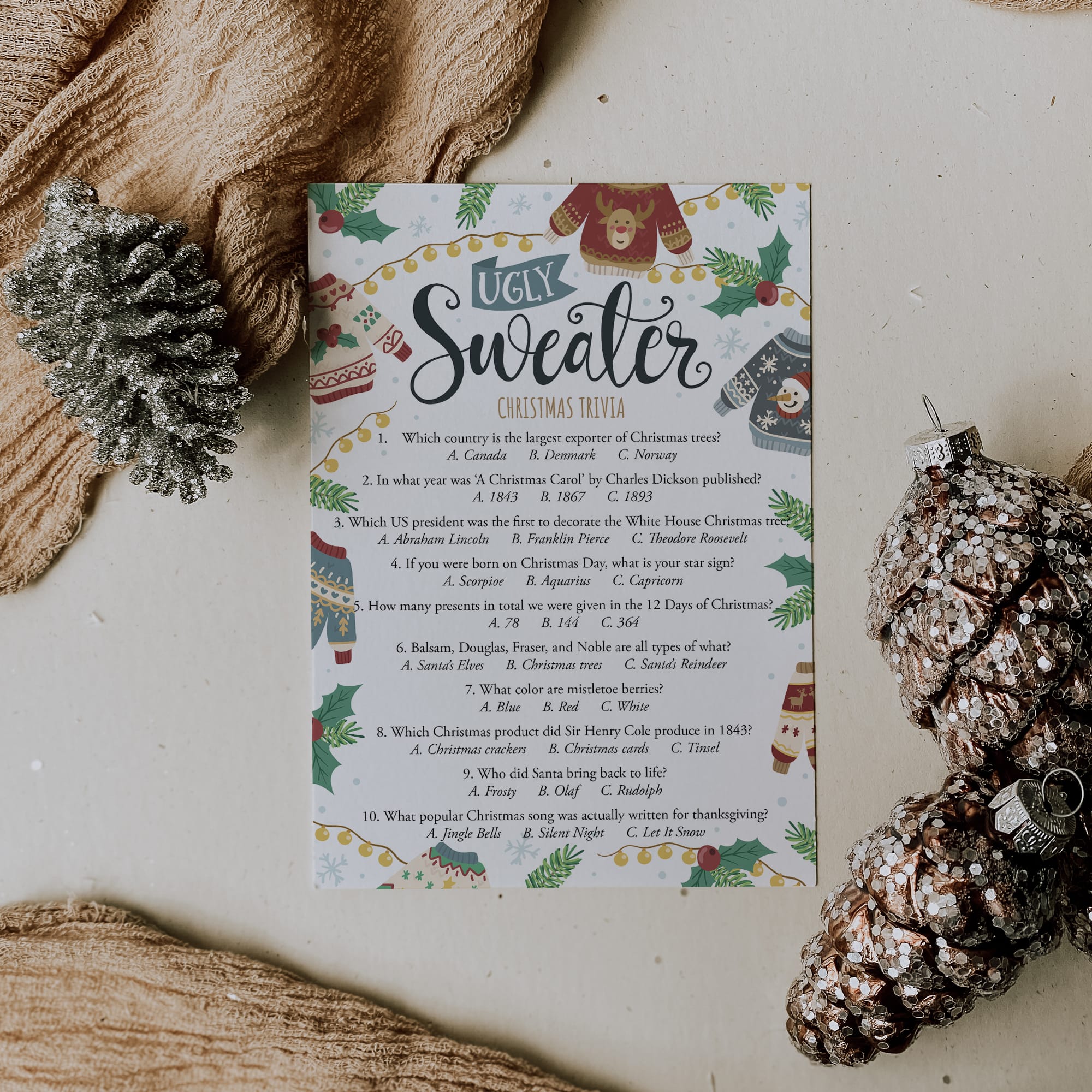 Are you hosting an Ugly Sweater party? Use this fun Christmas Trivia Quiz to test your guests Christmas knowledge. Which country is the largest exporter of Christmas trees? And what popular Christmas song was actually written for Thanksgiving? Play this fun Christmas trivia game to find out! It’s a great challenging game to play at your Ugly Sweater office party or Friendsmas game night.