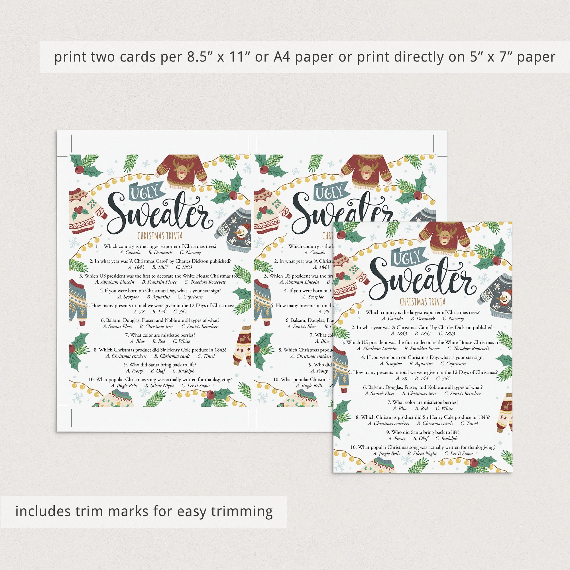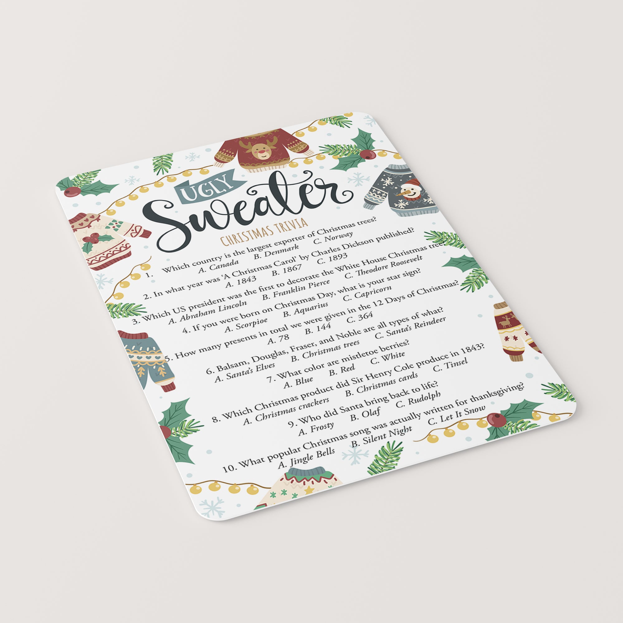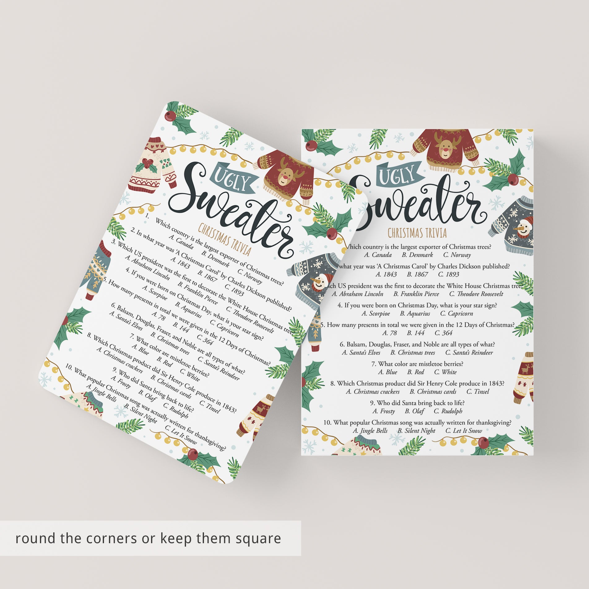 Are you hosting an Ugly Sweater party? Use this fun Christmas Trivia Quiz to test your guests Christmas knowledge. Which country is the largest exporter of Christmas trees? And what popular Christmas song was actually written for Thanksgiving? Play this fun Christmas trivia game to find out! It’s a great challenging game to play at your Ugly Sweater office party or Friendsmas game night.