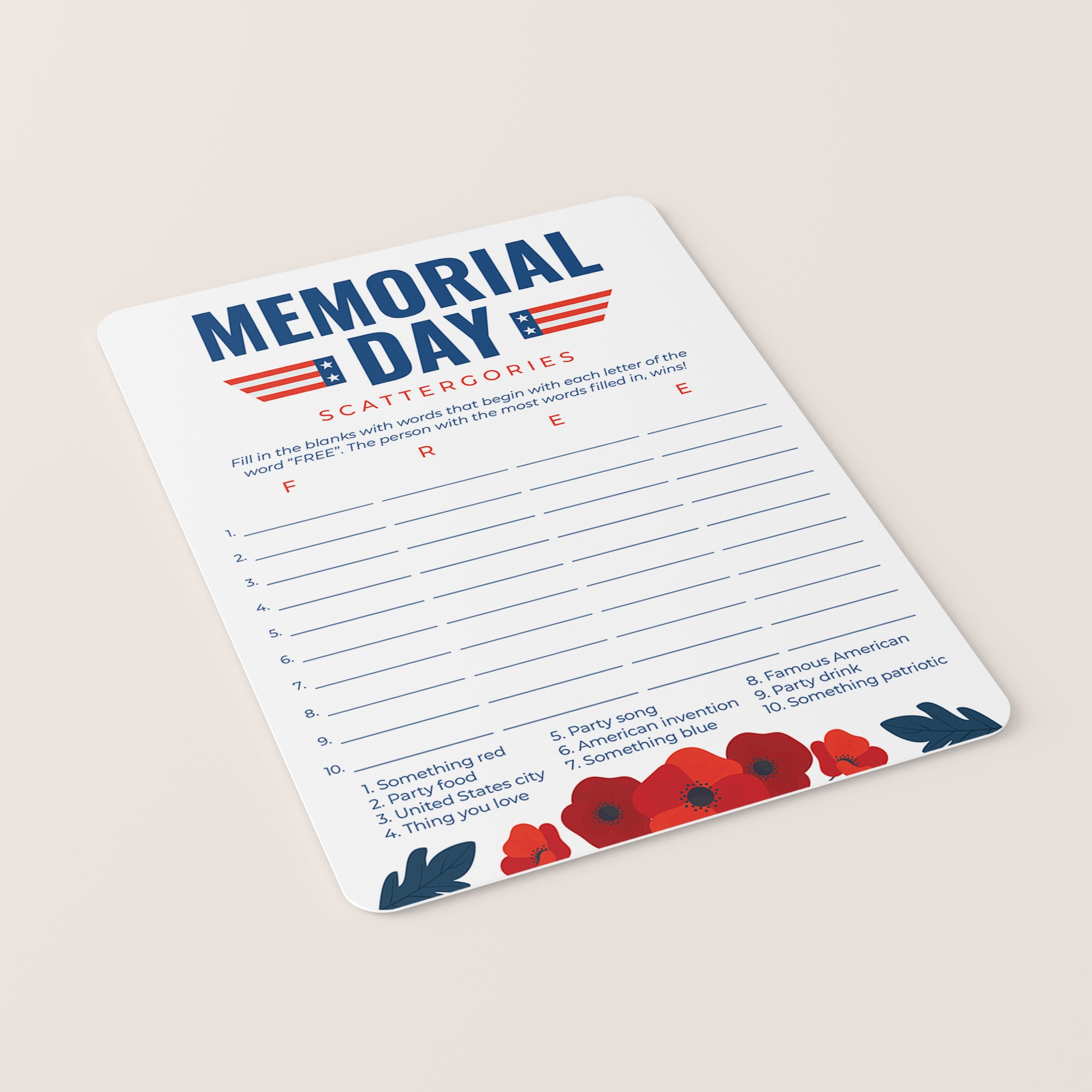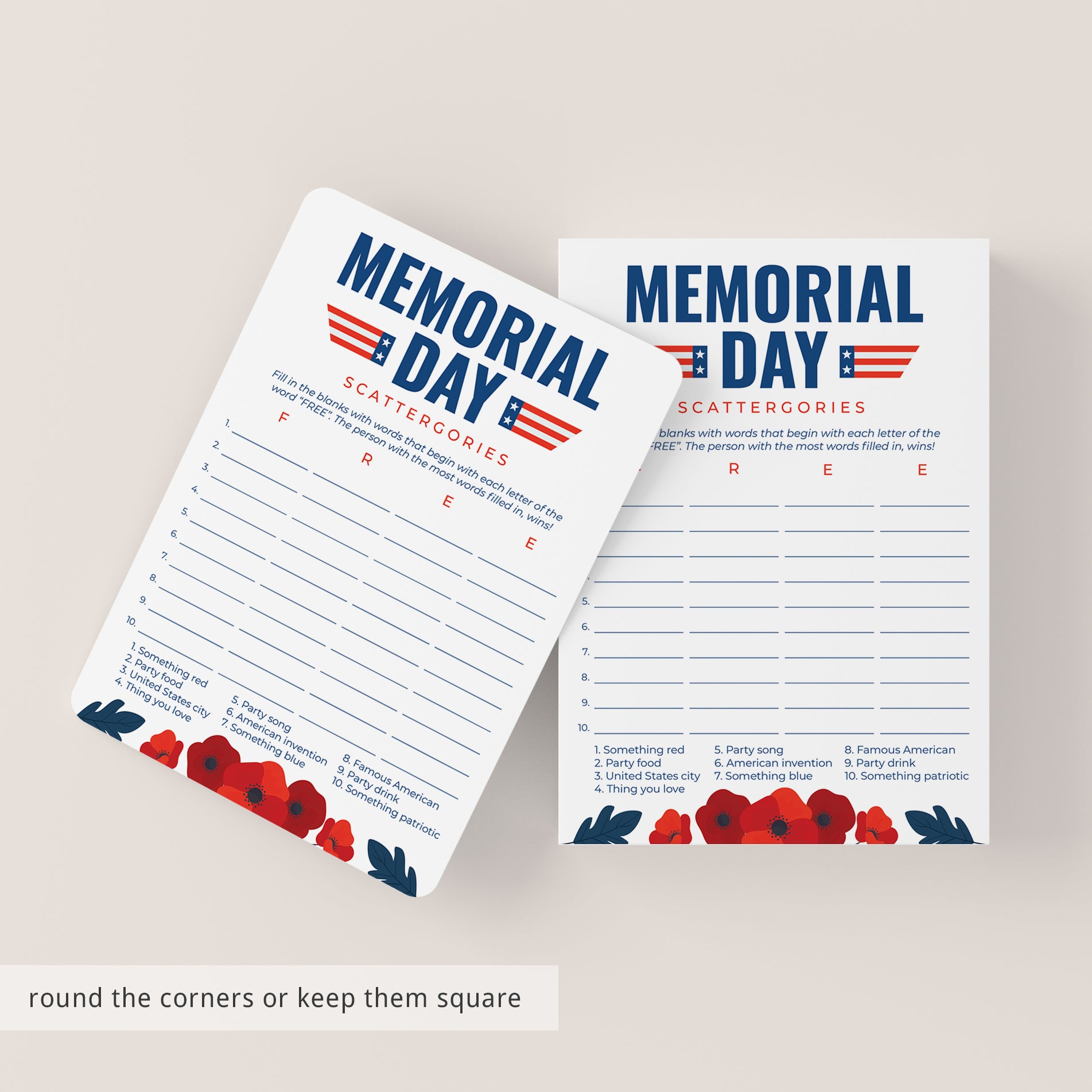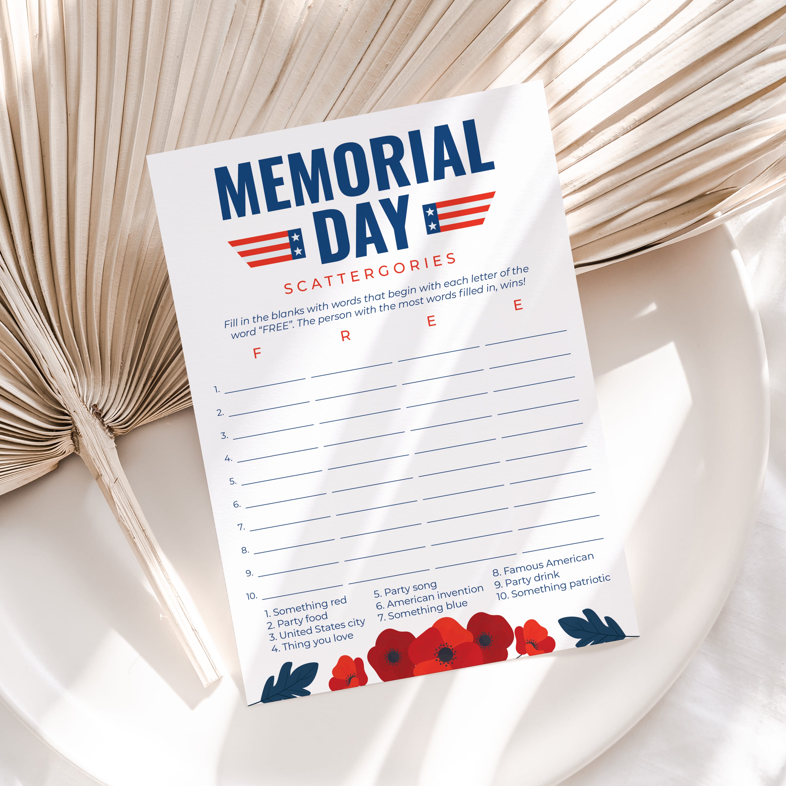 The game is very easy to play. Simply hand out this Memorial Day game with red poppies to your friends and family. They will have to come up with as many words related to the USA categories at the bottom of the sheet. The difficulty is that the words must begin with the letters in the word "FREE". The person that gets the most answers filled in within the set time, wins!