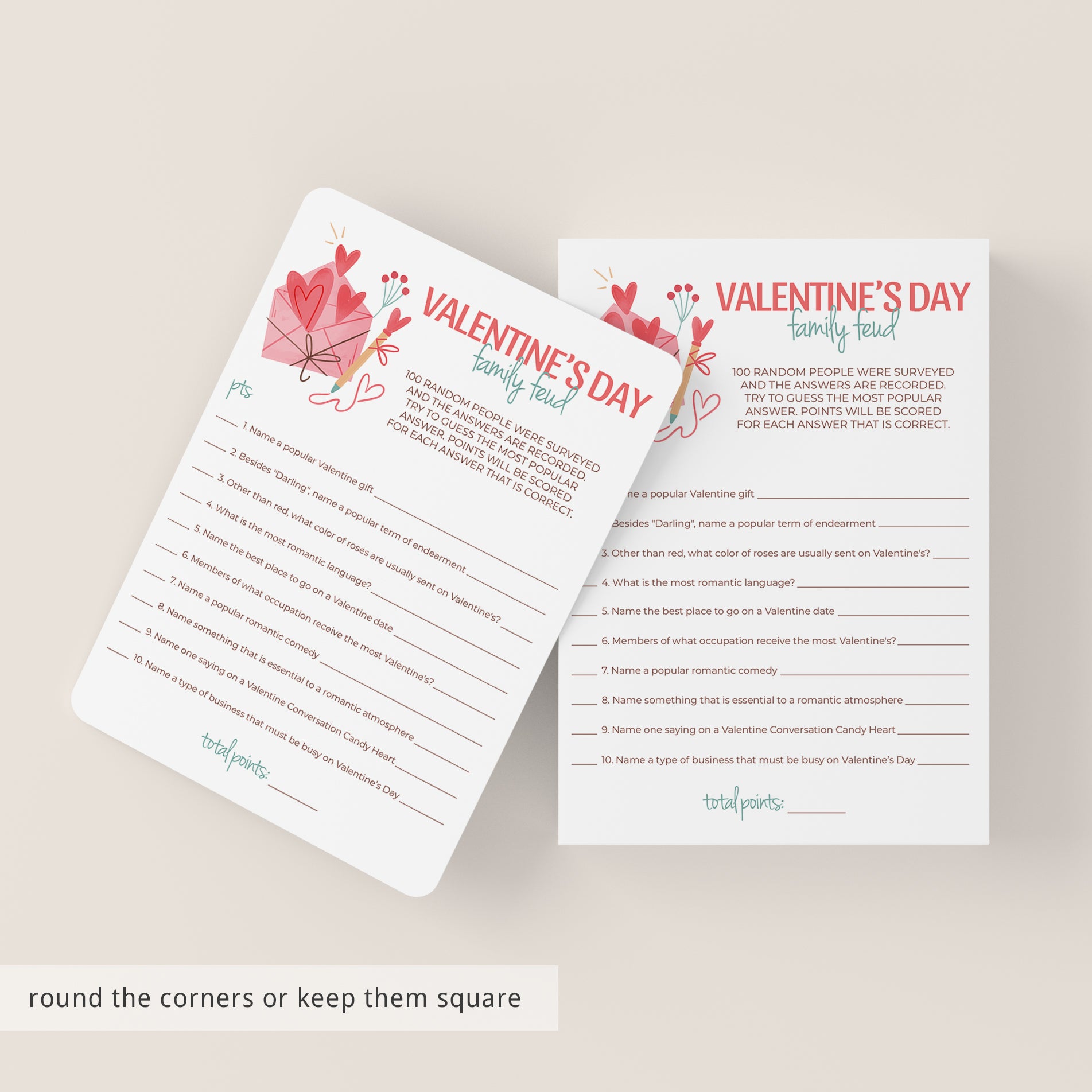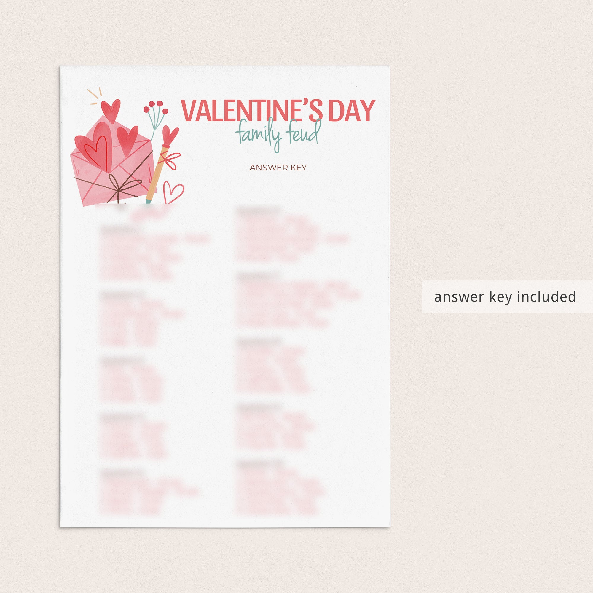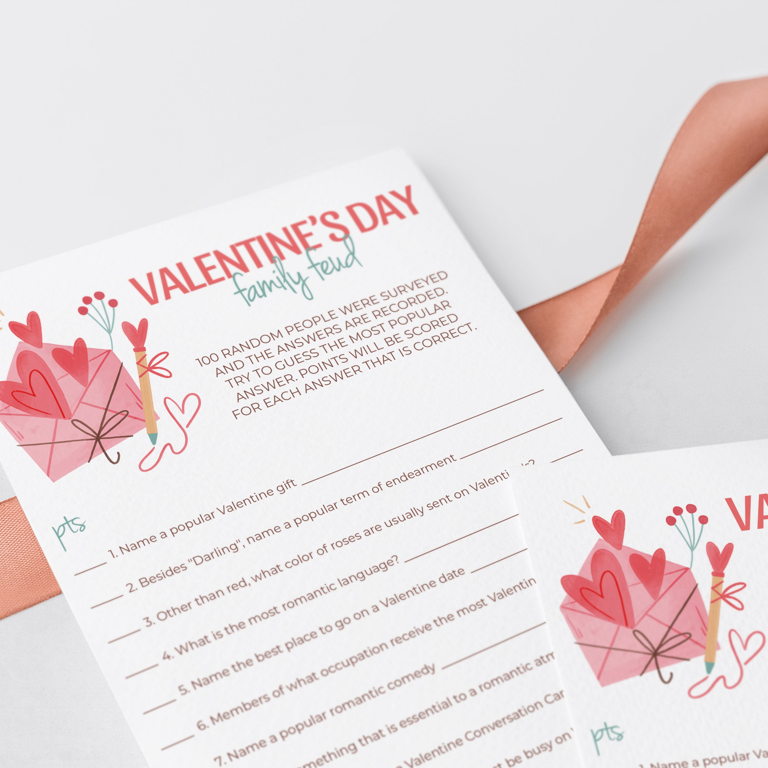 Family Feud is one of the best game shows ever. Have your friends and family compete to guess the most popular answer to random Valentine's Day themed family feud questions. An answer key with the Valentine's Day family feud answers and points is included. The person or team with the highest score wins!
