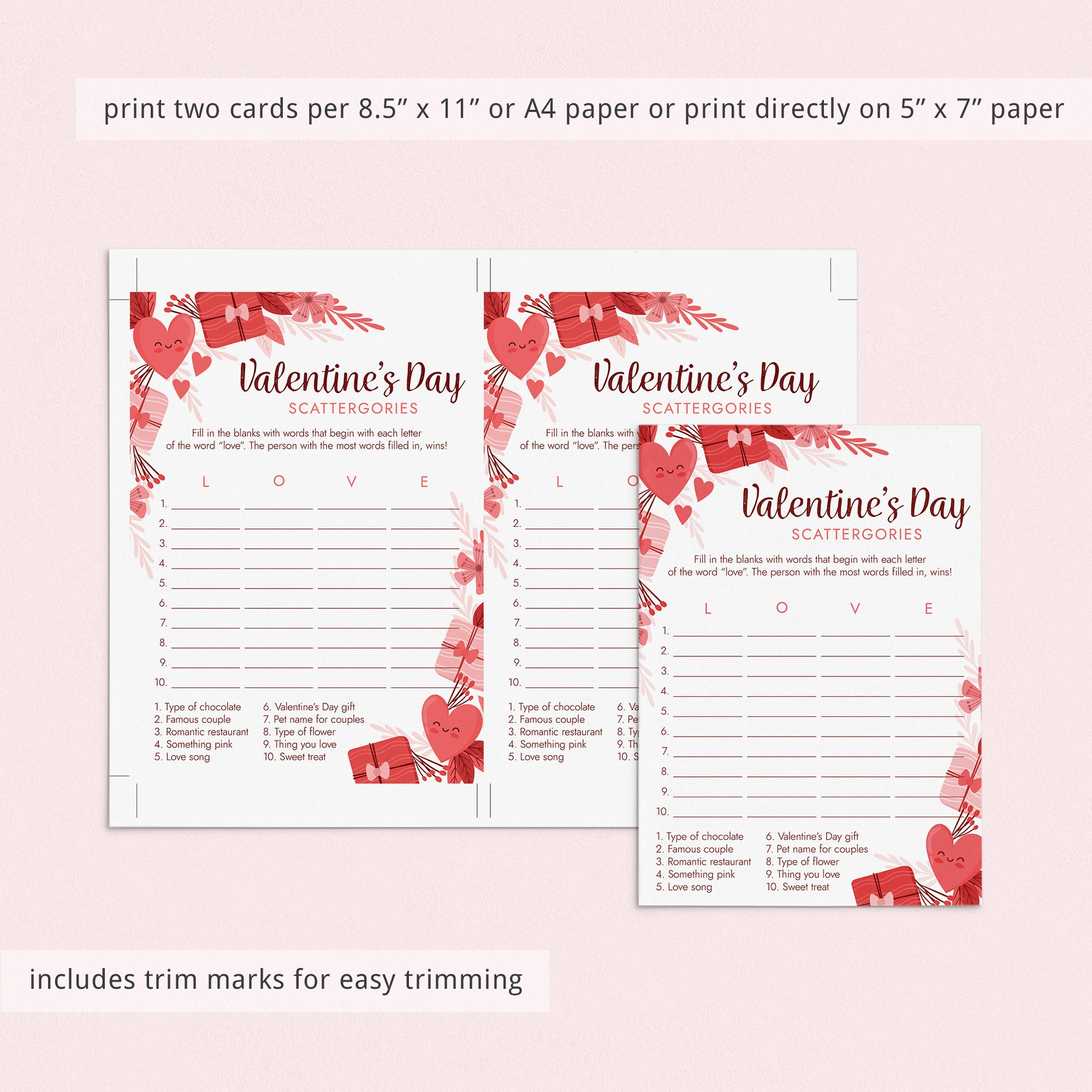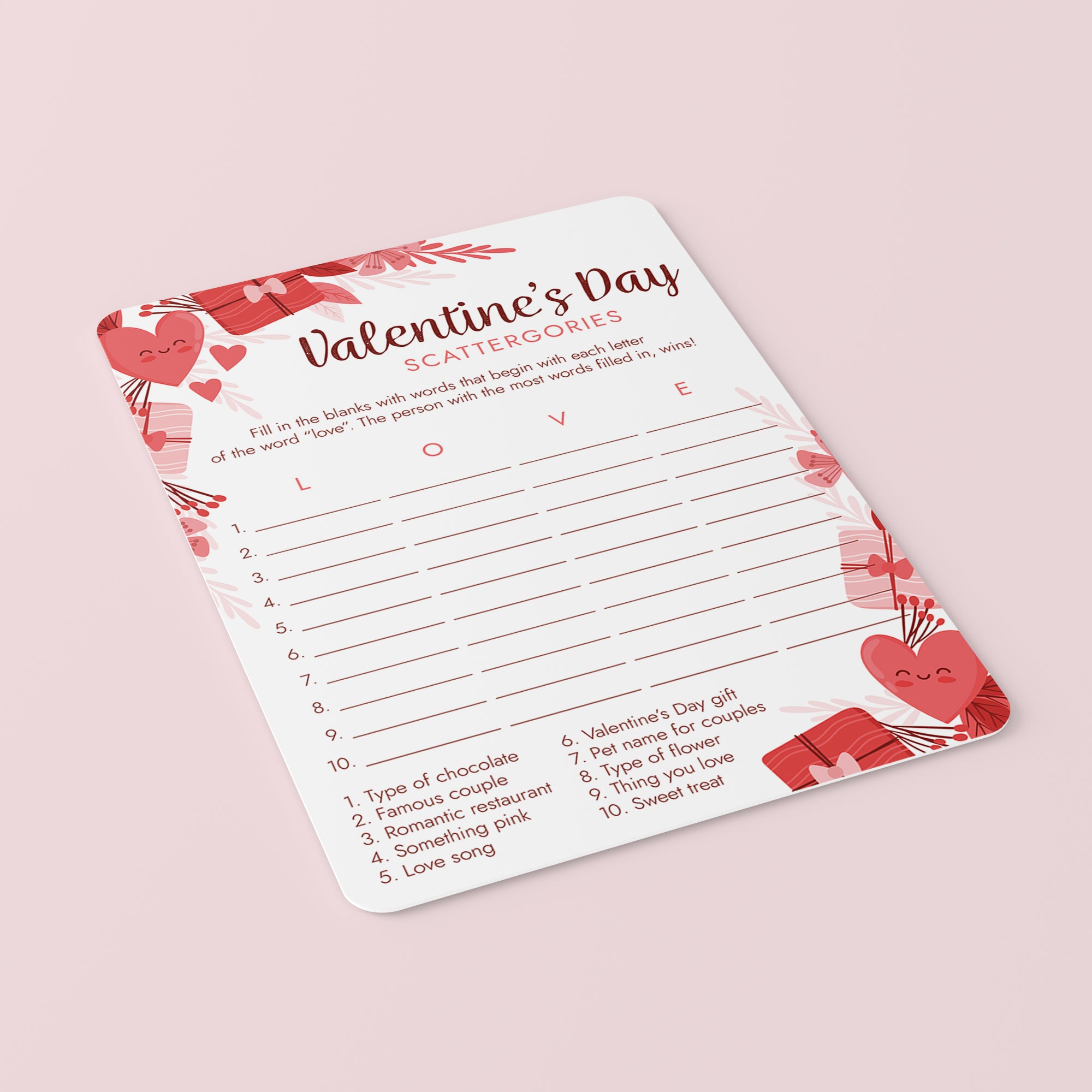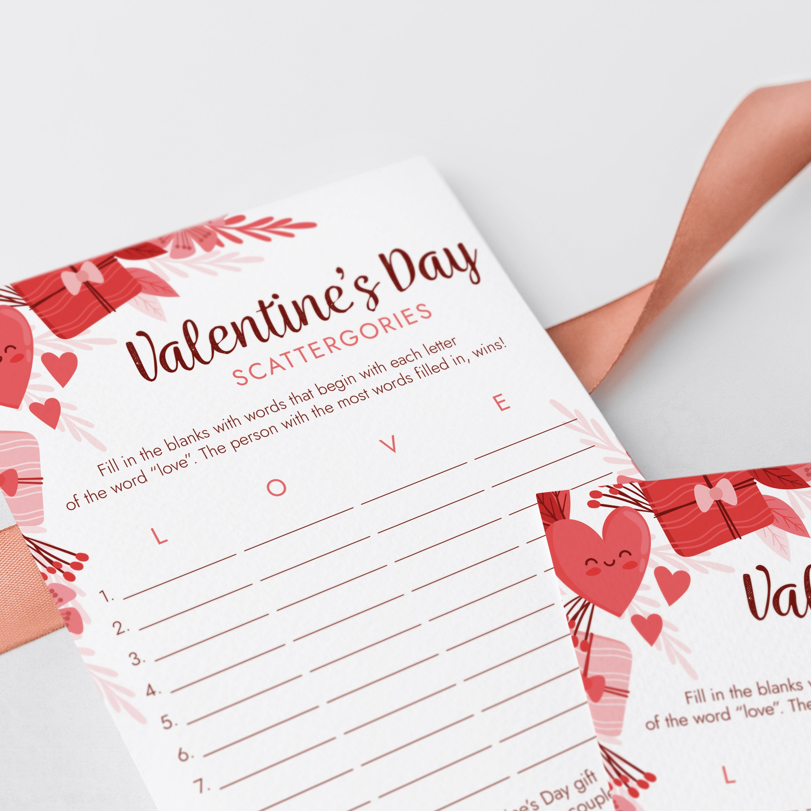 How many words can you fill in with the letters "L", "O", "V" and "E"? Play Valentine's Day Scattegories with this romantic game card. It's a great Valentine's Day game for couples. Lots of fun and laughter guaranteed.