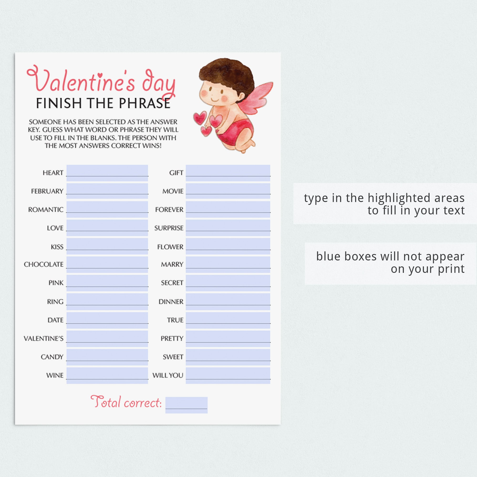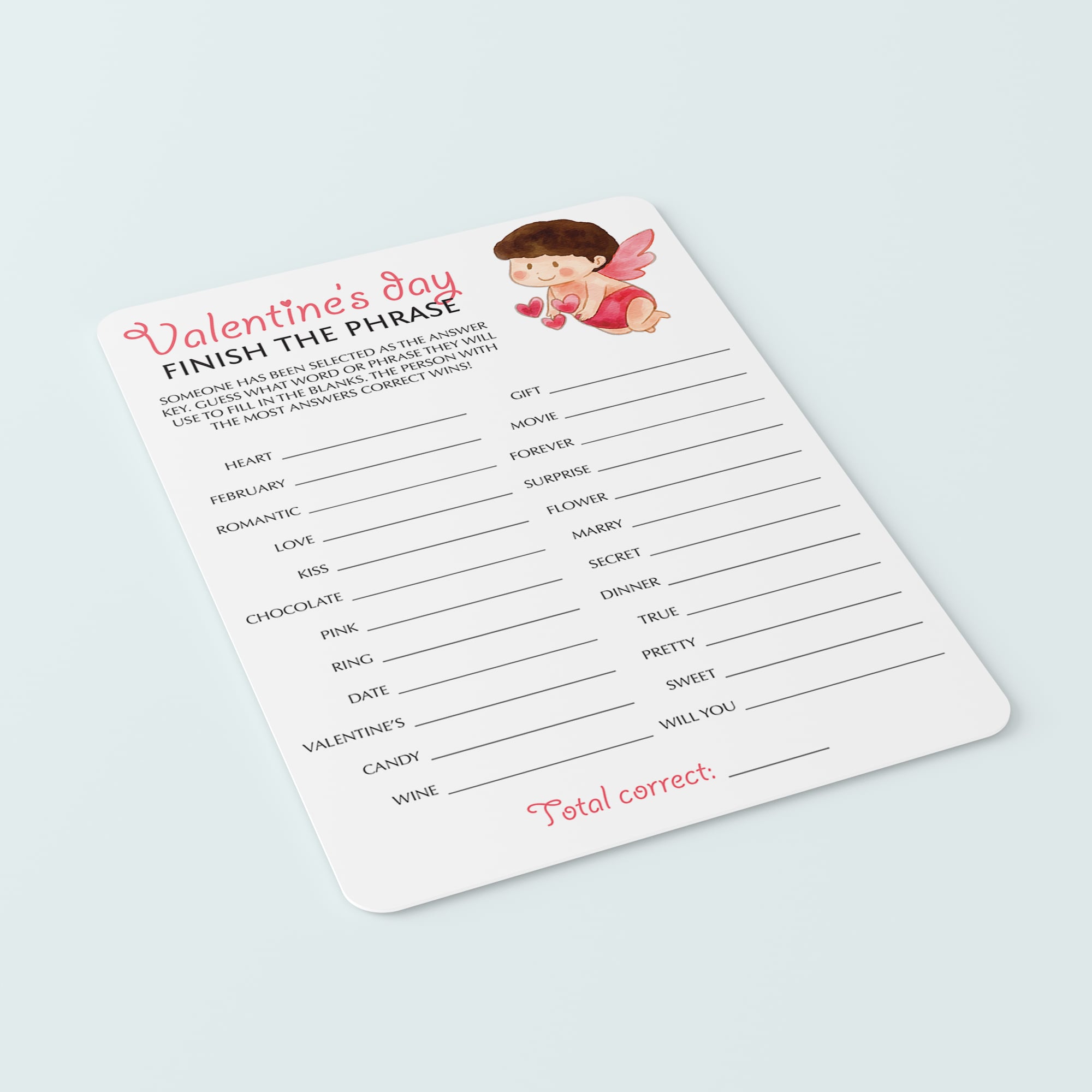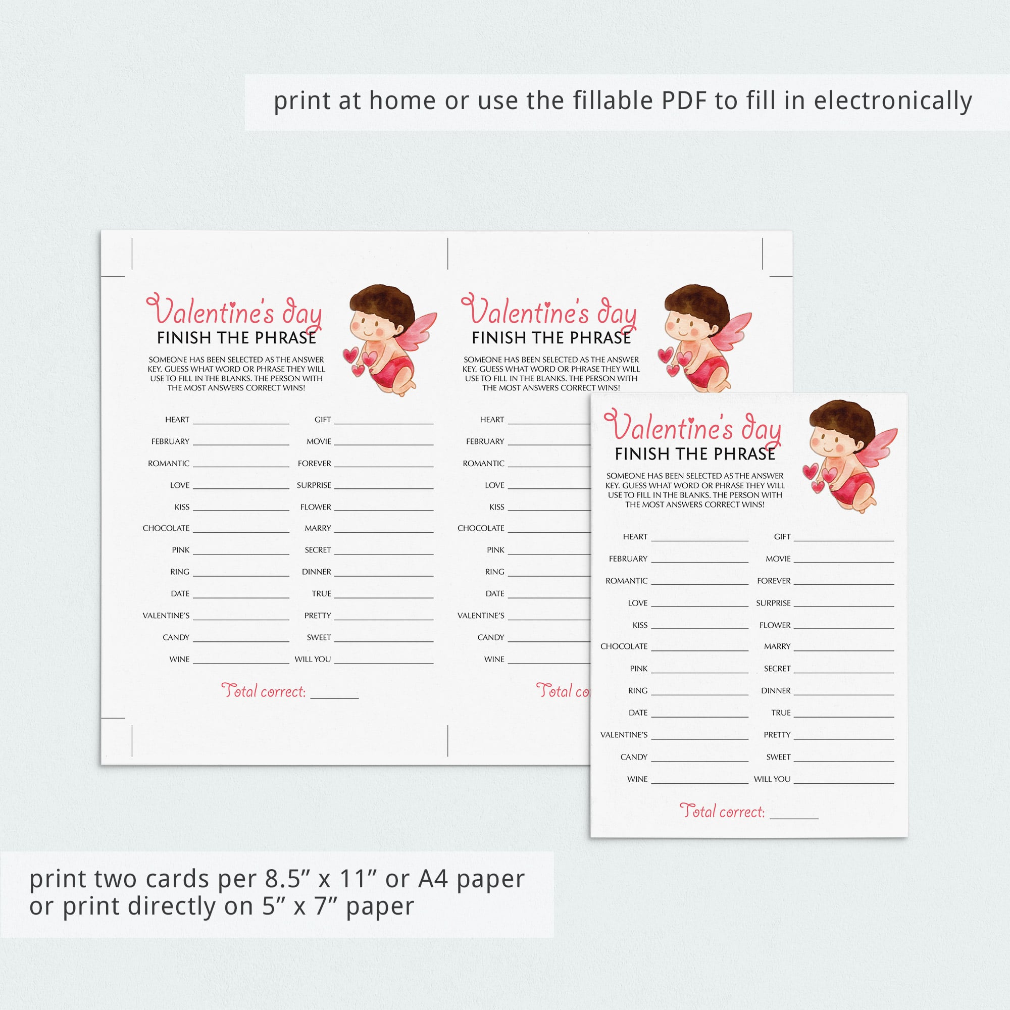 For an in-person Valentine's Day party, download and print these cute Finish The Phrase game cards with watercolor cupid as many times as you need. We recommend printing on a nice heavy card stock for highest quality feel. Print right from your computer in a matter of minutes or have the cards printed at your favorite print shop.