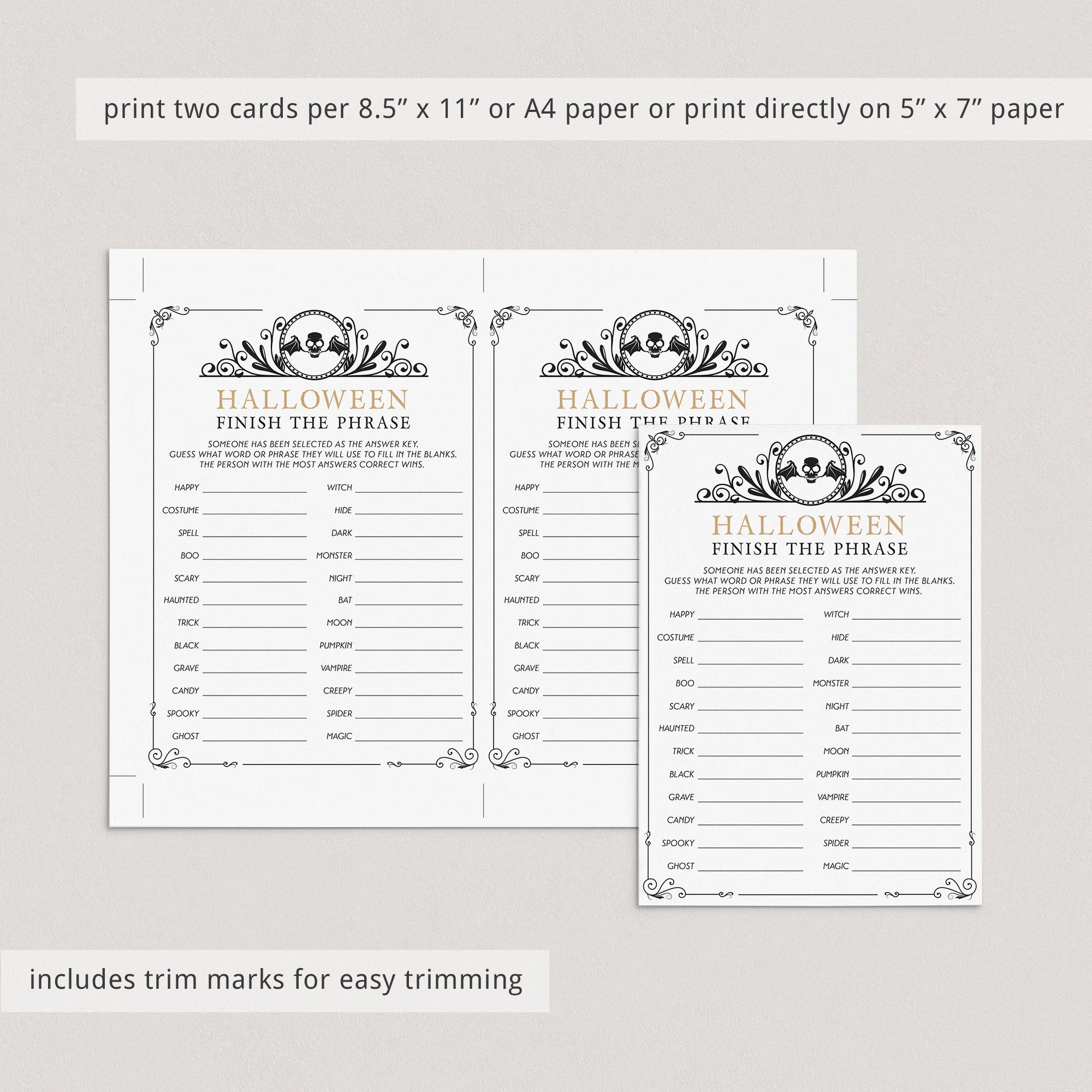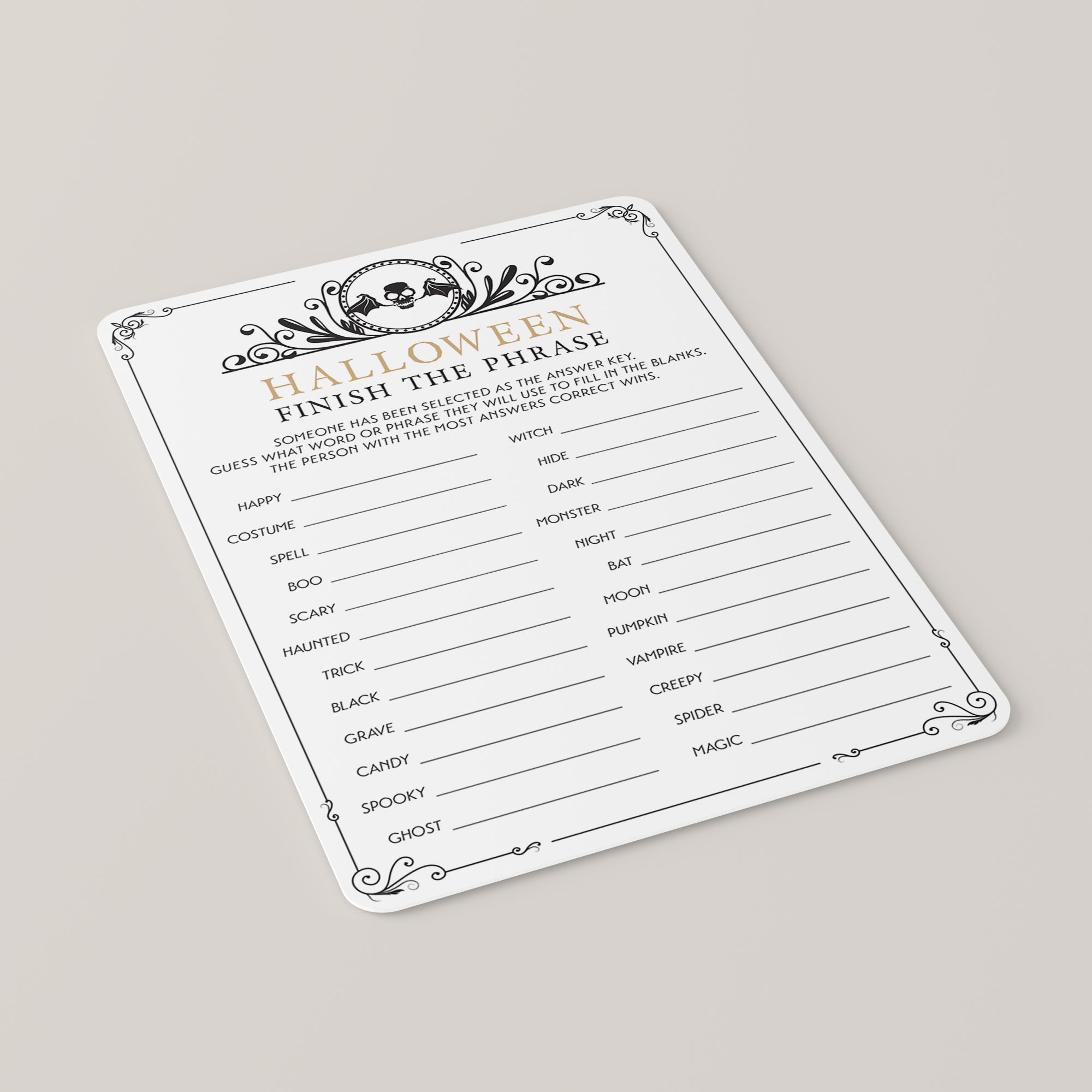 Finish The Phrase is a great ice breaker game for your Halloween party. It is a fun activity for Halloween office parties and very easy to play. This Vintage Halloween party game with black skull and gold details is the perfect addition to a vintage theme Halloween bash.