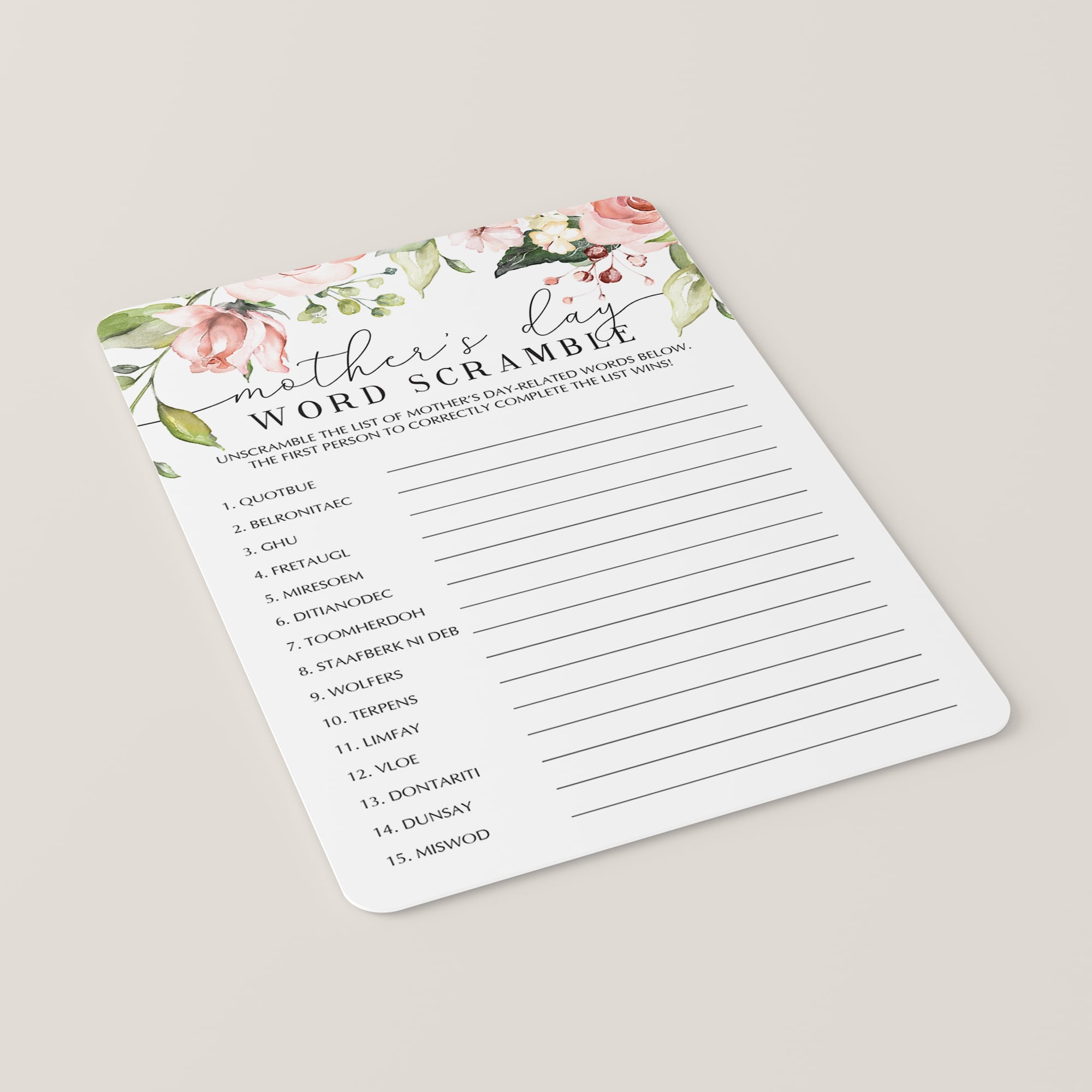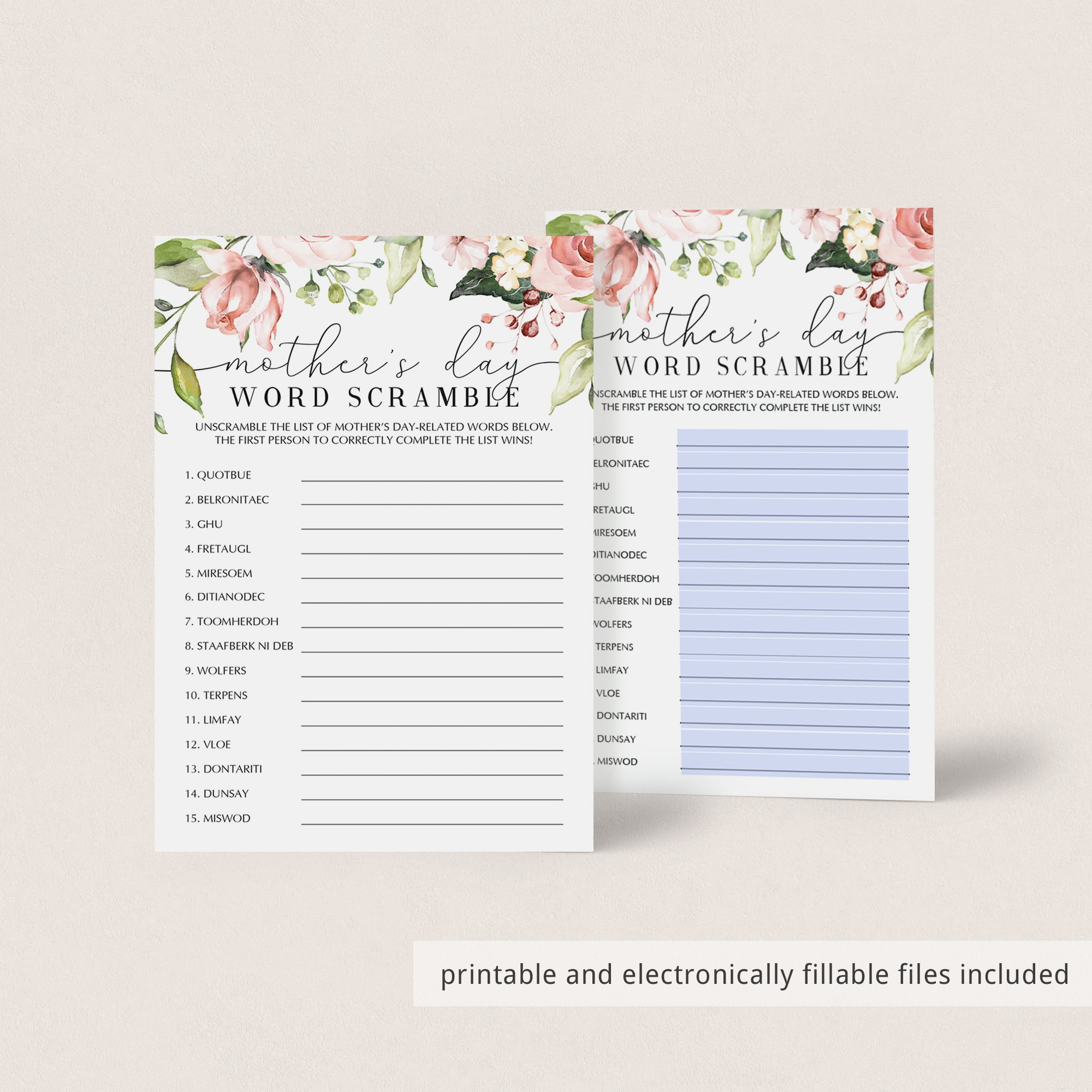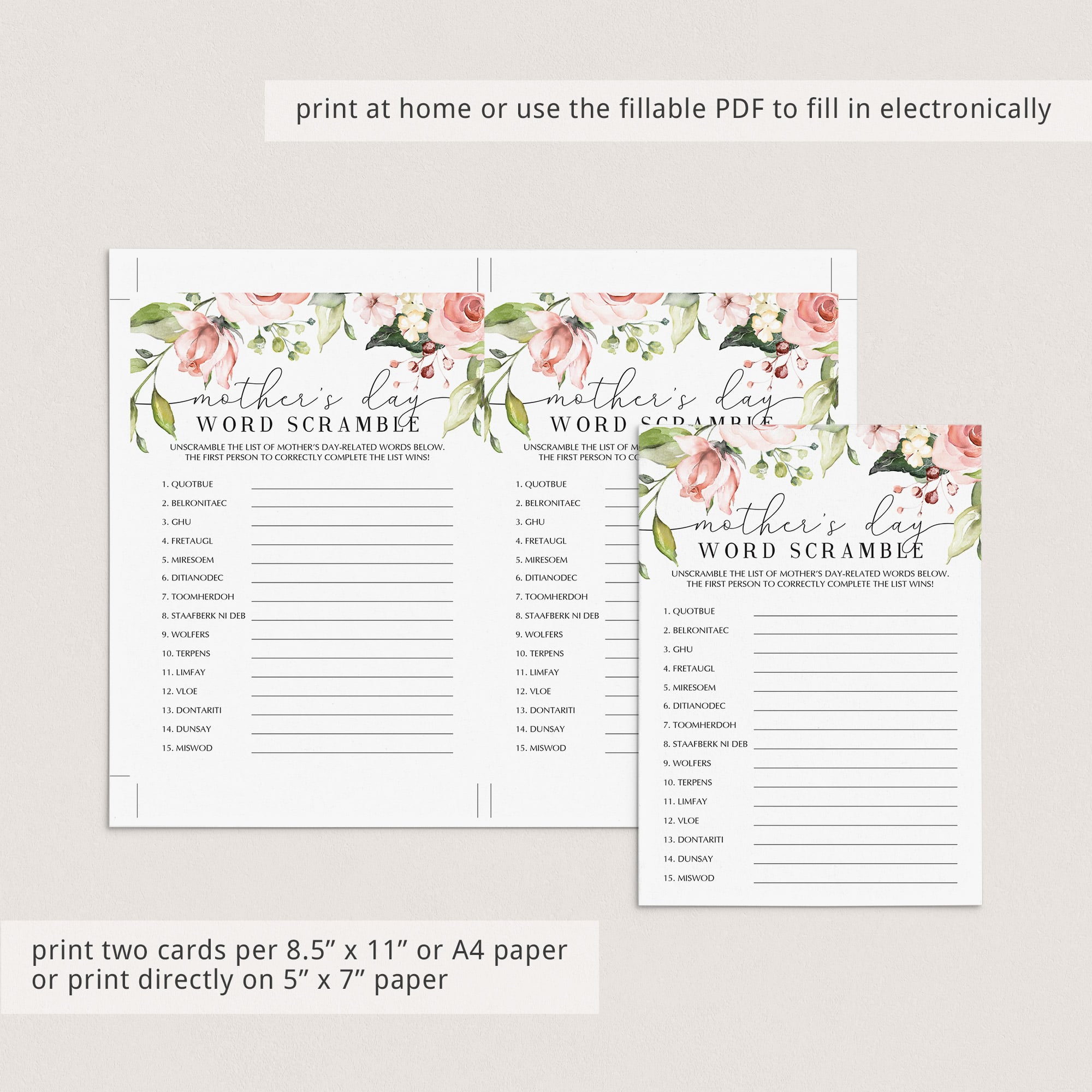 Are you looking for fun (virtual) Mother's Day game? Play Mothers Day Word Scramble with this gorgeous blush floral game card. This Mother's Day game is fun for all ages.