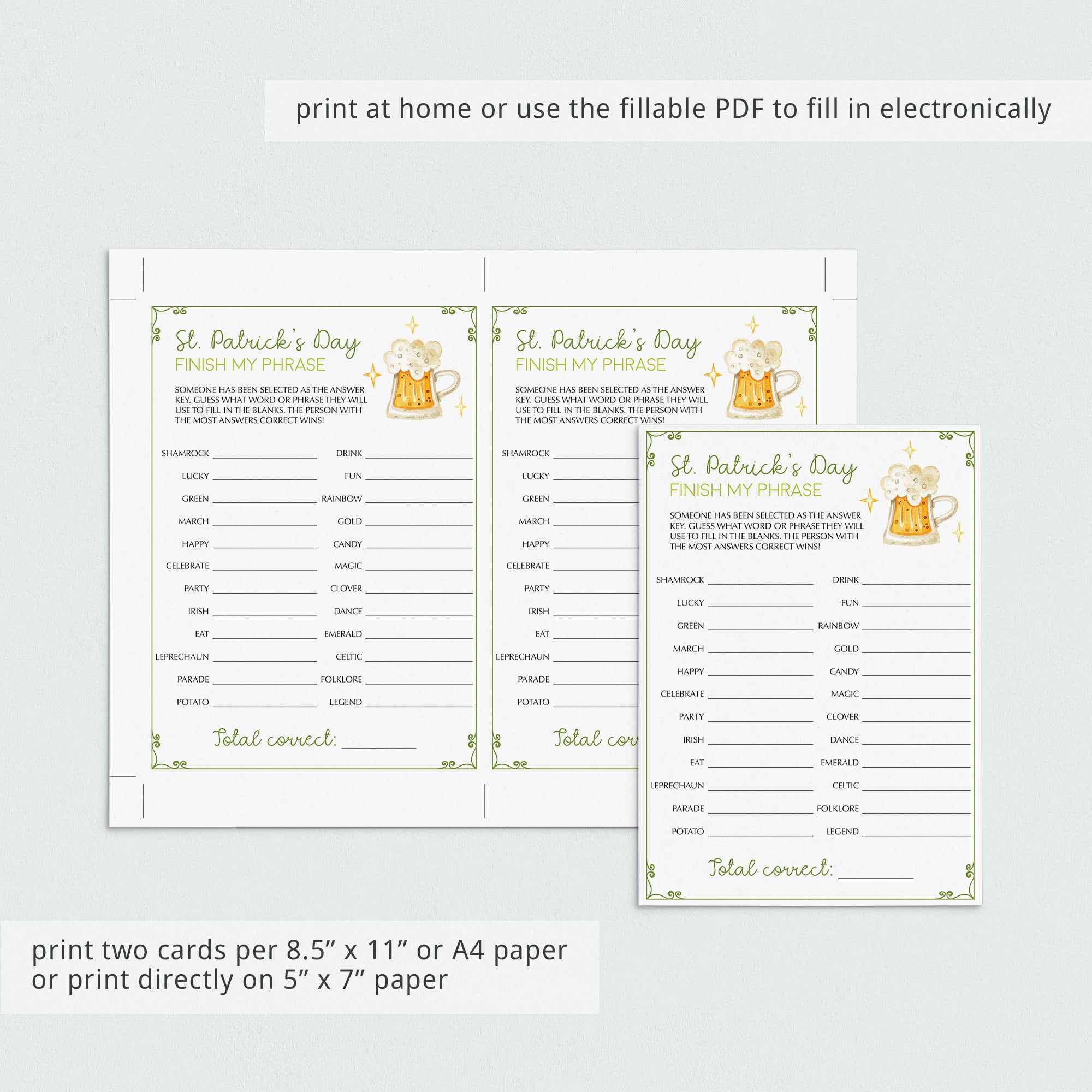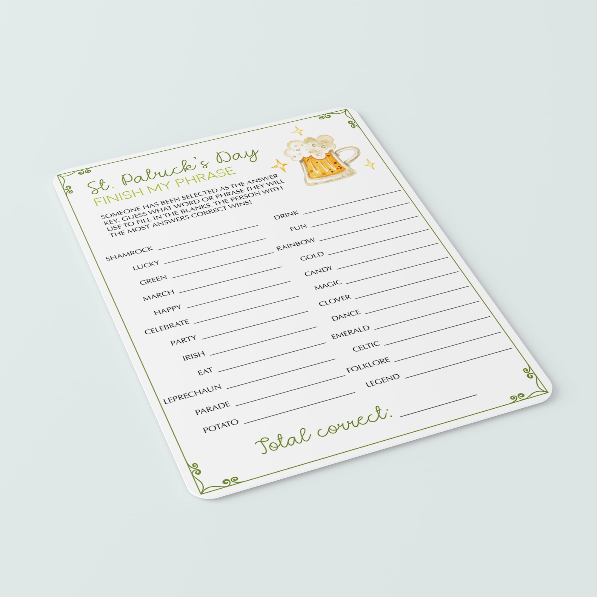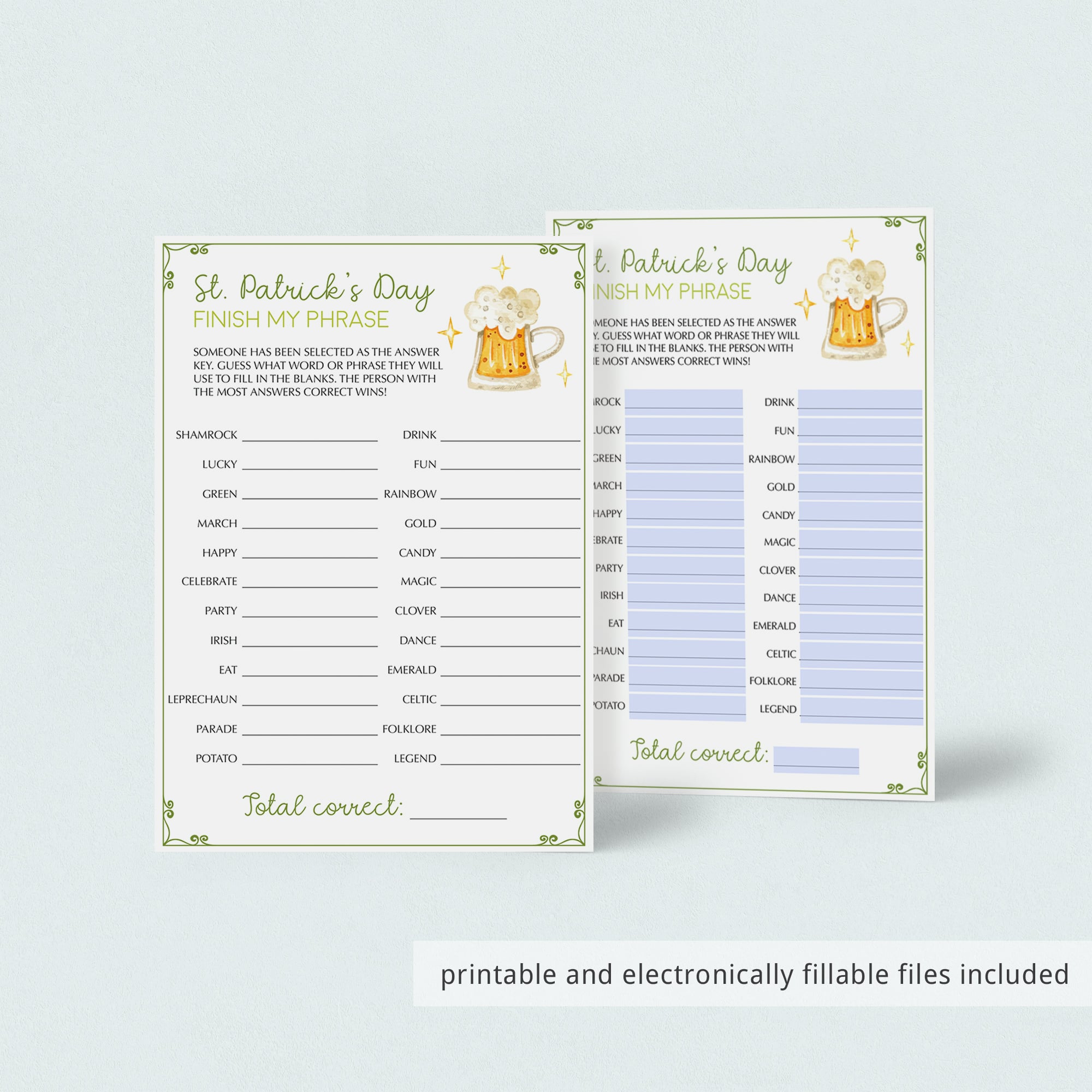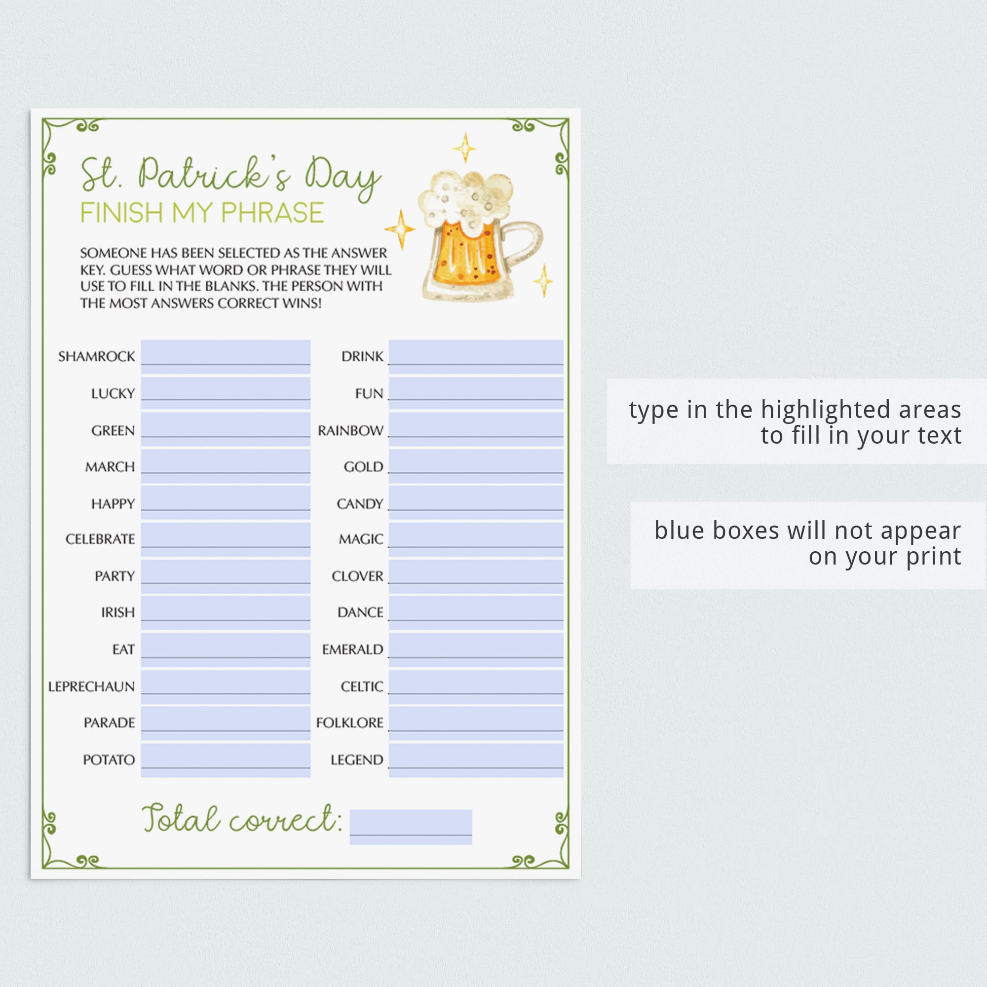 St. Patrick's Day Finish My Phrase is a great game to play with large groups. It is a fun activity for office parties and very easy to play. Printable and electronically fillable PDF templates to play online are included.
