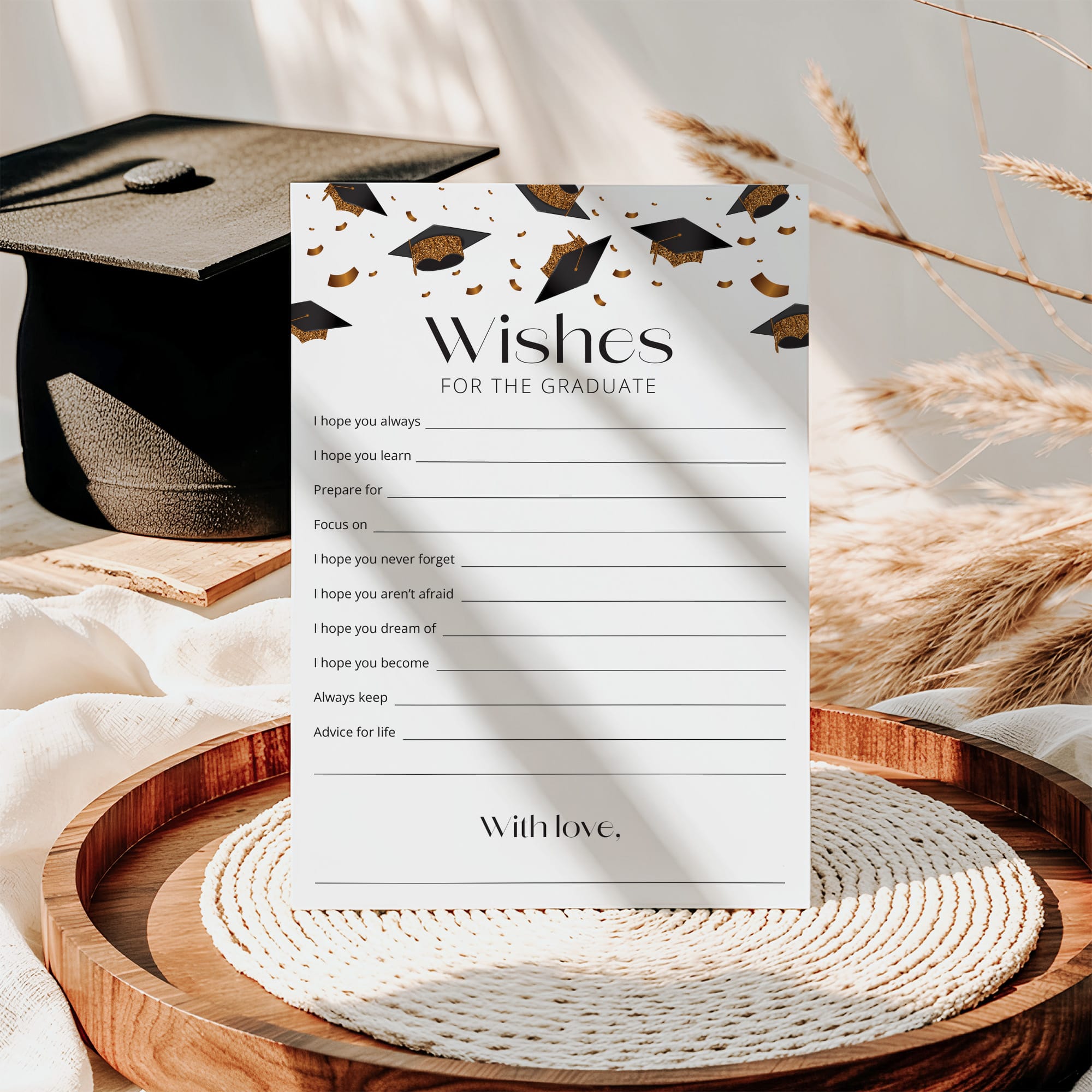 Create an amazing keepsake for the graduate with these black and gold graduation wishes and advice cards. The cards with black and gold tossing graduation caps and confetti will fit any graduation party theme. Let every guest write down their wishes and advice for the graduate and collect the cards for the lucky boy or girl.
