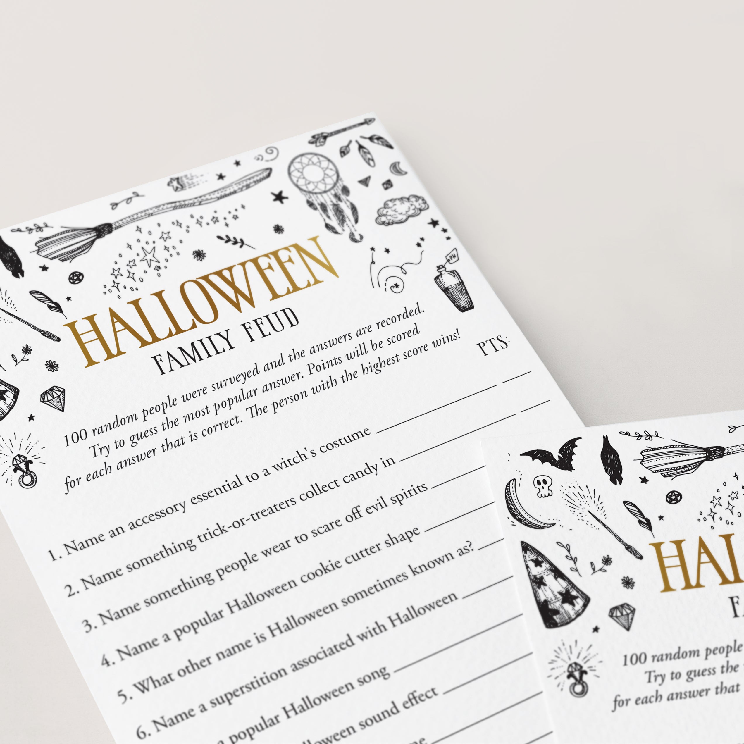 Add some fun to your Halloween party with this Witch Theme Halloween Family Feud game with witchcraft doodles. Family Feud is one of the best game shows ever. Have your friends and family compete to guess the most popular answer to random Halloween feud questions. An answer key with family feud answers and points is included. The person or team with the highest score wins!