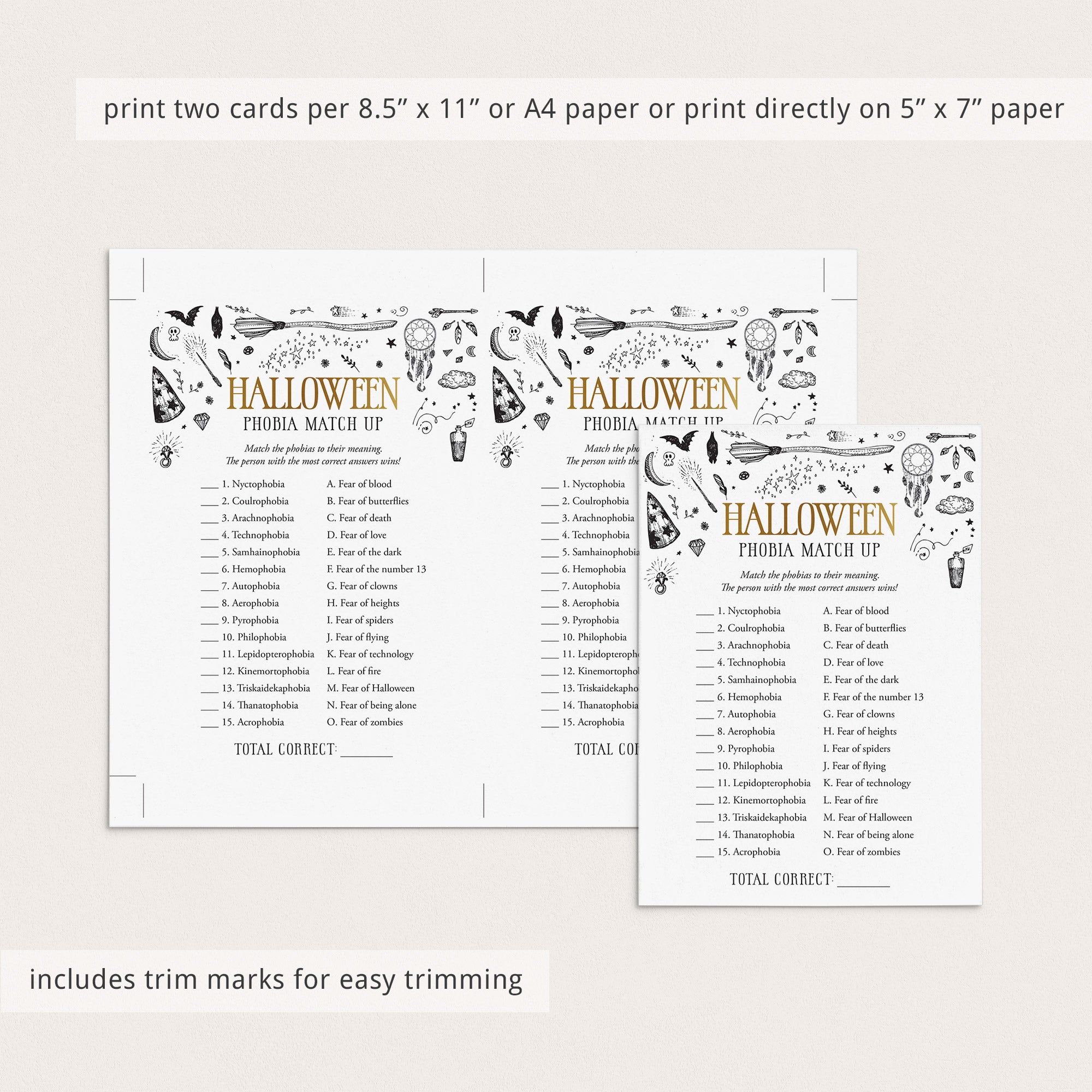 Are you hosting a witchy Halloween party and looking for some last-minute entertainment? This huge Witchcraft Halloween Party Games Bundle with 12 popular games will definitely get your guests mingling and laughing. Everyone will love these ready-to-go Halloween games – simply download, print and play! The black and gold games are great for Halloween parties, family game nights, classrooms and Halloween office parties.