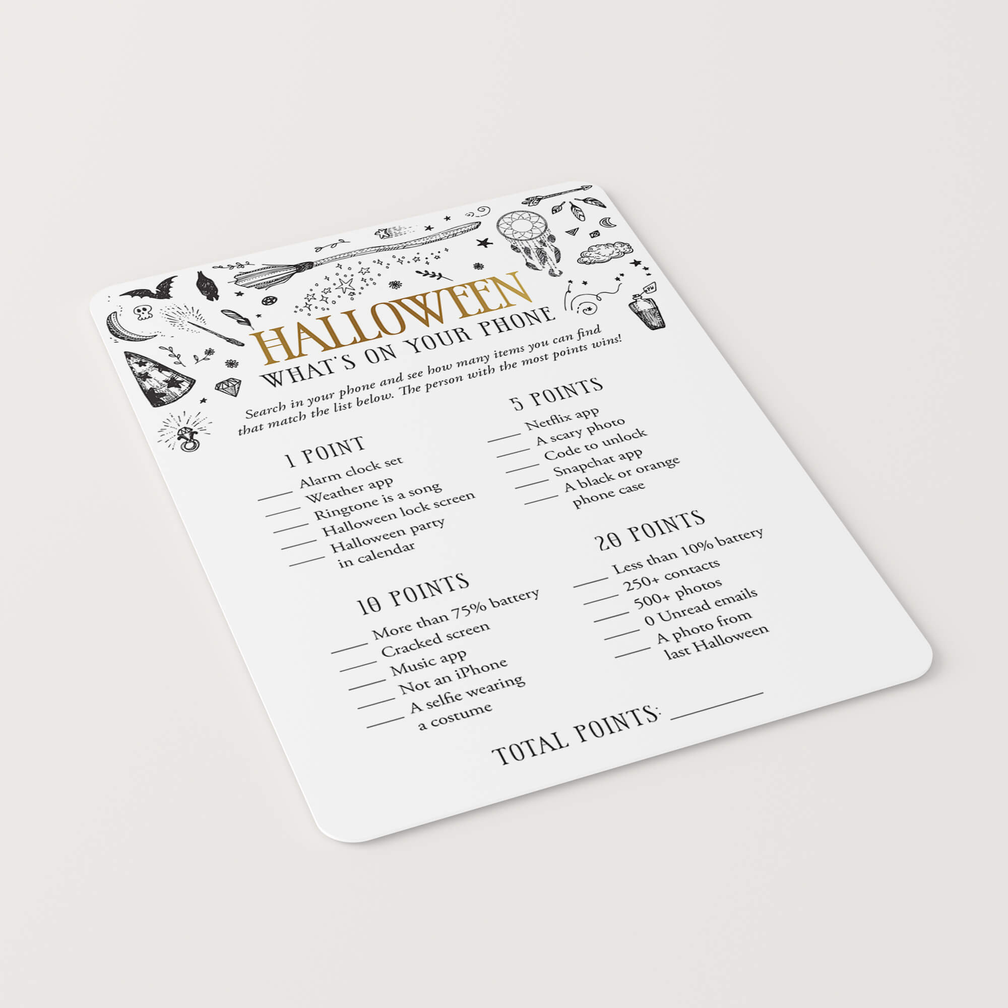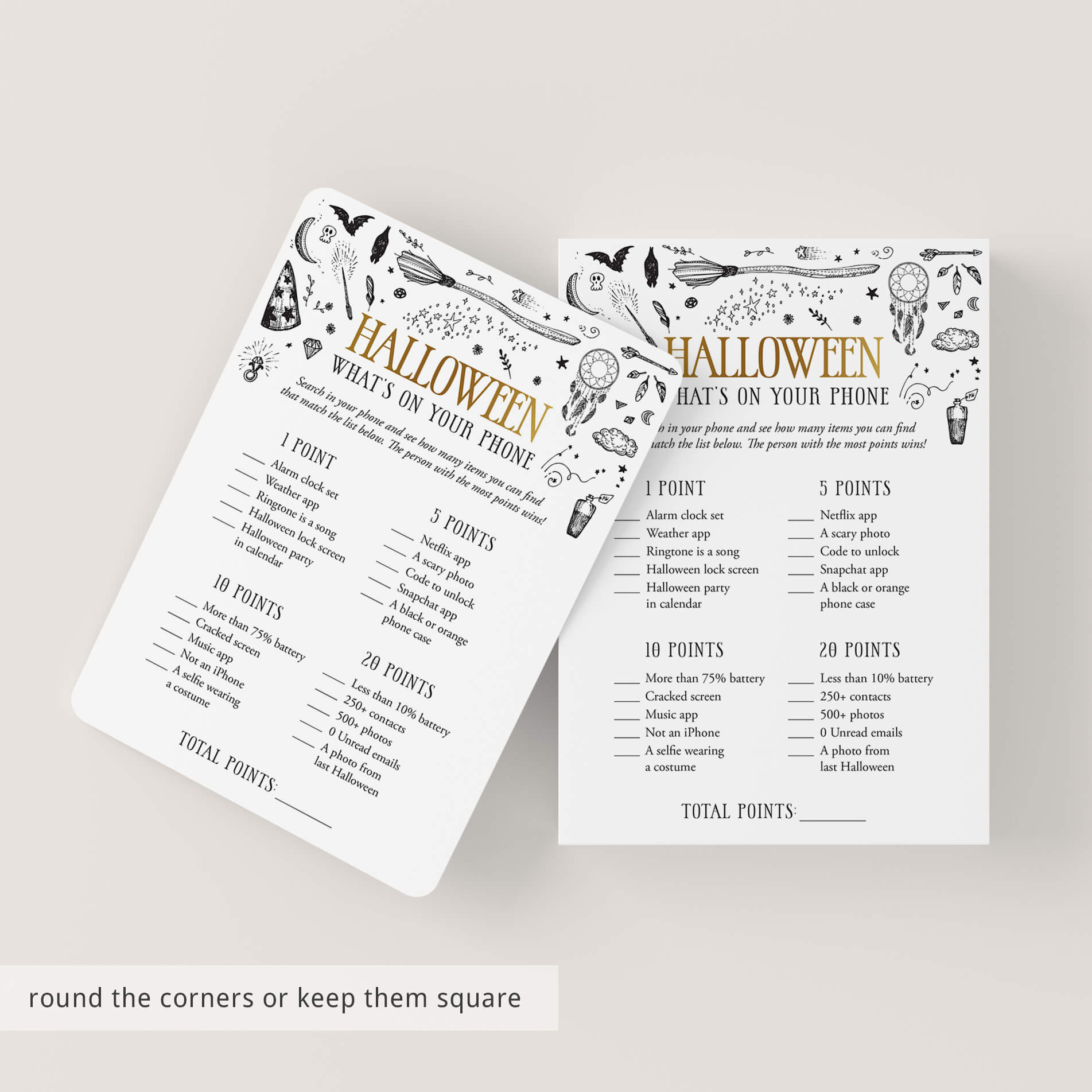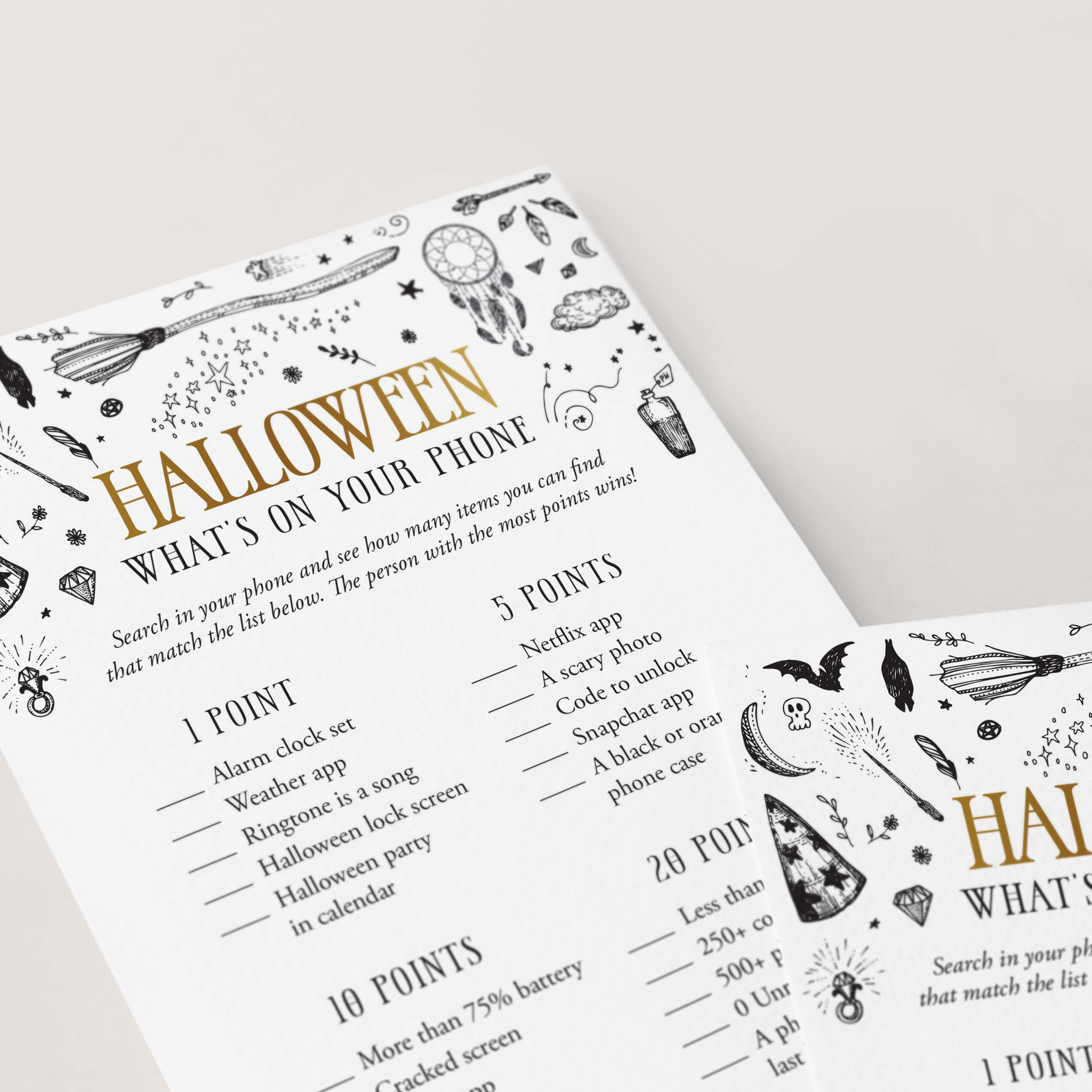 Most people come to a party with just a phone, credit card and keys. What else do you need, right? Does this sound familiar to you? Then this black and gold Witches Halloween What's On Your Phone game is the perfect icebreaker for your Witchy themed Halloween party. It’s super easy to prepare for and simple to play.