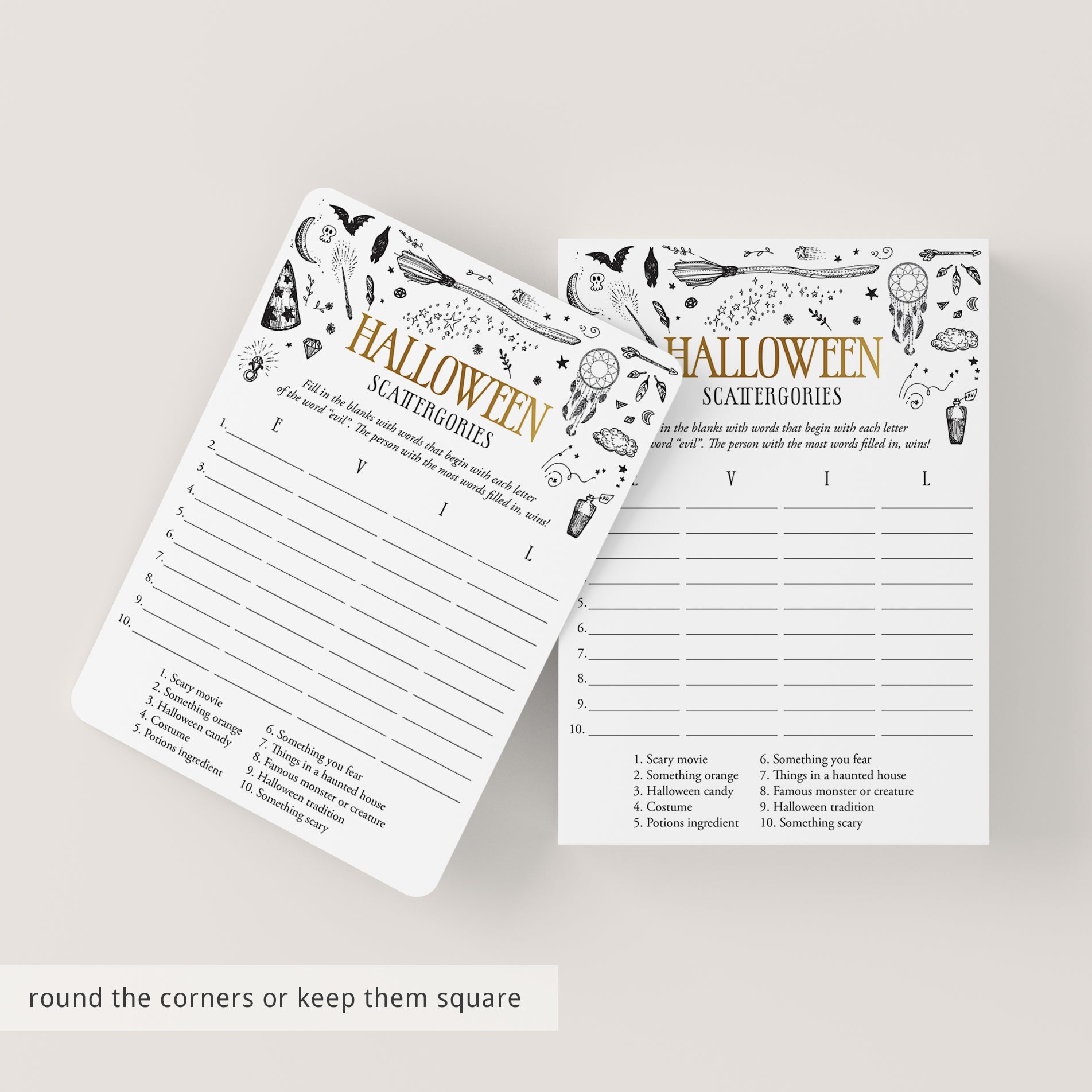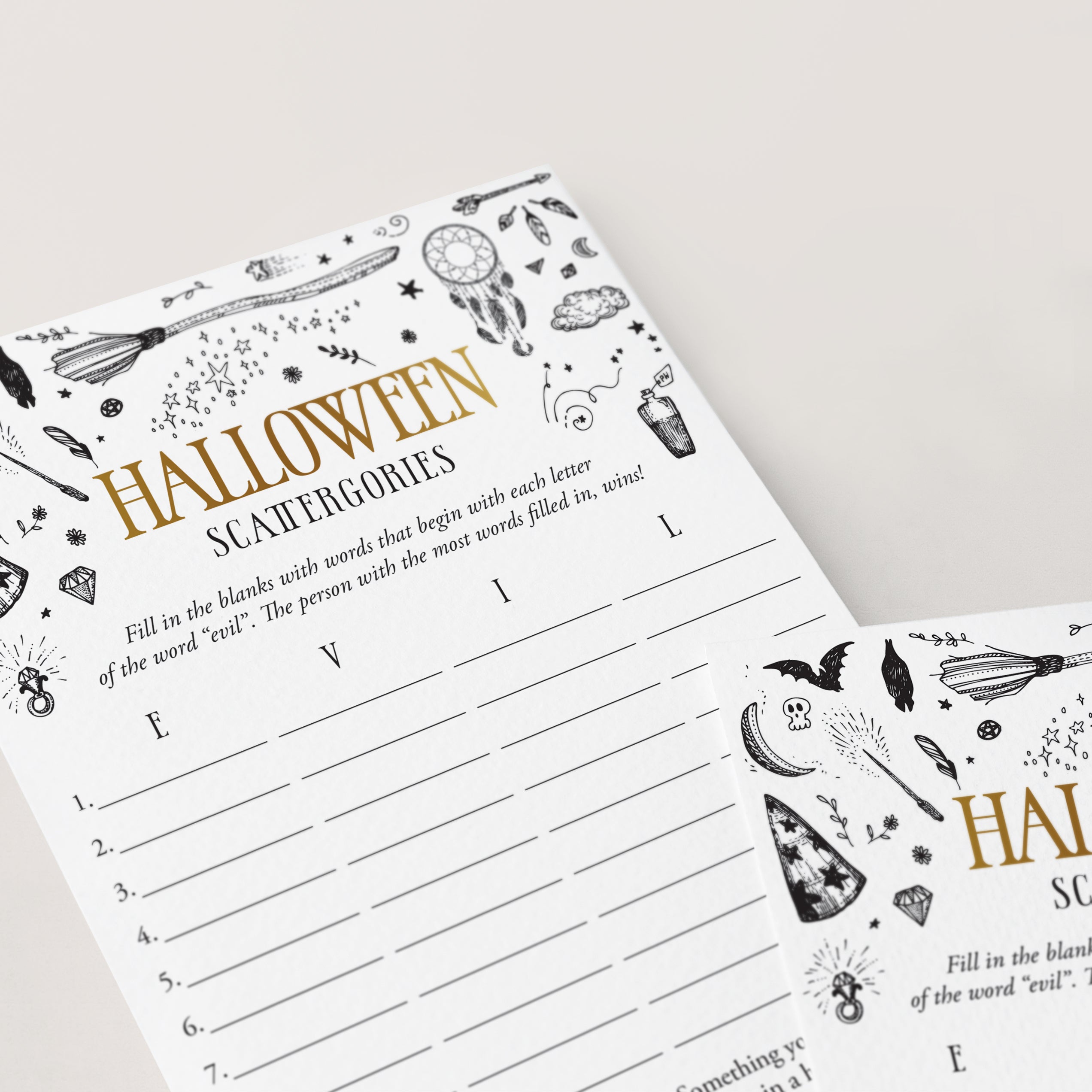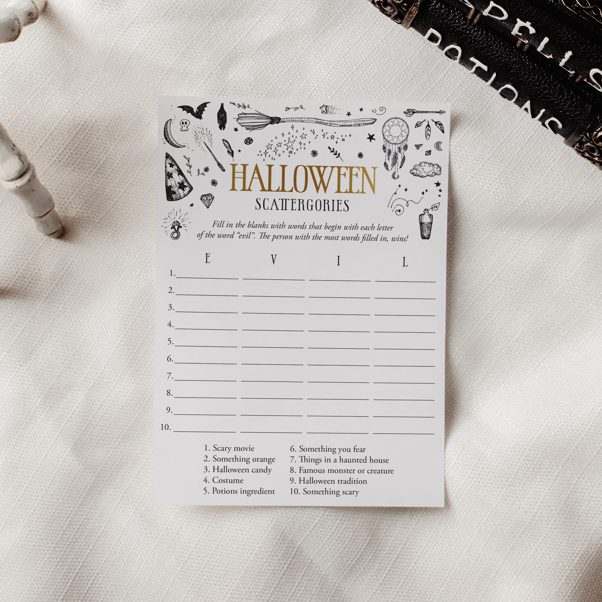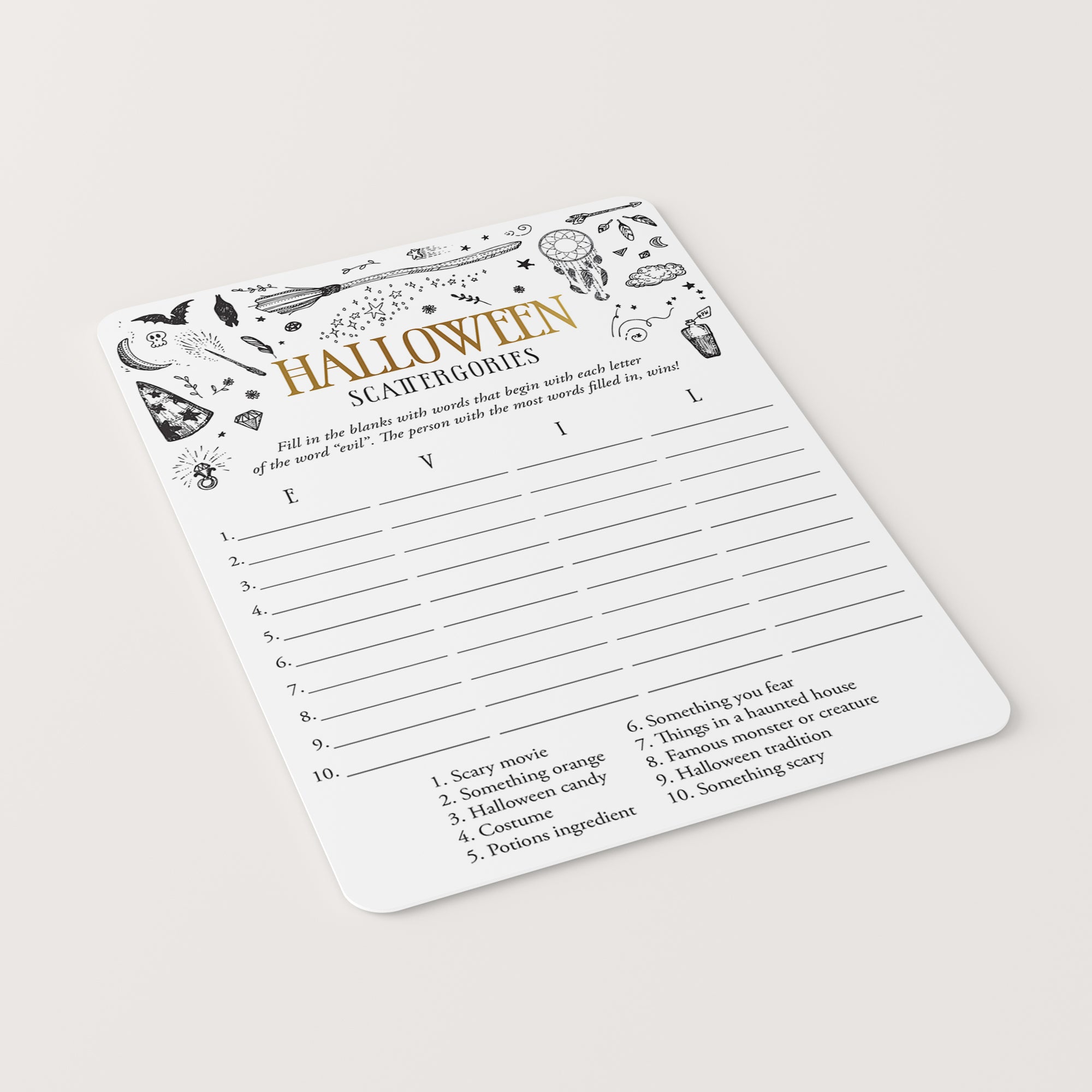 How many words can you fill in with the letters "E", "V", "I" and "L"? Play Scattergories at your Witchy Halloween party with this black and gold Halloween Scattergories game with witchcraft doodles.