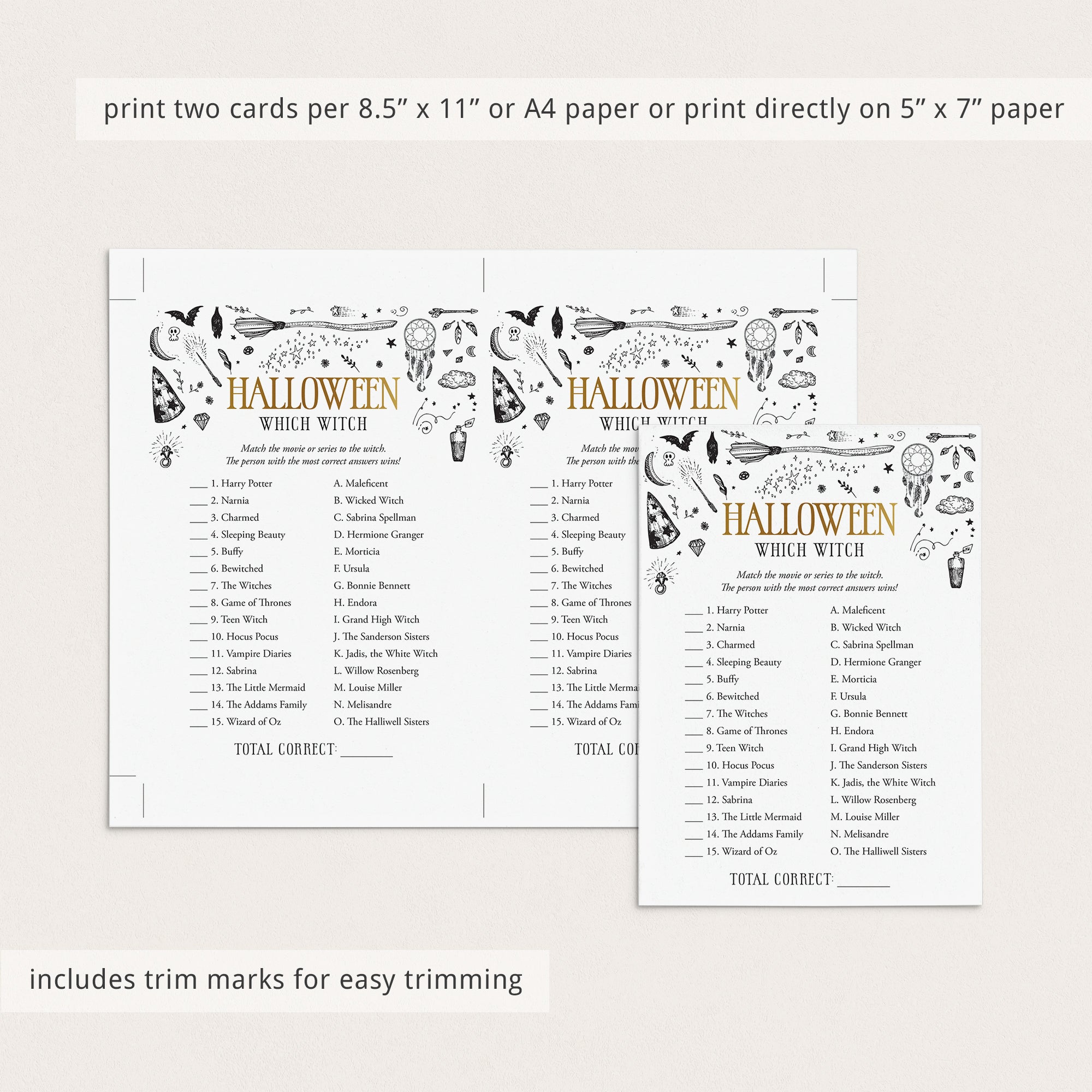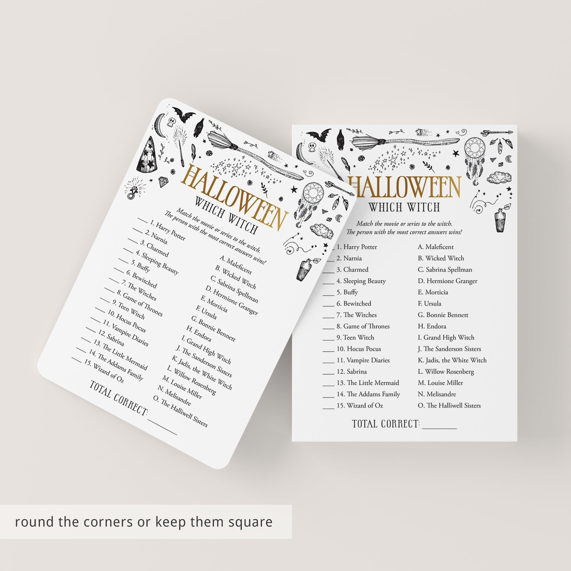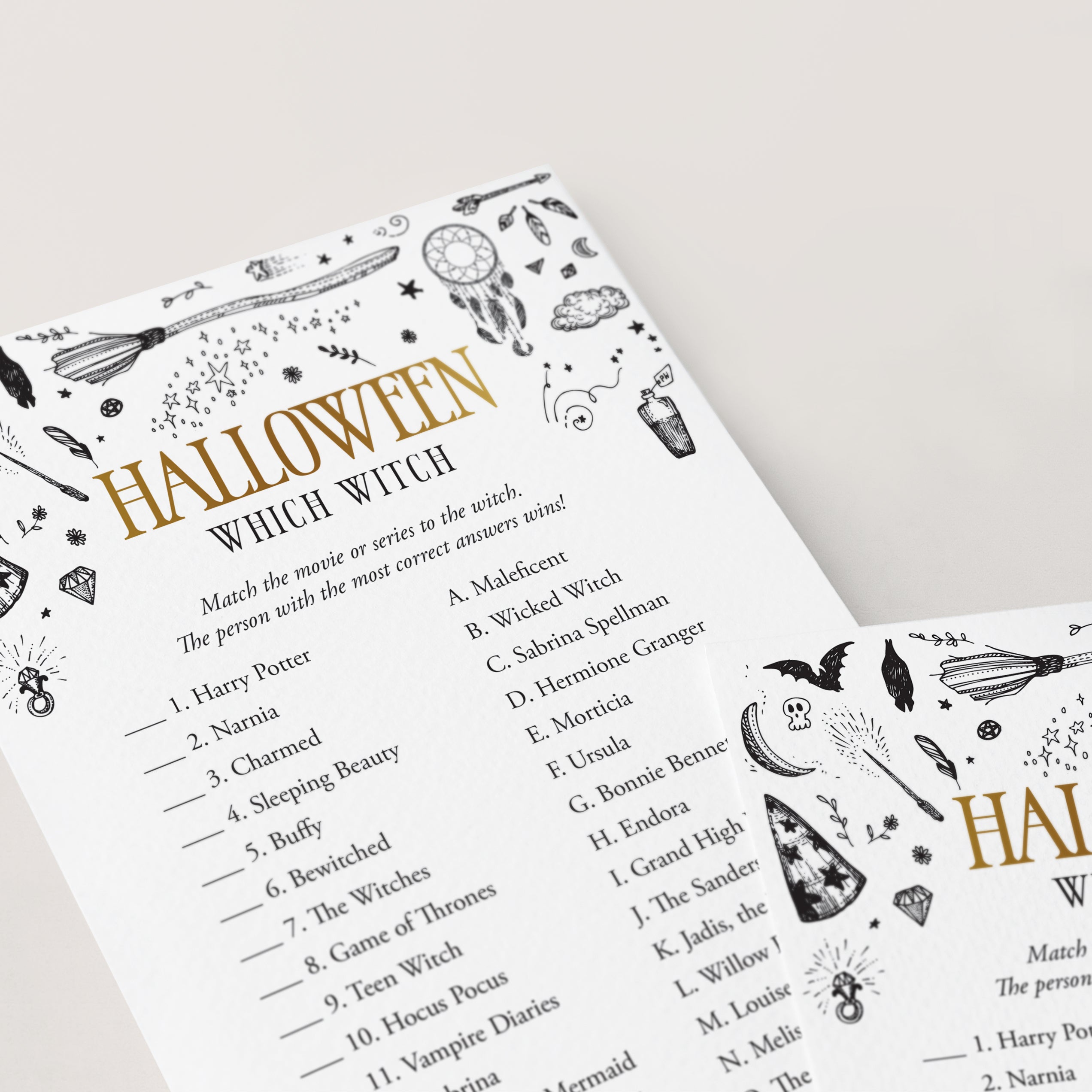 Are you hosting a Witchy Halloween party? Use this black and gold Witchcraft Halloween game to test your guests knowledge about witches. Match the movie or series to the witch. It’s a funny Halloween game to play at your Halloween office party or Halloween family night.