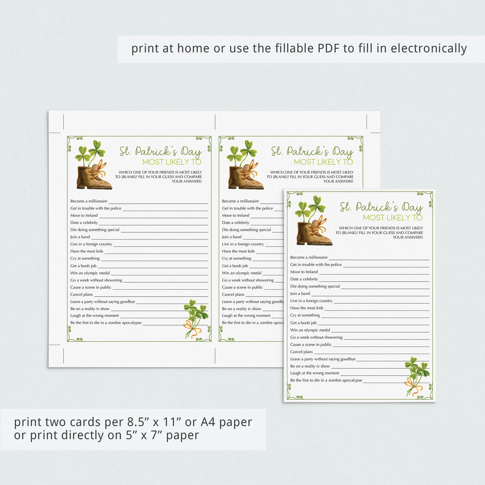For an in-person St Patrick's Day party, download and print the game cards as many times as you need. We recommend printing on a nice heavy card stock for highest quality feel. Print right from your computer in a matter of minutes or have the cards printed at your favorite print shop.