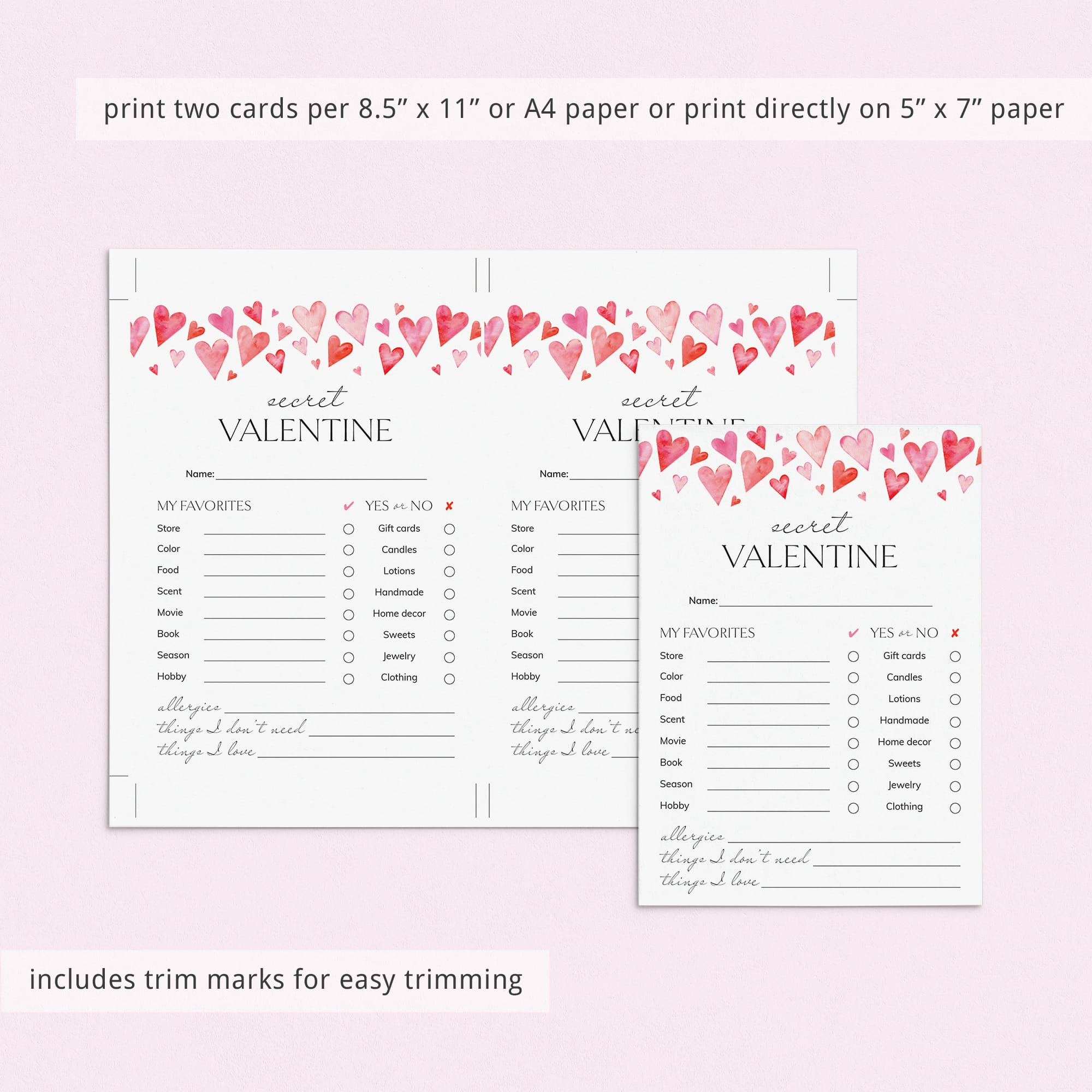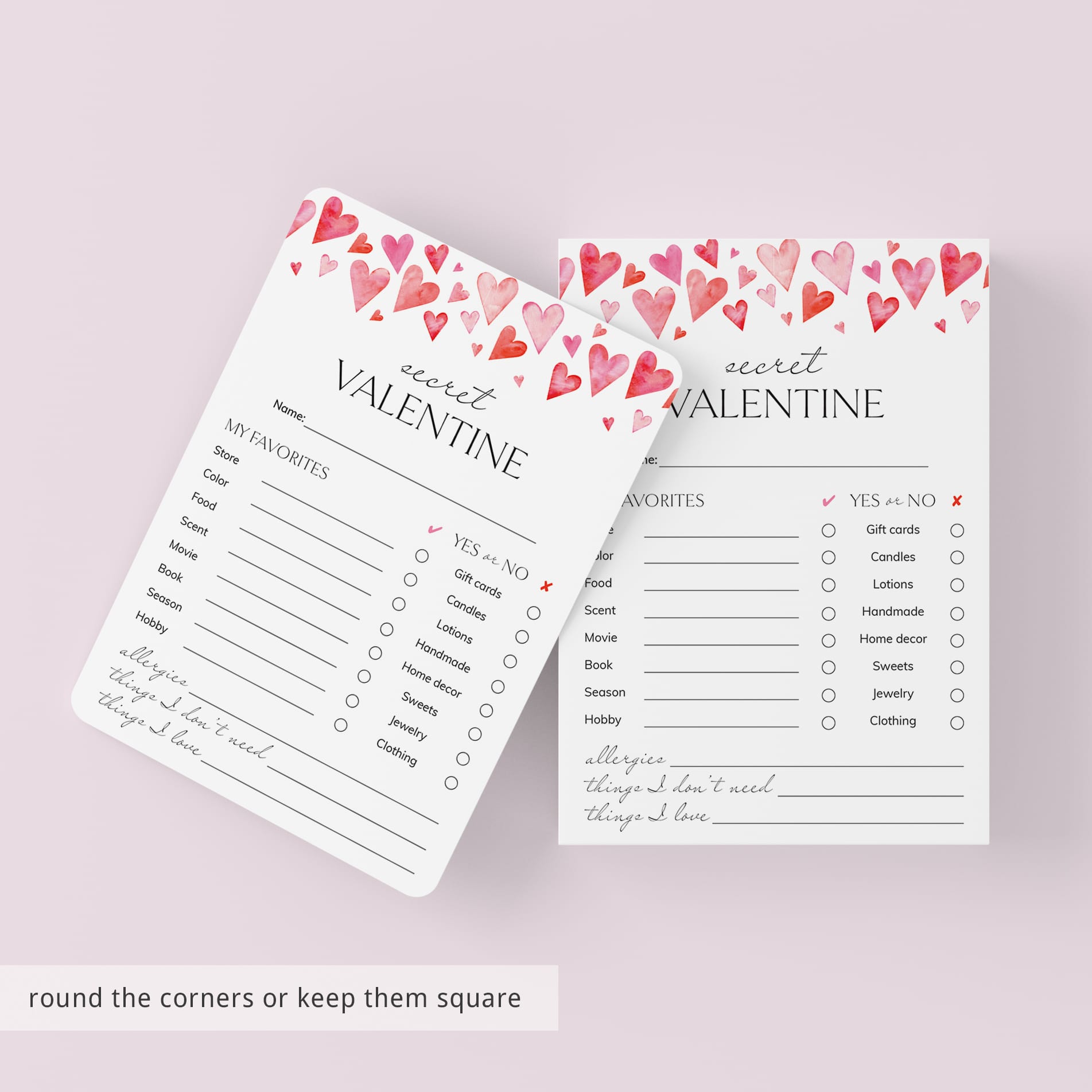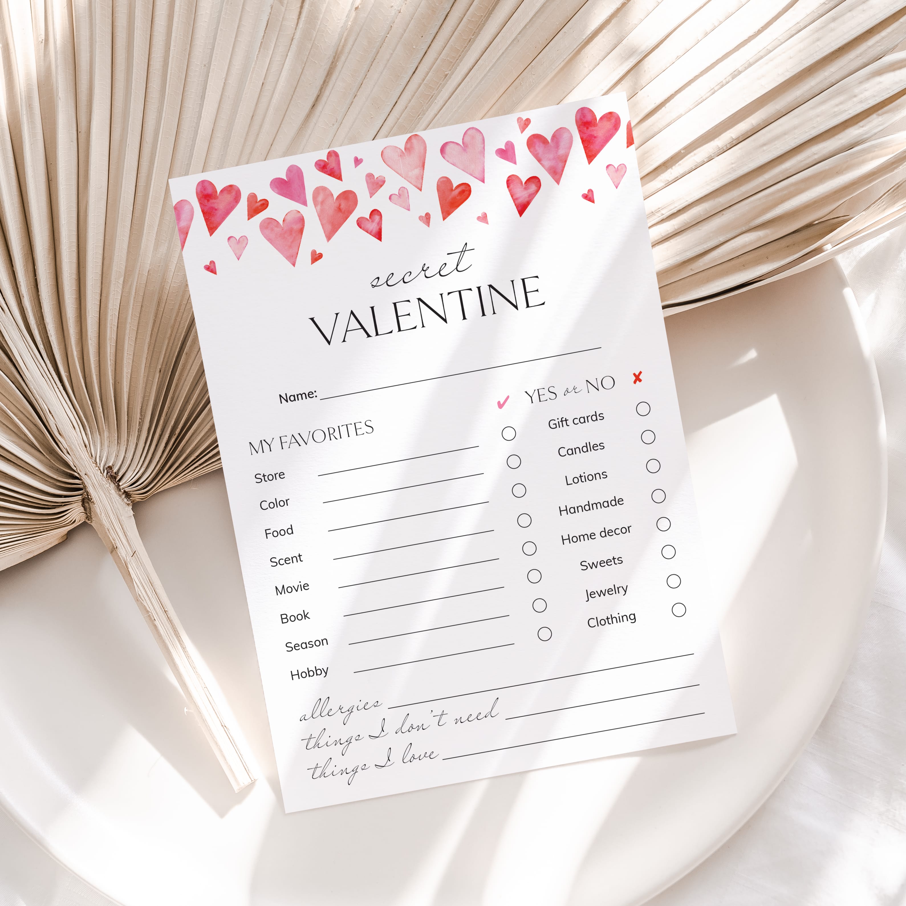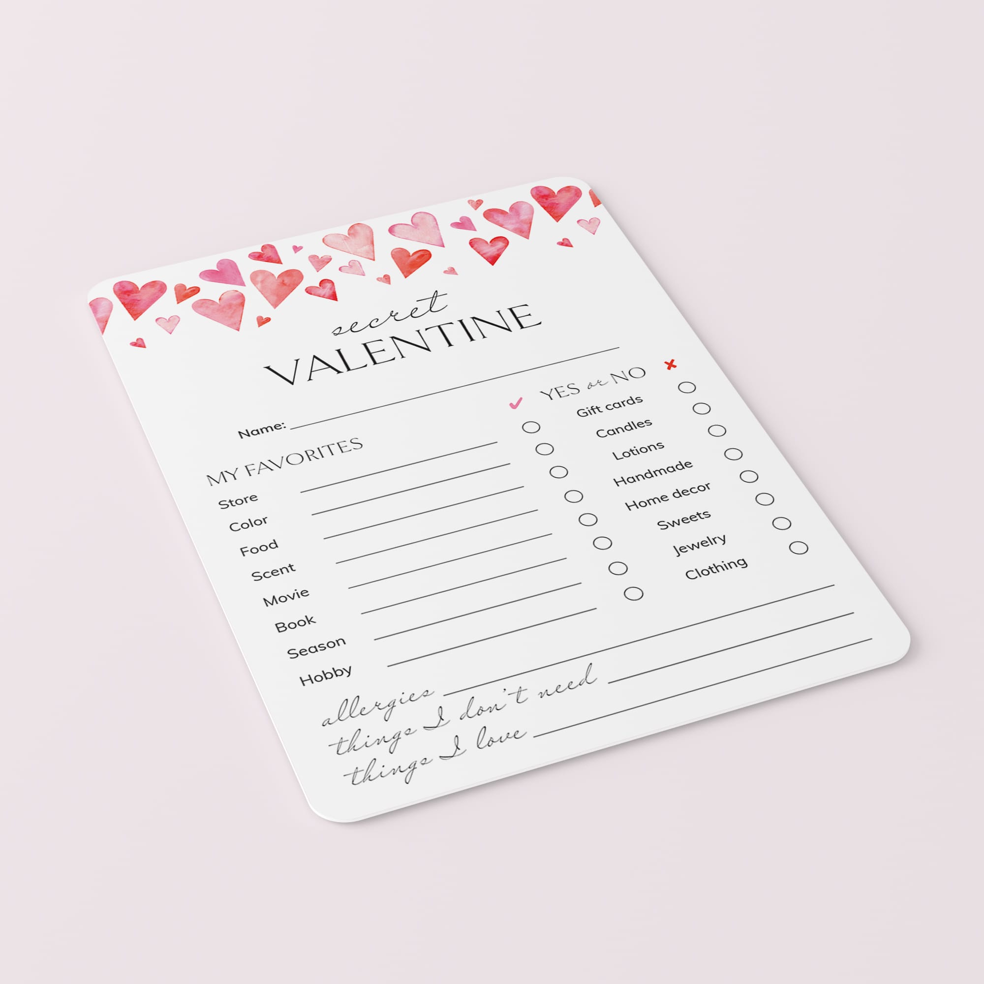 This easy fill-in sheet helps participants share their likes, dislikes, and little personal preferences. From favorite scents and colors to simple “Yes or No” choices, it gives your Secret Valentine everything they need to pick a thoughtful gift without the guesswork.