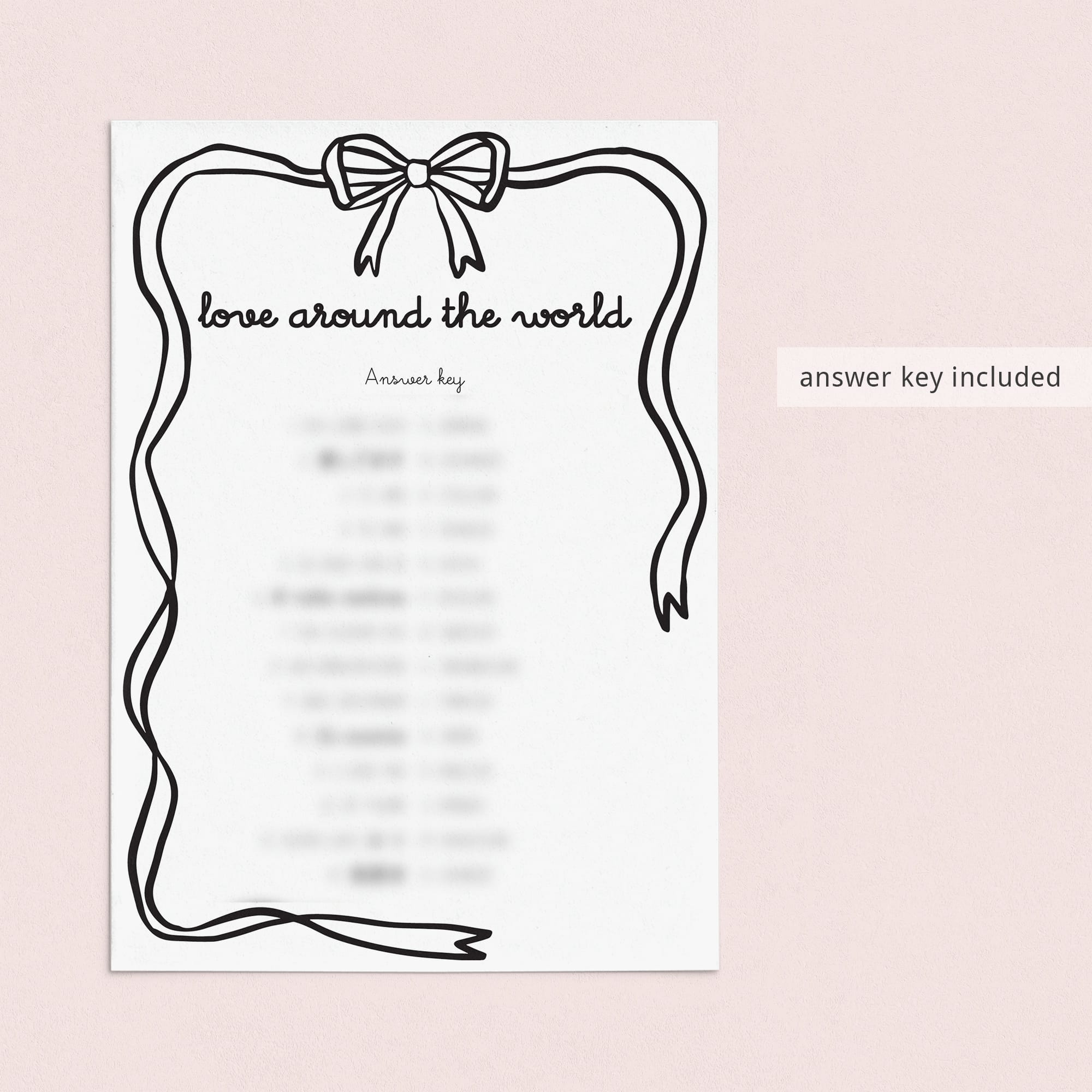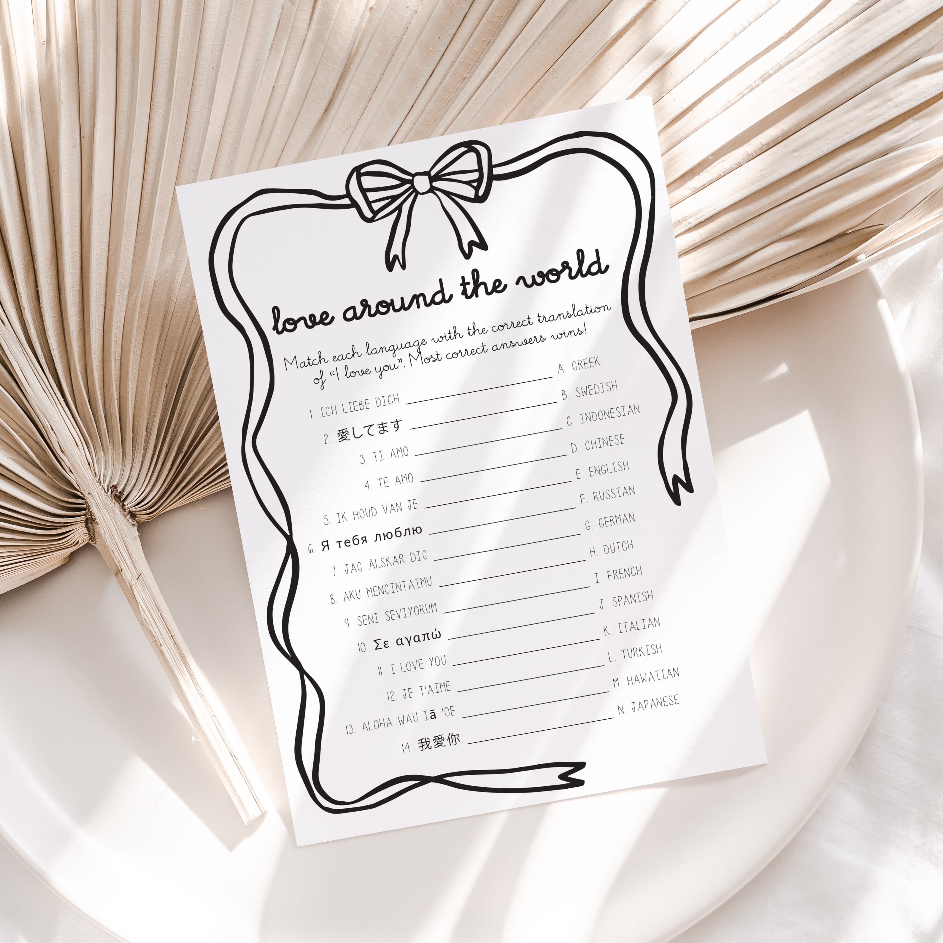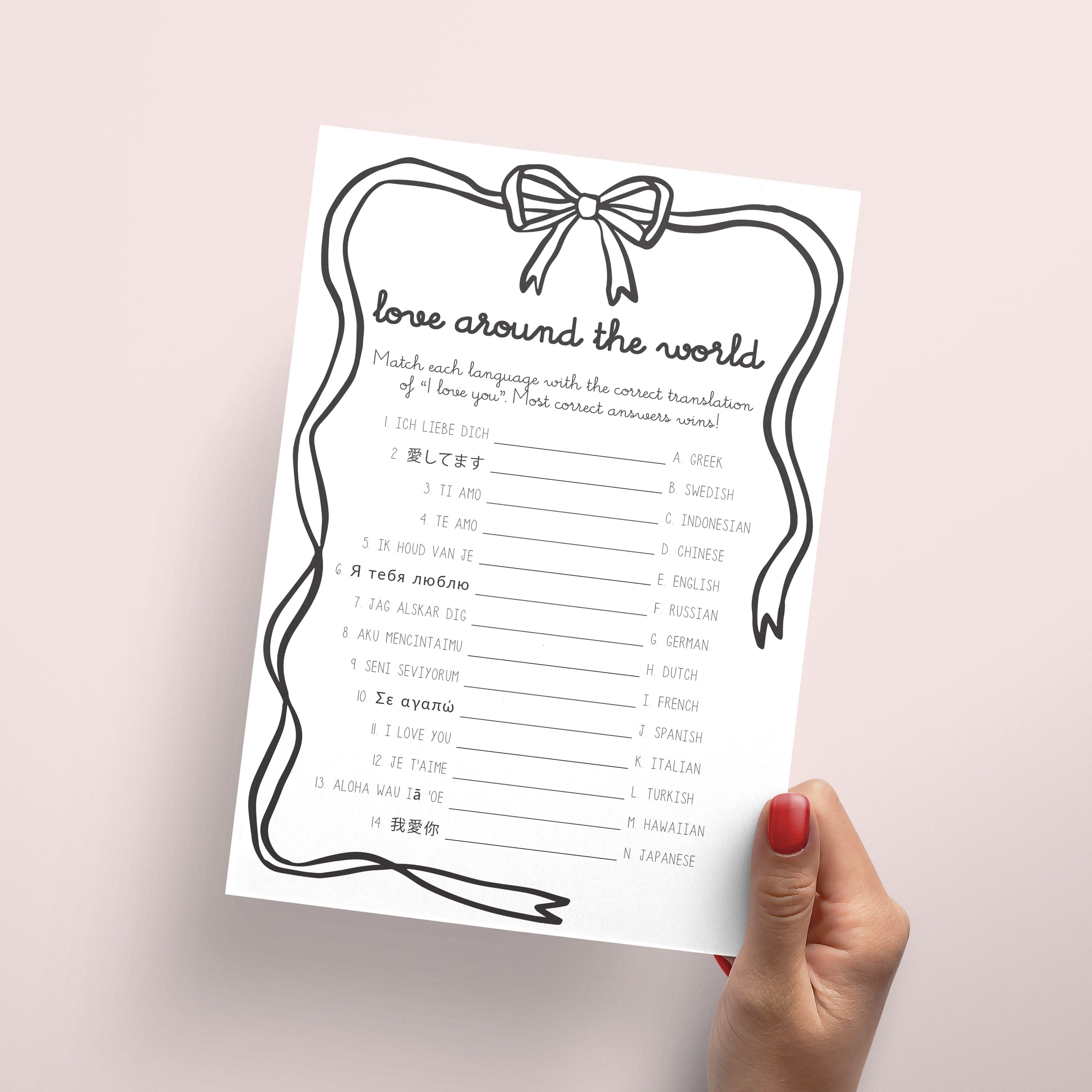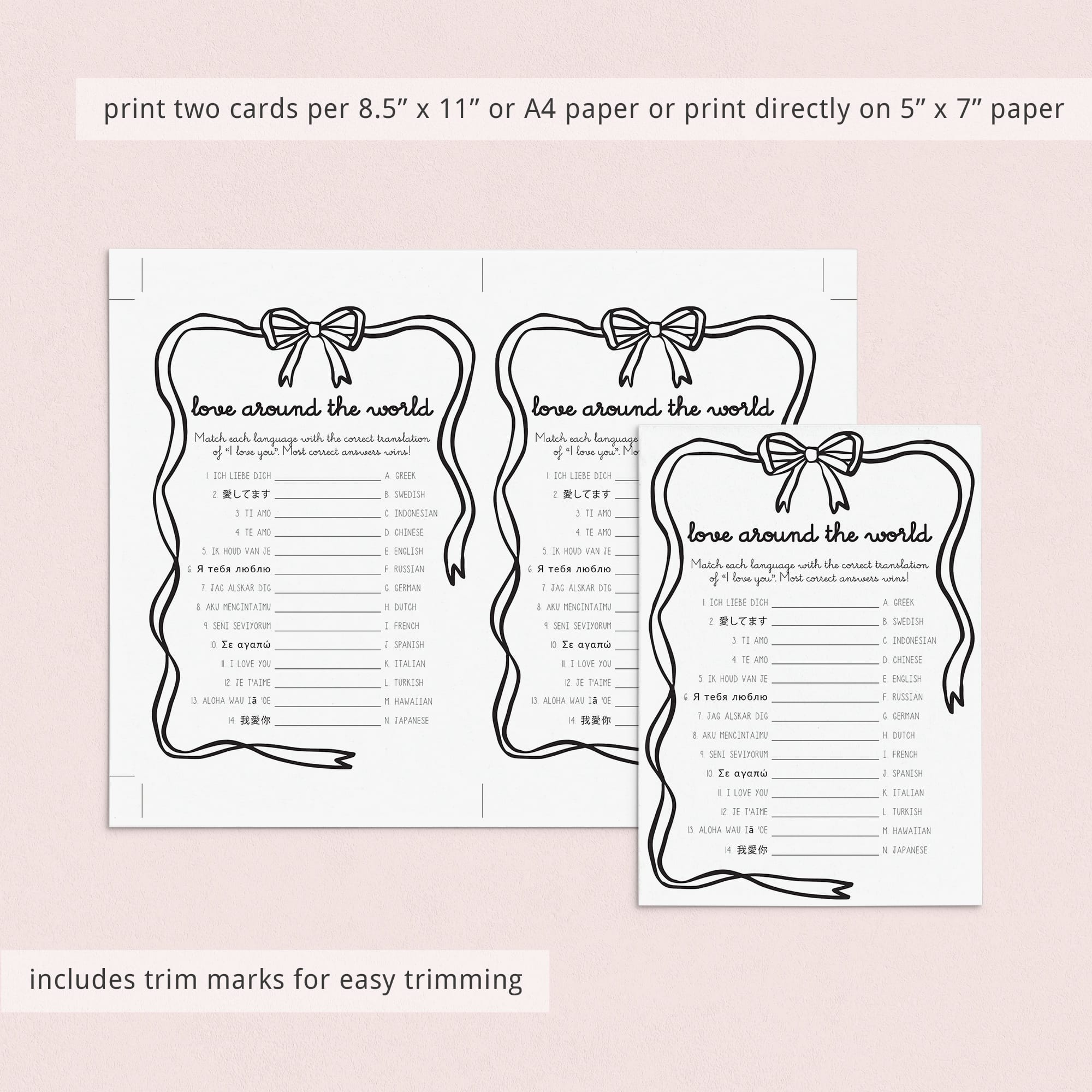 The game is very easy to play. Print and distribute these wavy border bow theme Around The World game cards and a pen to each of your guests. They have to match each version of the words “I Love You” with its language of origin. The person with the most correct answers wins.