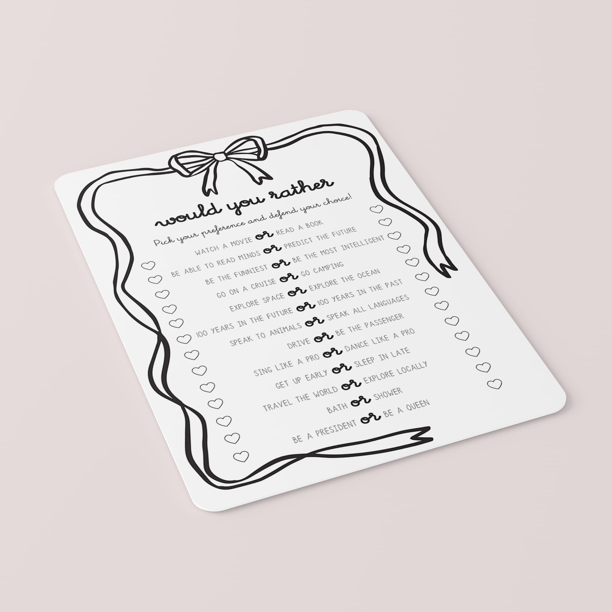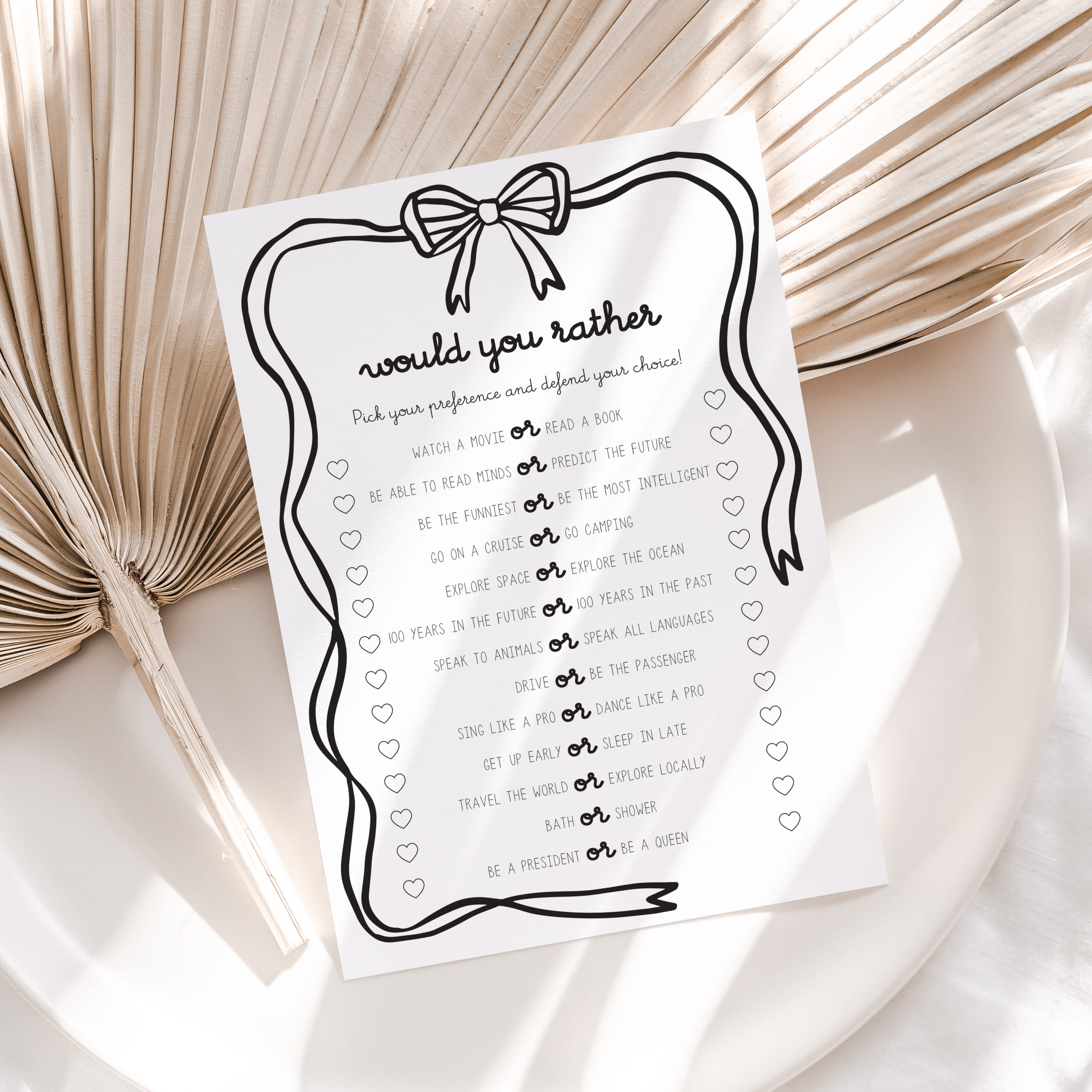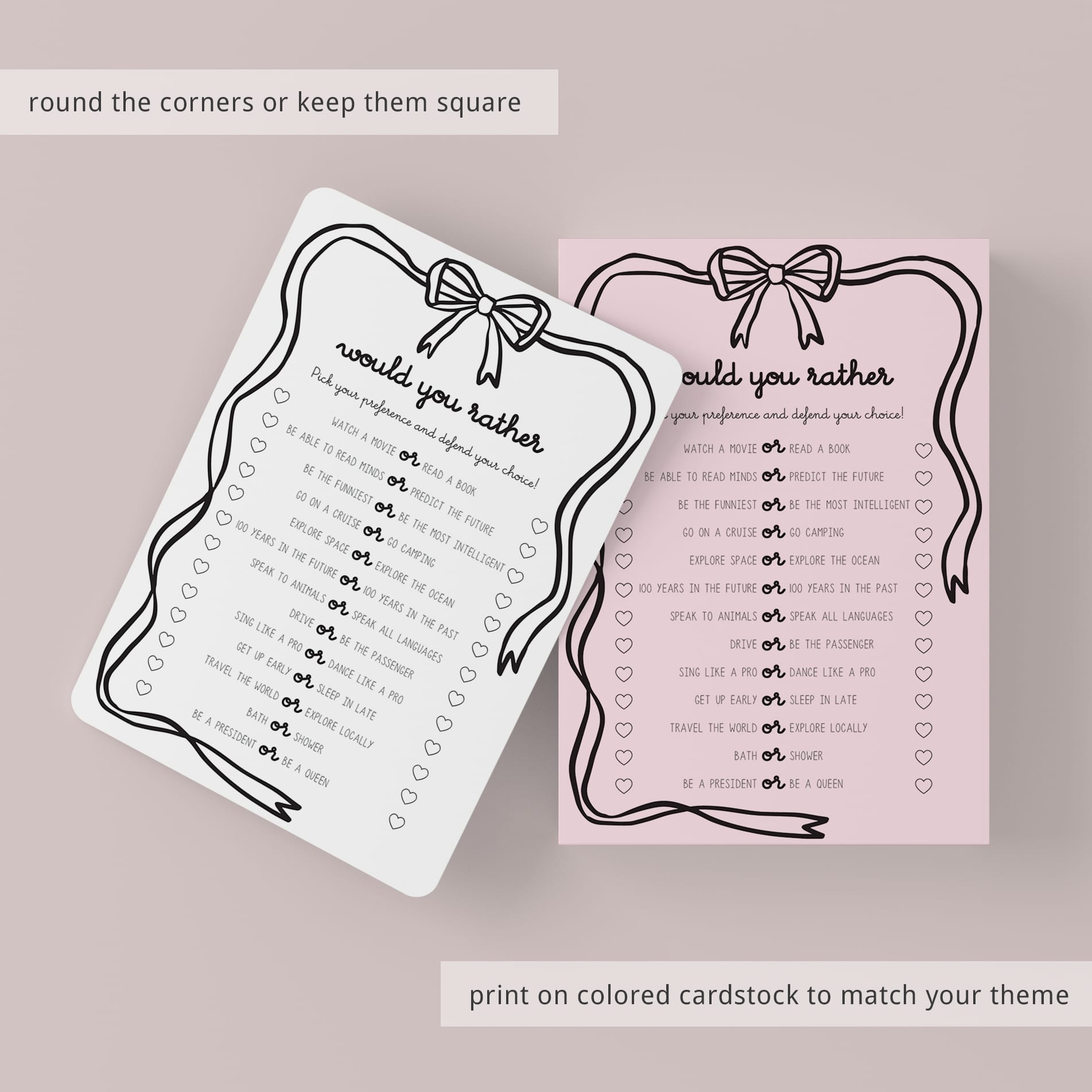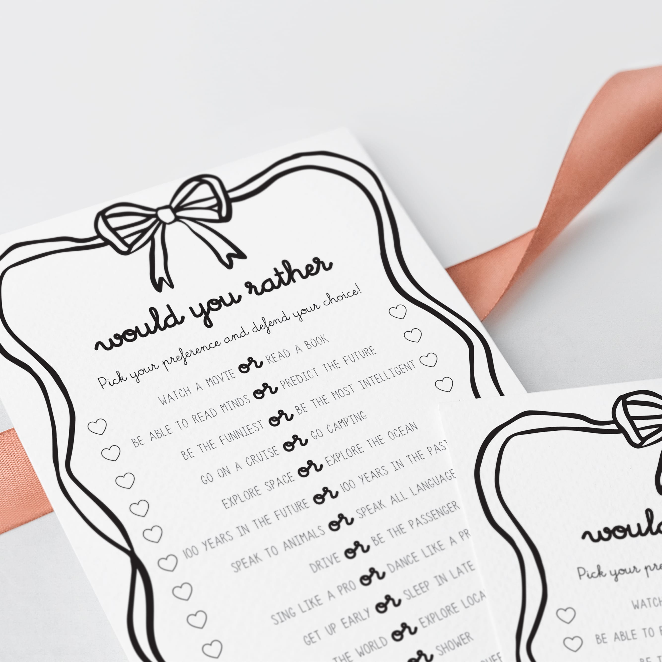Are you looking for a fun icebreaker game for your Girls Night In? Play Would You Rather. It's is a great conversation starter for your party. This cute Would You Rather game, featuring a playful wavy border topped with a sweet black bow, has 13 This or That questions. Have all the girls pick their preferences and defend their choice.