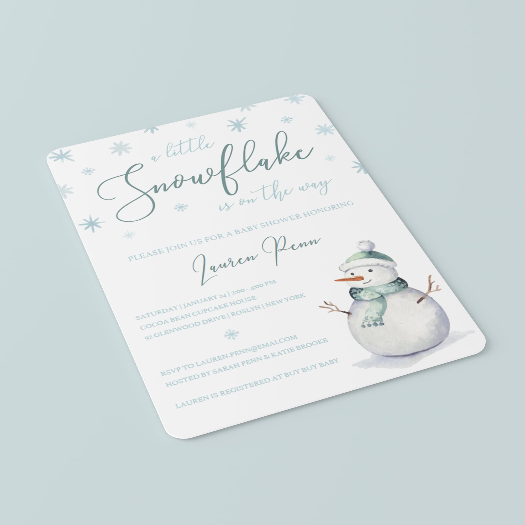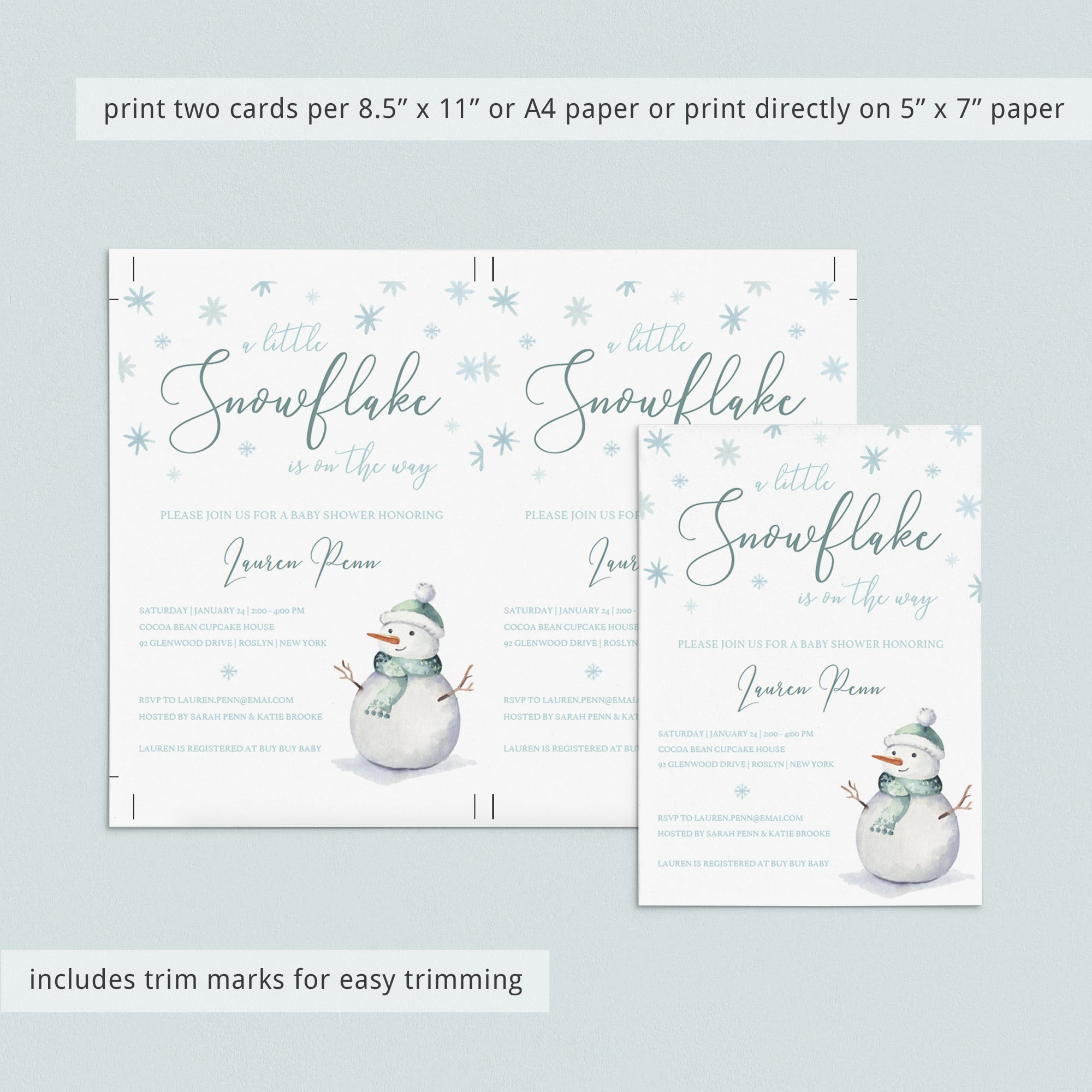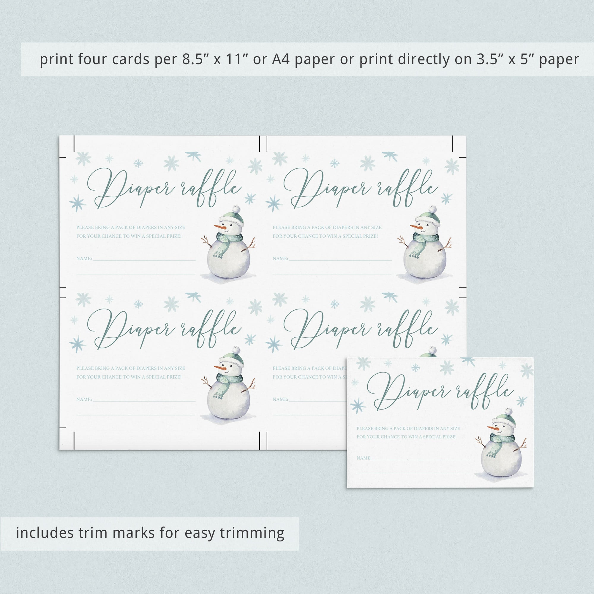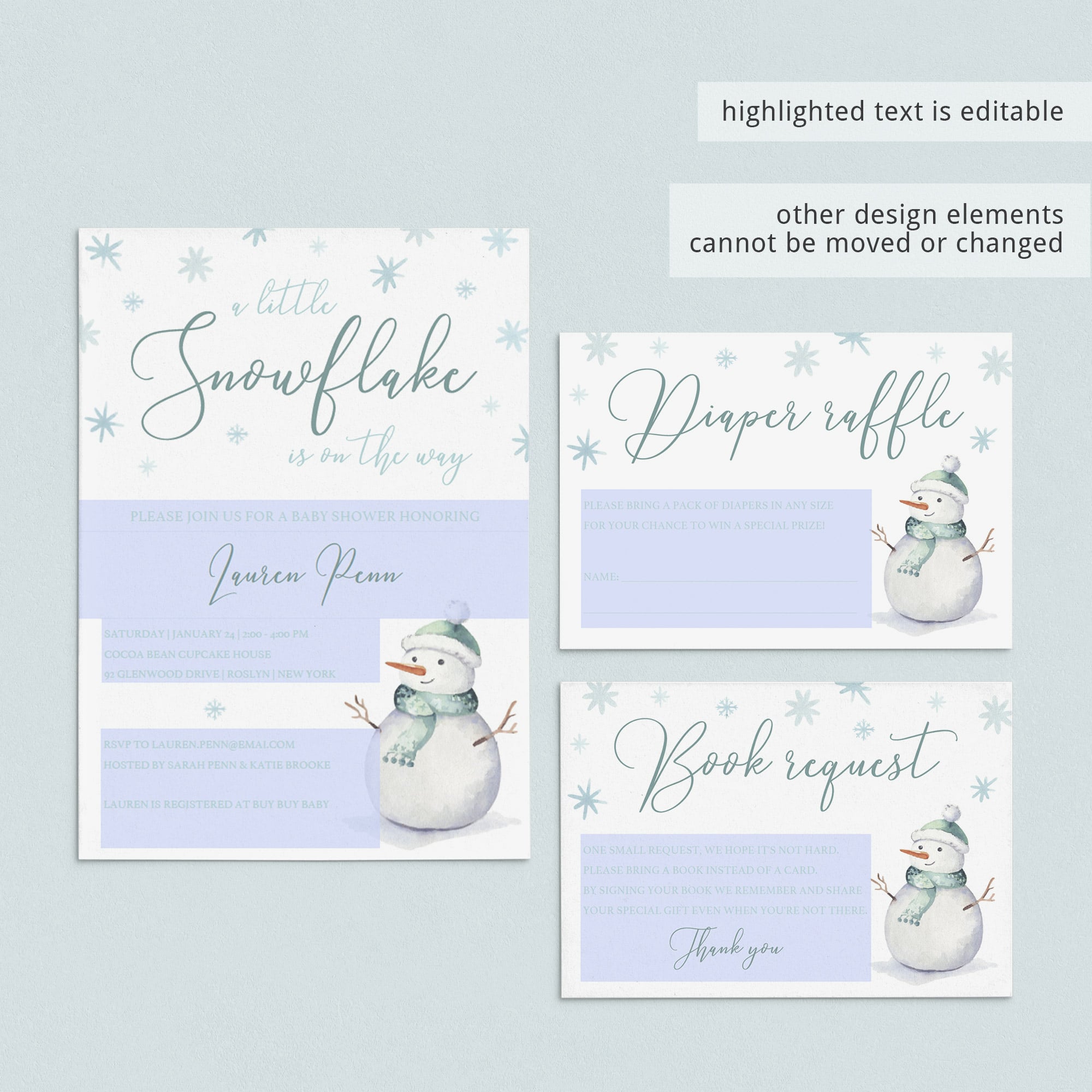 Are you hosting a winter baby shower? Celebrate the arrival of the little one with a Winter Wonderland baby party. Guests will be delighted when they receive this adorable baby shower invitation kit with watercolor snowmen and little snowflakes. Included in the kit are the Baby Shower Invitation, a Diaper Raffle ticket and a Book Request card.