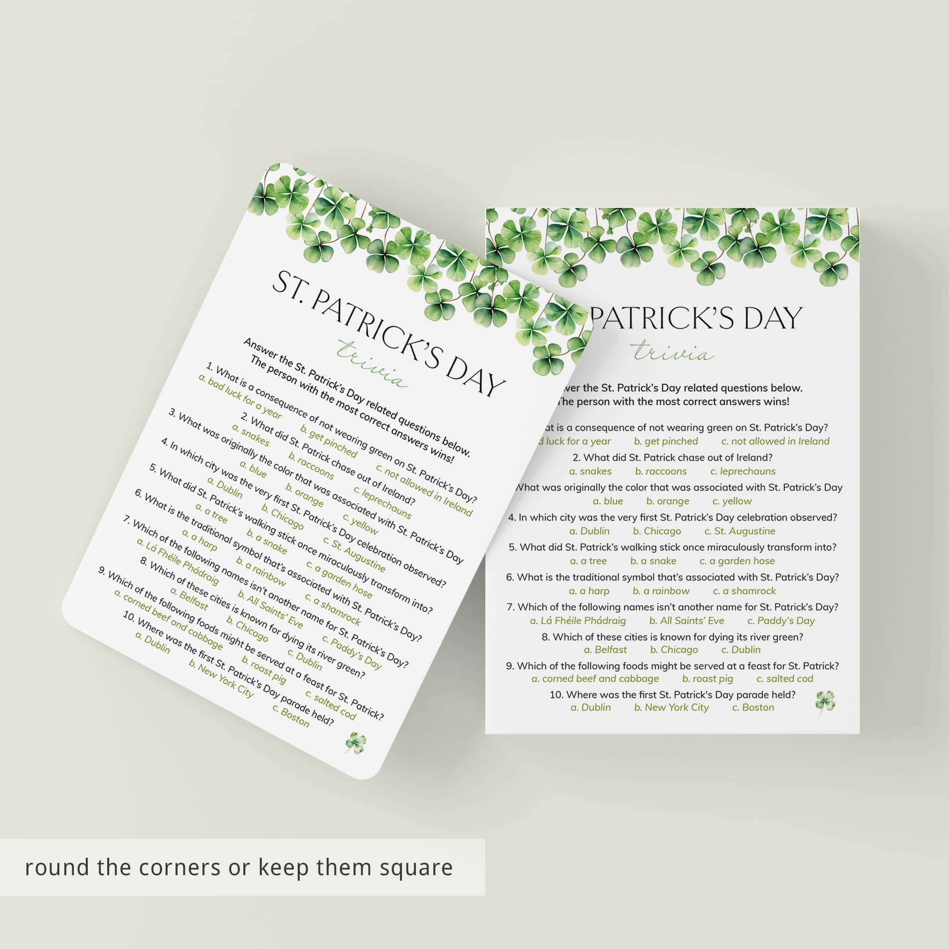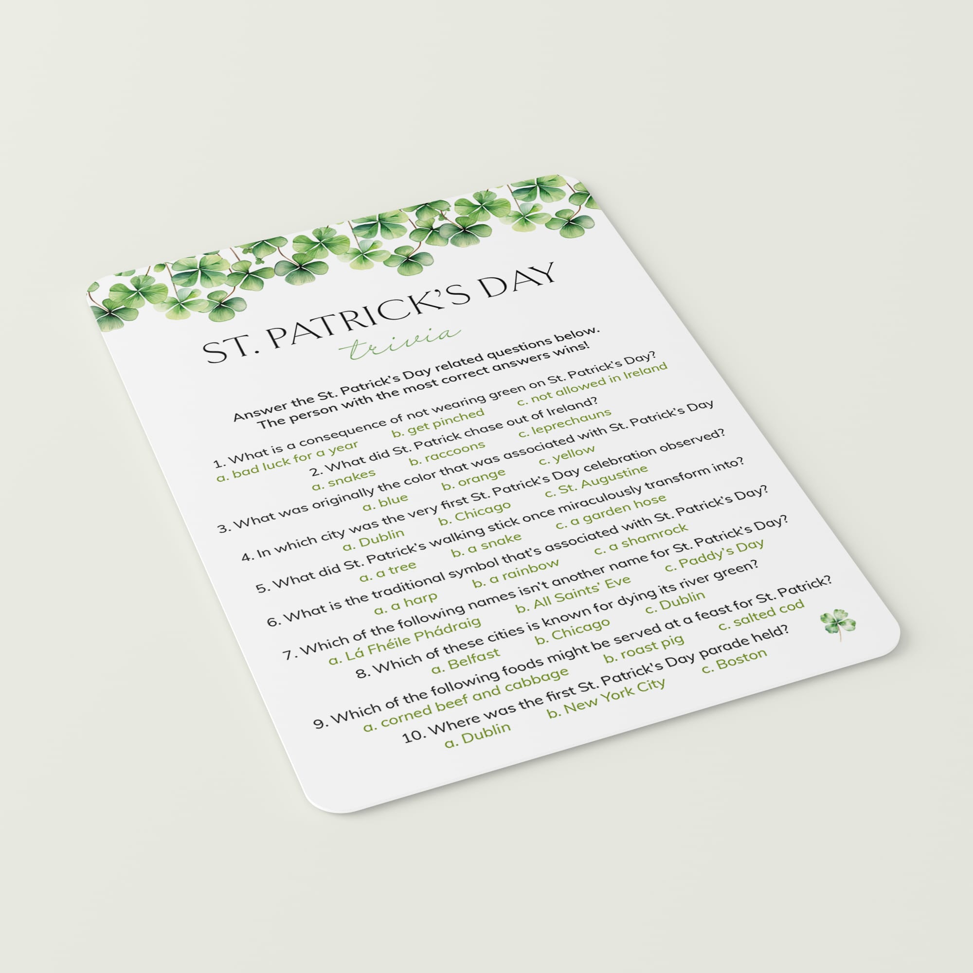 Are you hosting a St. Patties Day party? Test your guests knowledge of this Irish holiday with this fun St. Patrick's Day Trivia game. It is a great game to play at home with friends and family or with co-workers at the office and you will learn some fun St. Patrick's Day facts. Just in case you are having trouble figuring out the answers, an answer key is included.