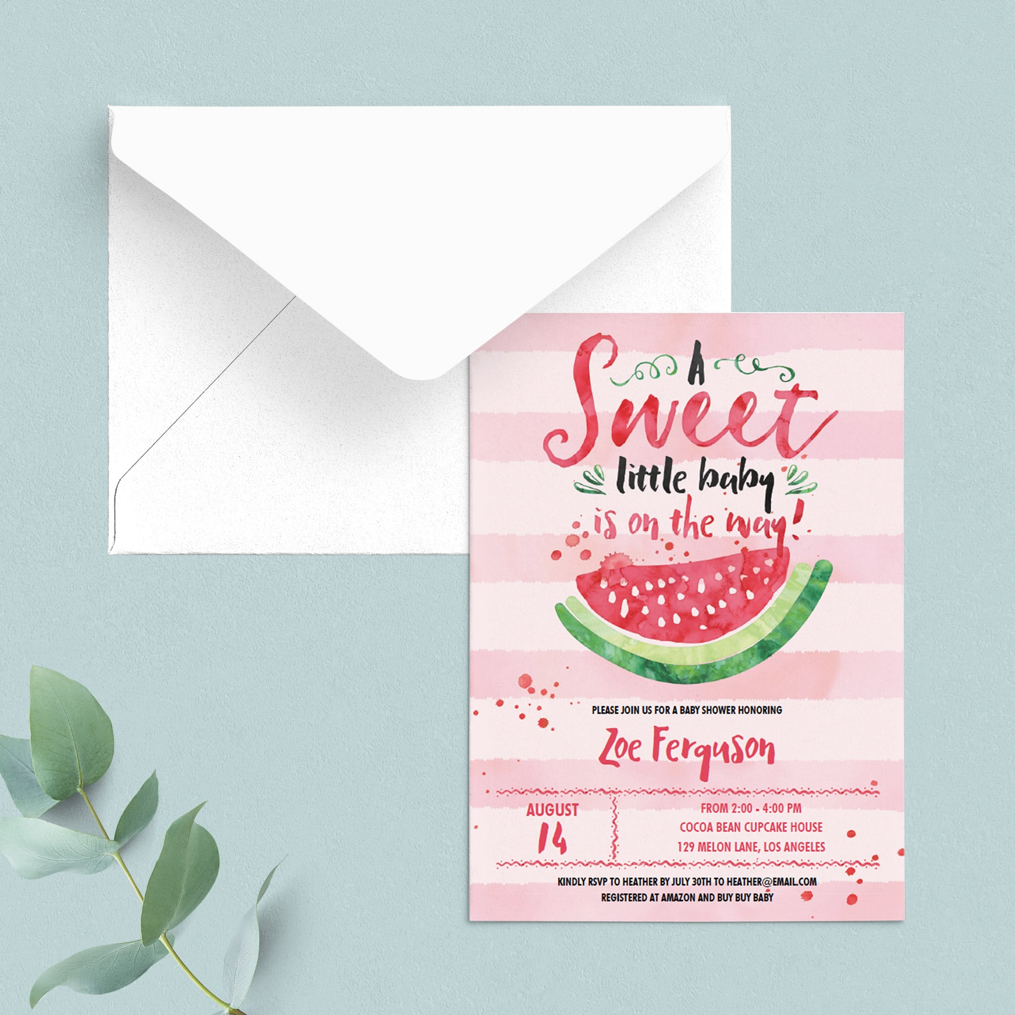 Are you hosting a summer baby shower to celebrate the arrival of a baby girl? Make the cutest announcement with this summer baby shower invitation set with watercolor melon and pink stripes. You guests will be delighted when they receive the cheerful invite with matching insert cards.
