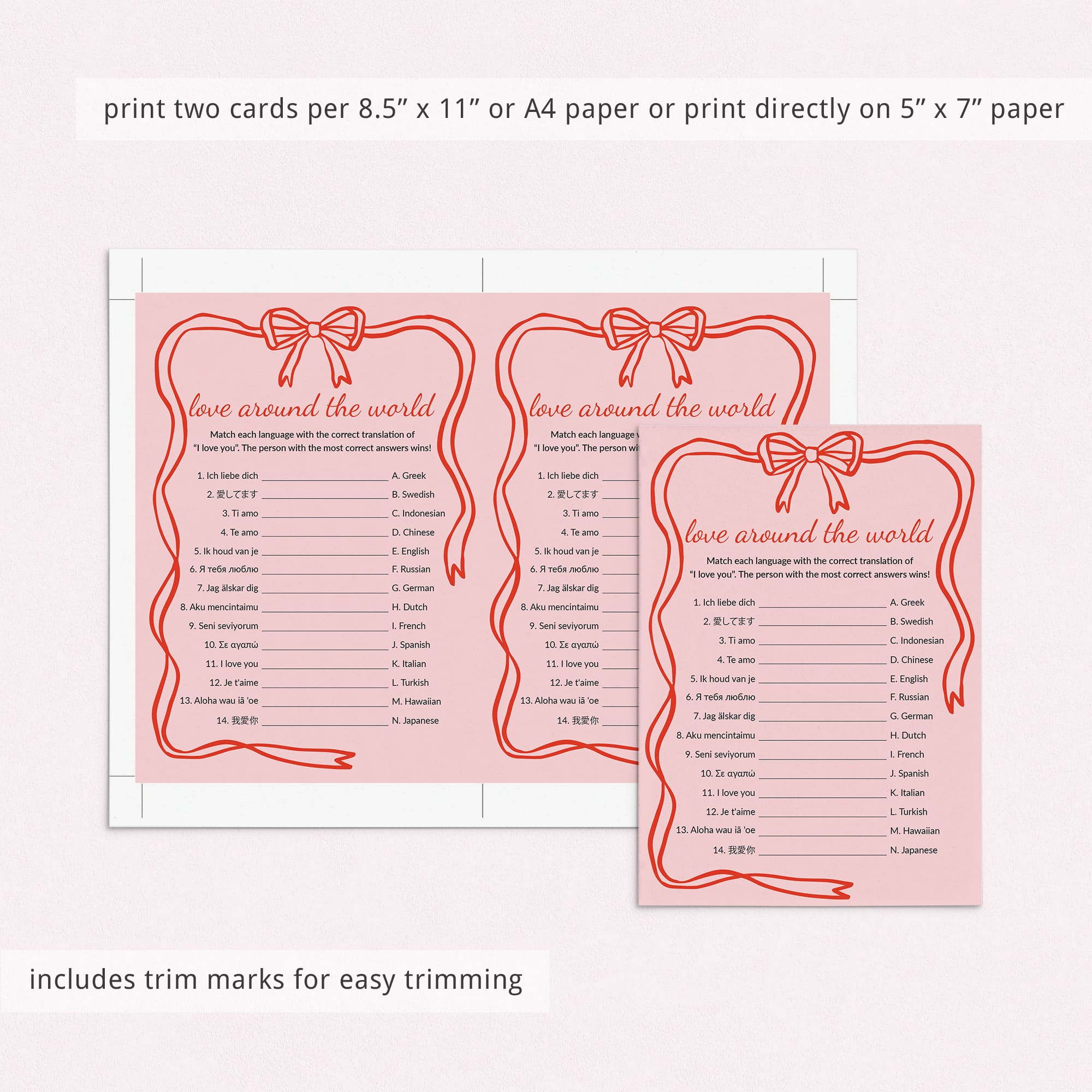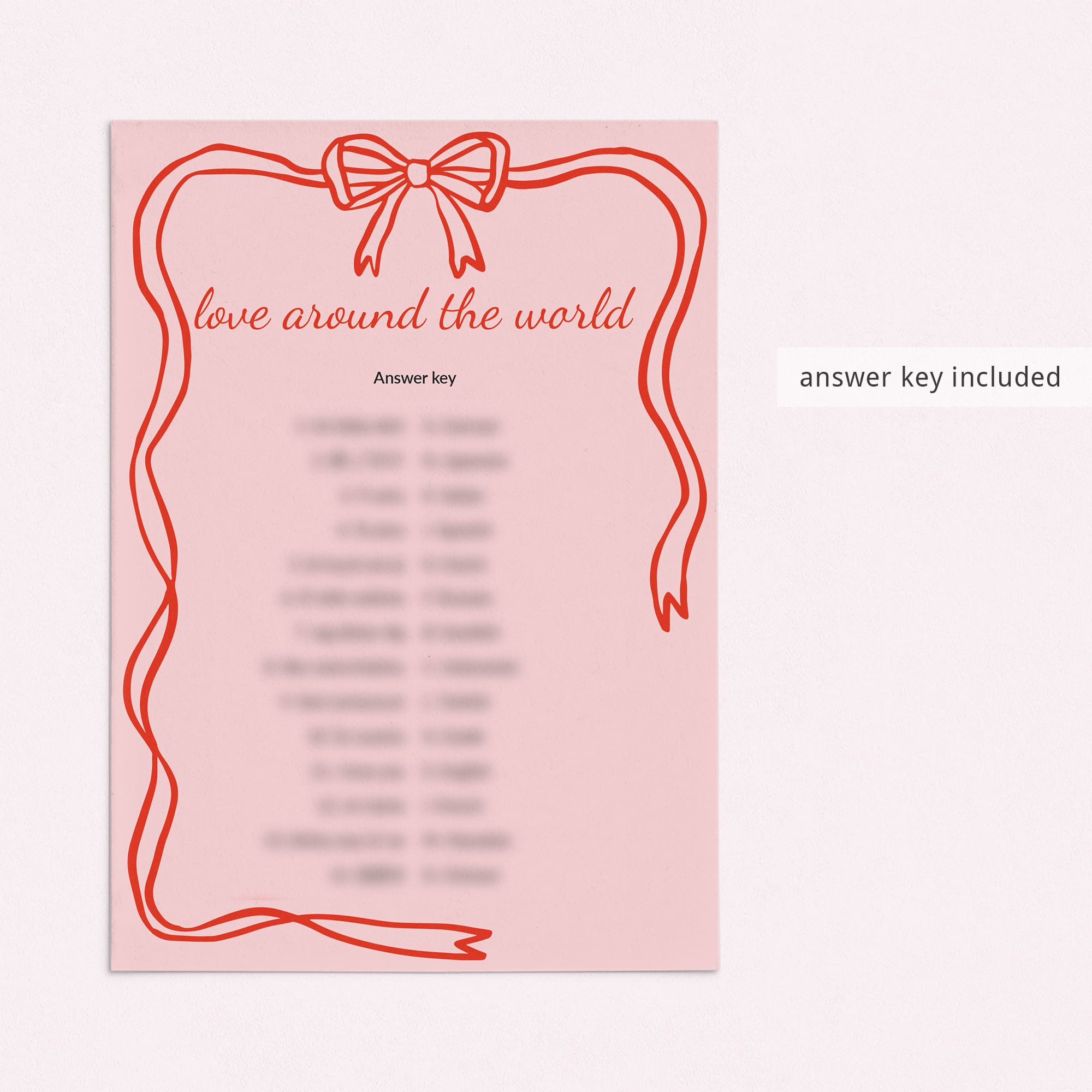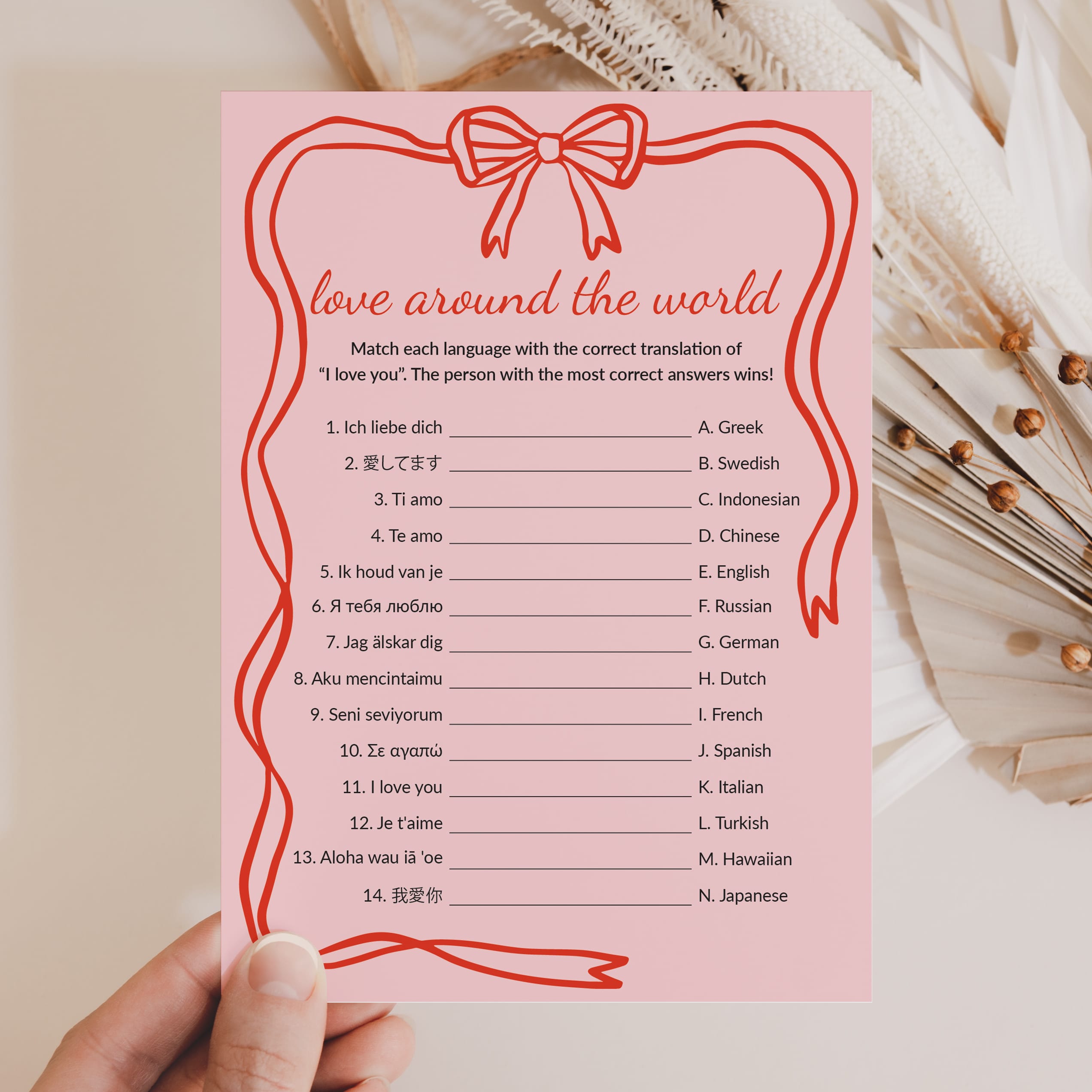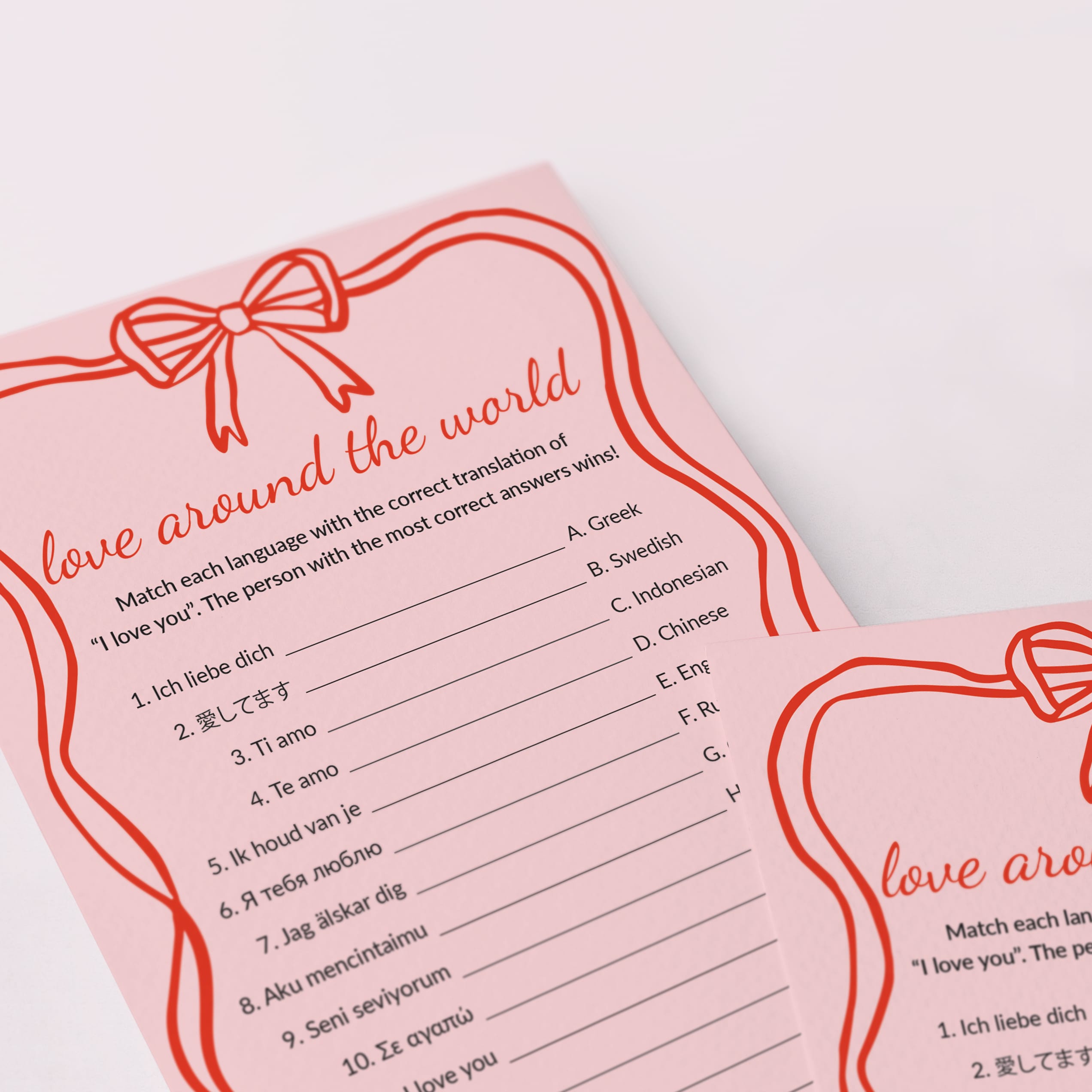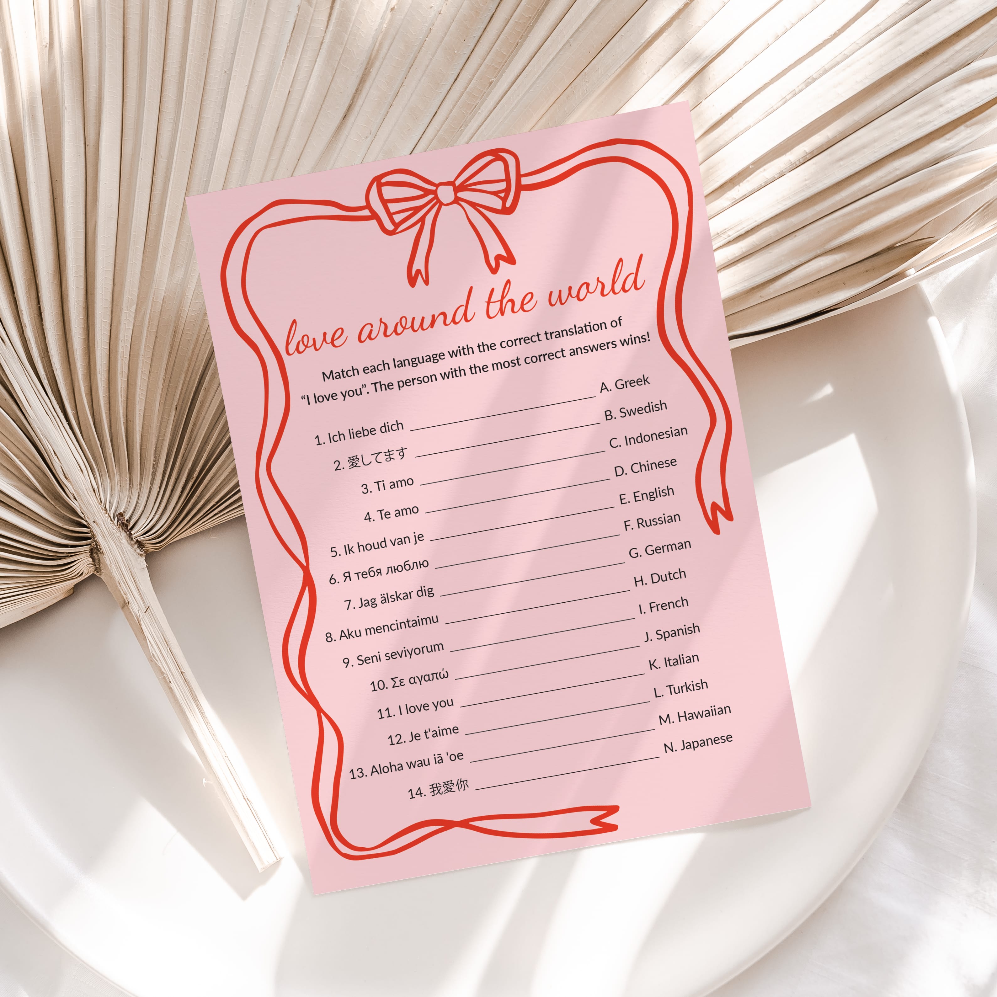 The game is very easy to play. Print and distribute these sweet Around The World game cards and a pen to each of your guests. They have to match each version of the words “I Love You” with its language of origin. The person with the most correct answers wins.