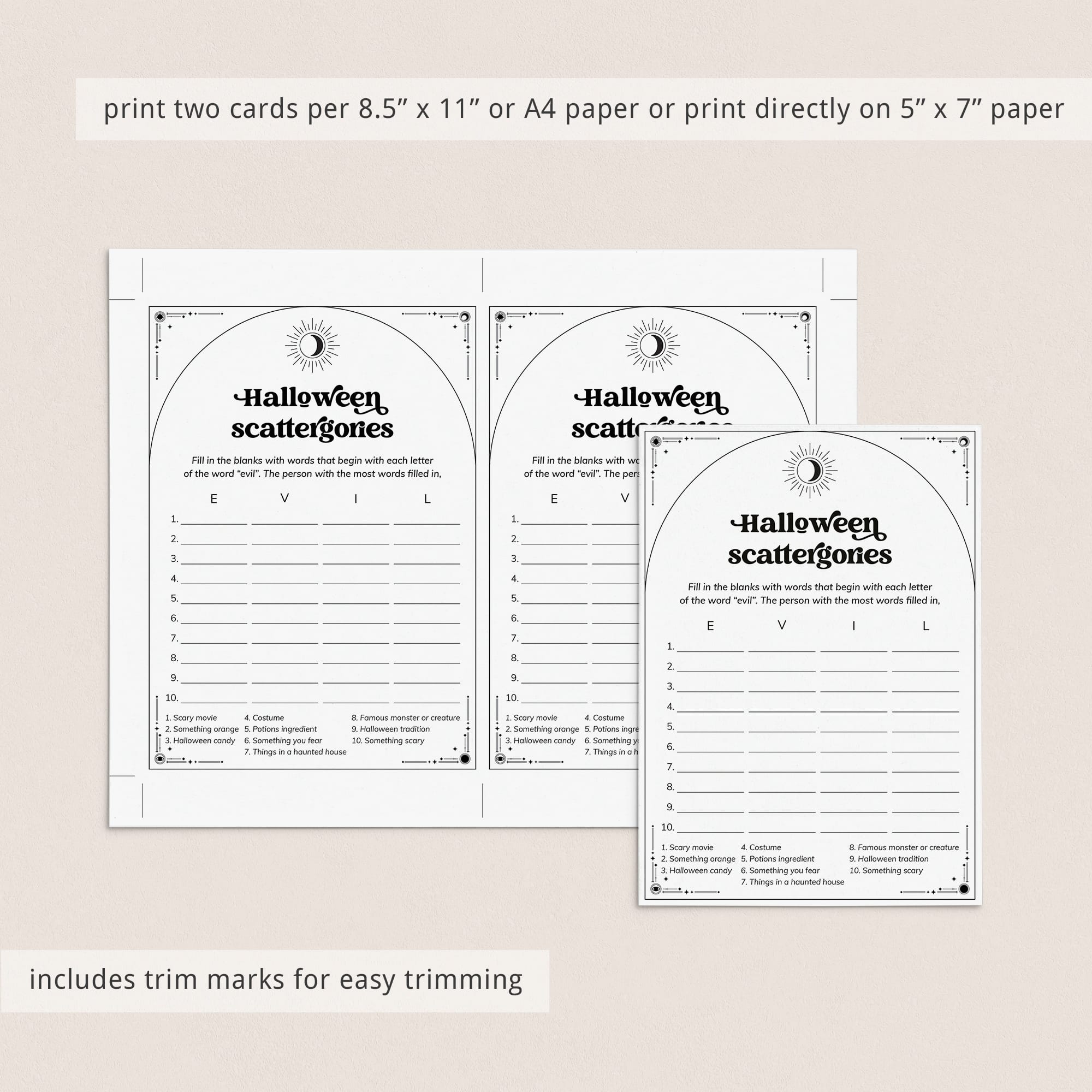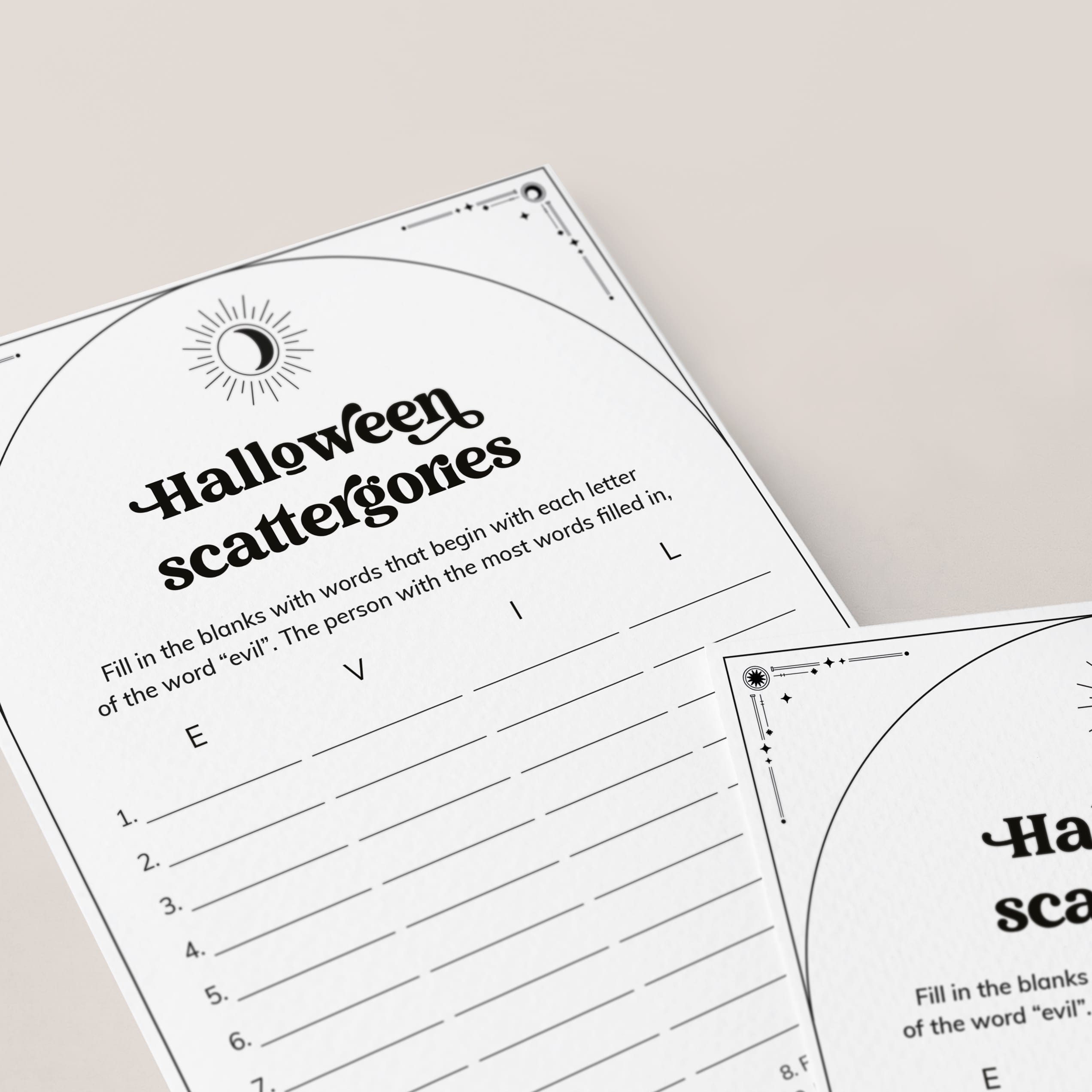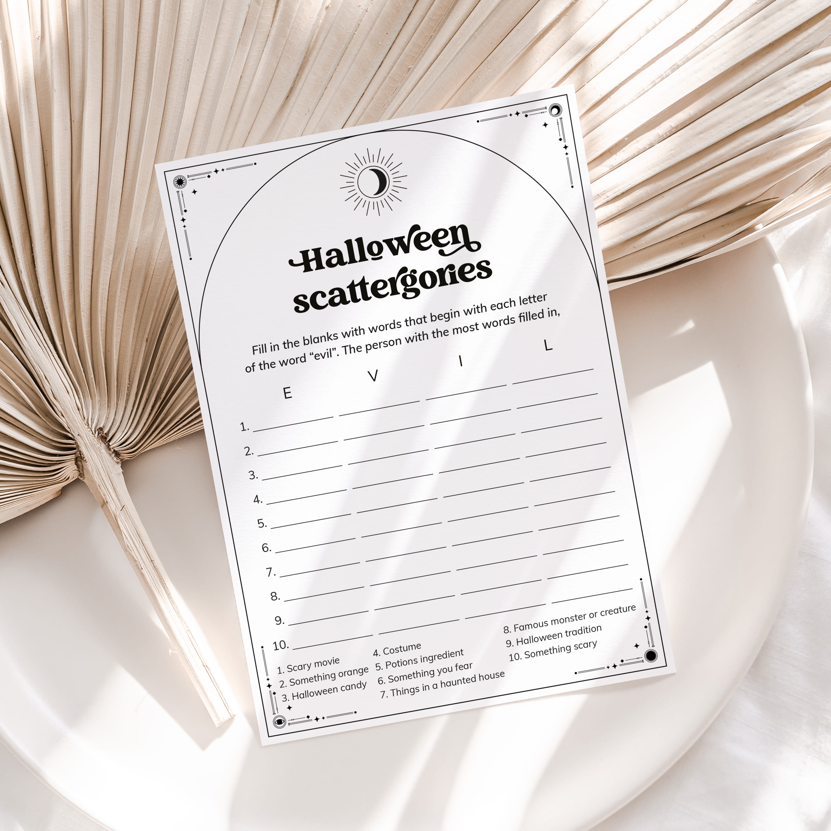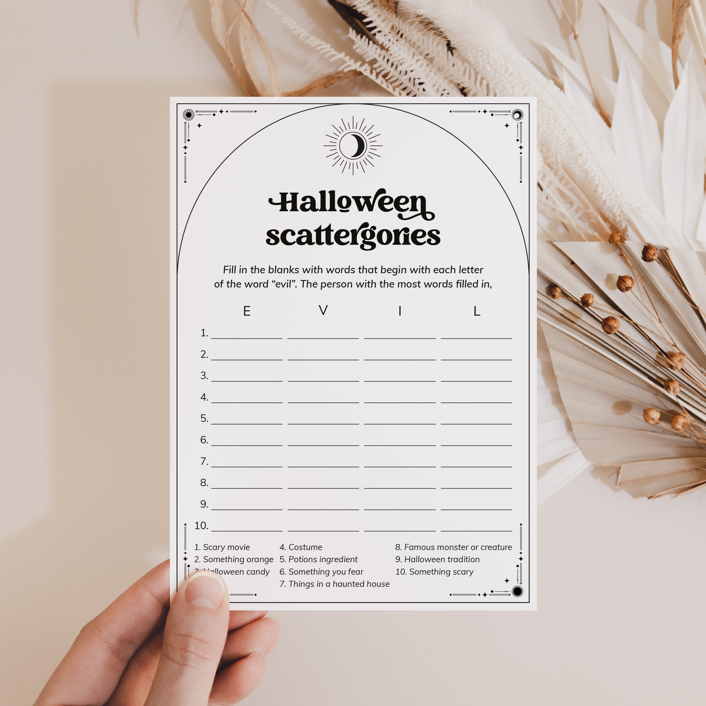 How many words can you fill in with the letters "E", "V", "I" and "L"? Play Scattergories at your Halloween party with this black and white celestial theme Halloween Scattergories game.