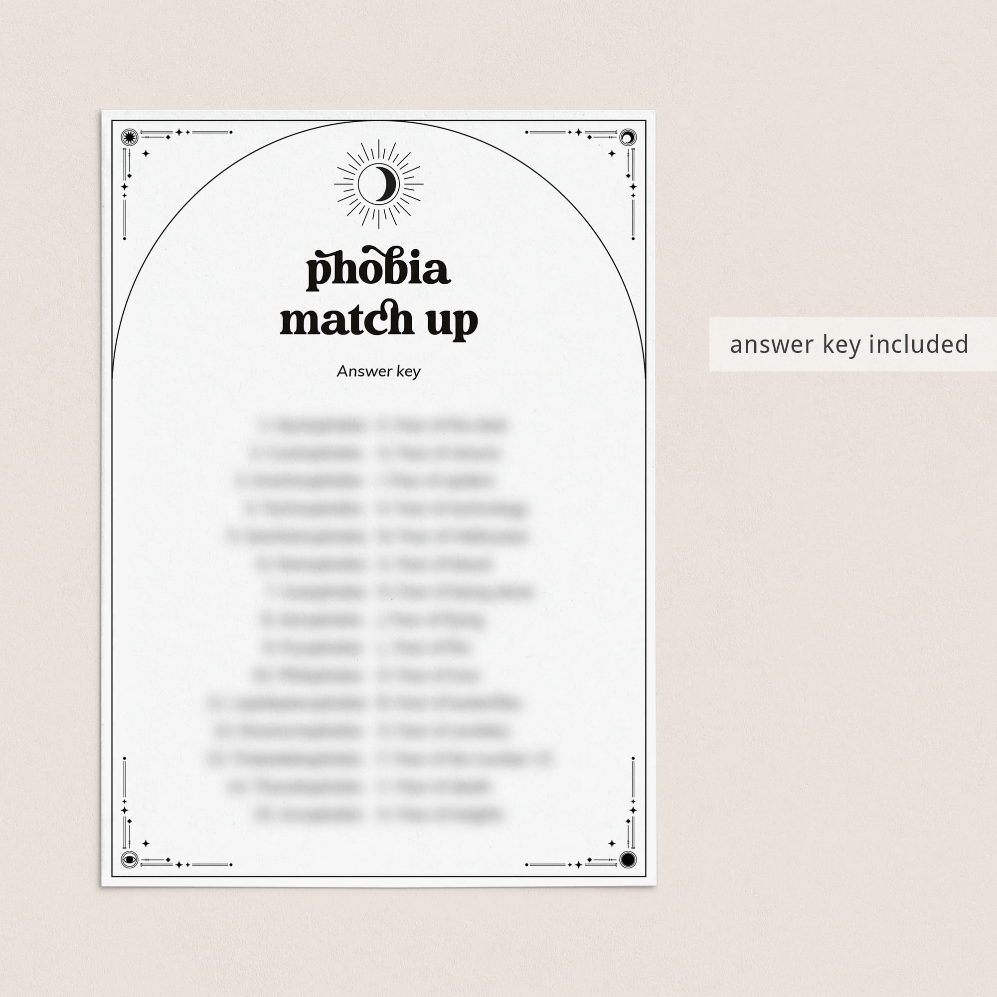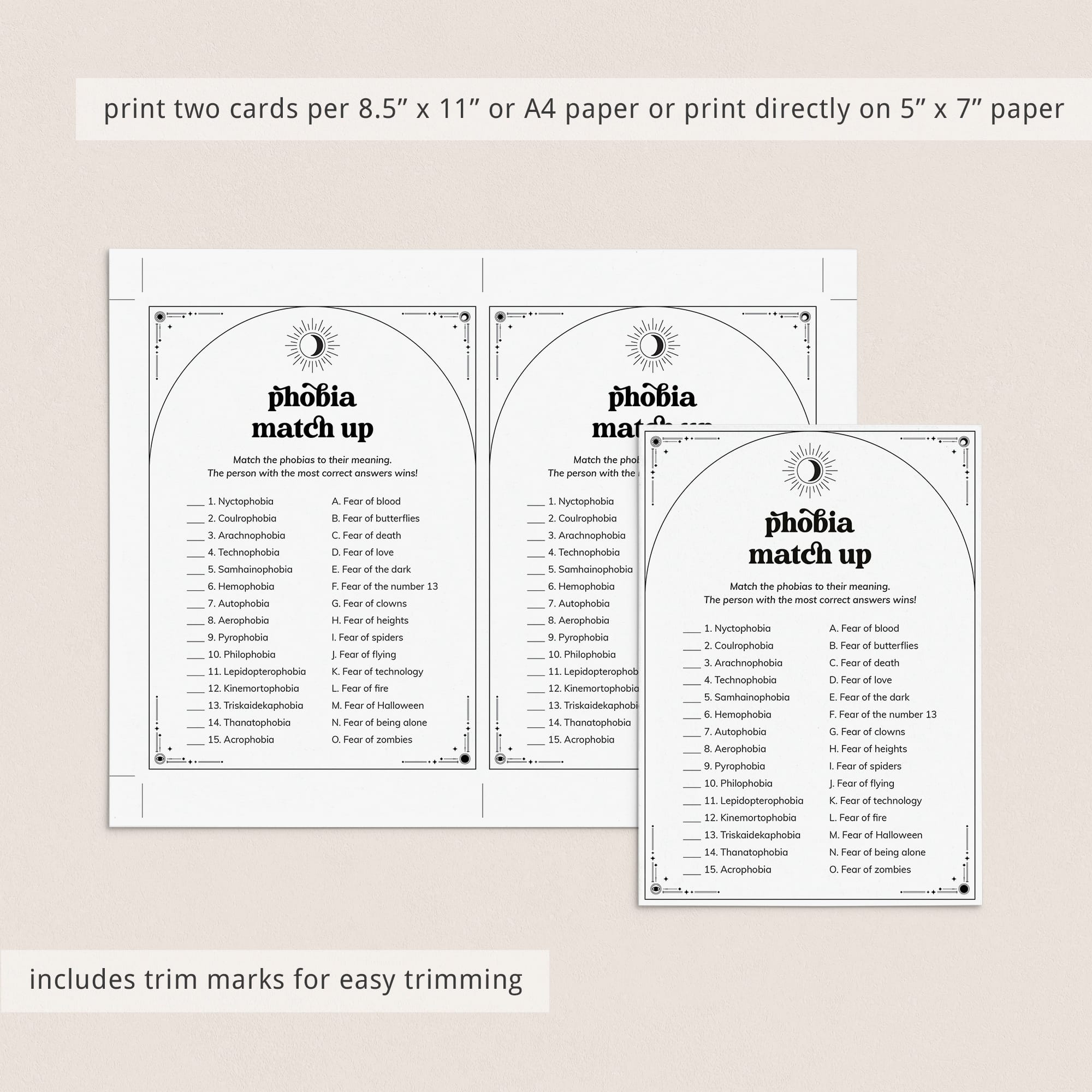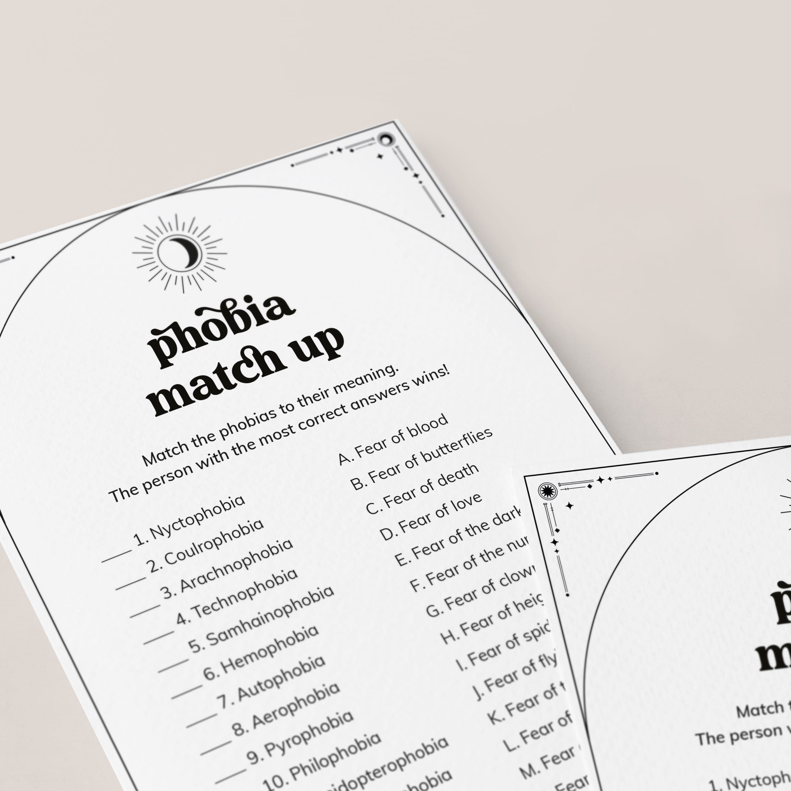 Are you looking for a fun game to play at your Halloween party? Play Phobia Match Up with this black and white celestial theme Halloween game card. The game will be the perfect addition to a Witchy Halloween party.