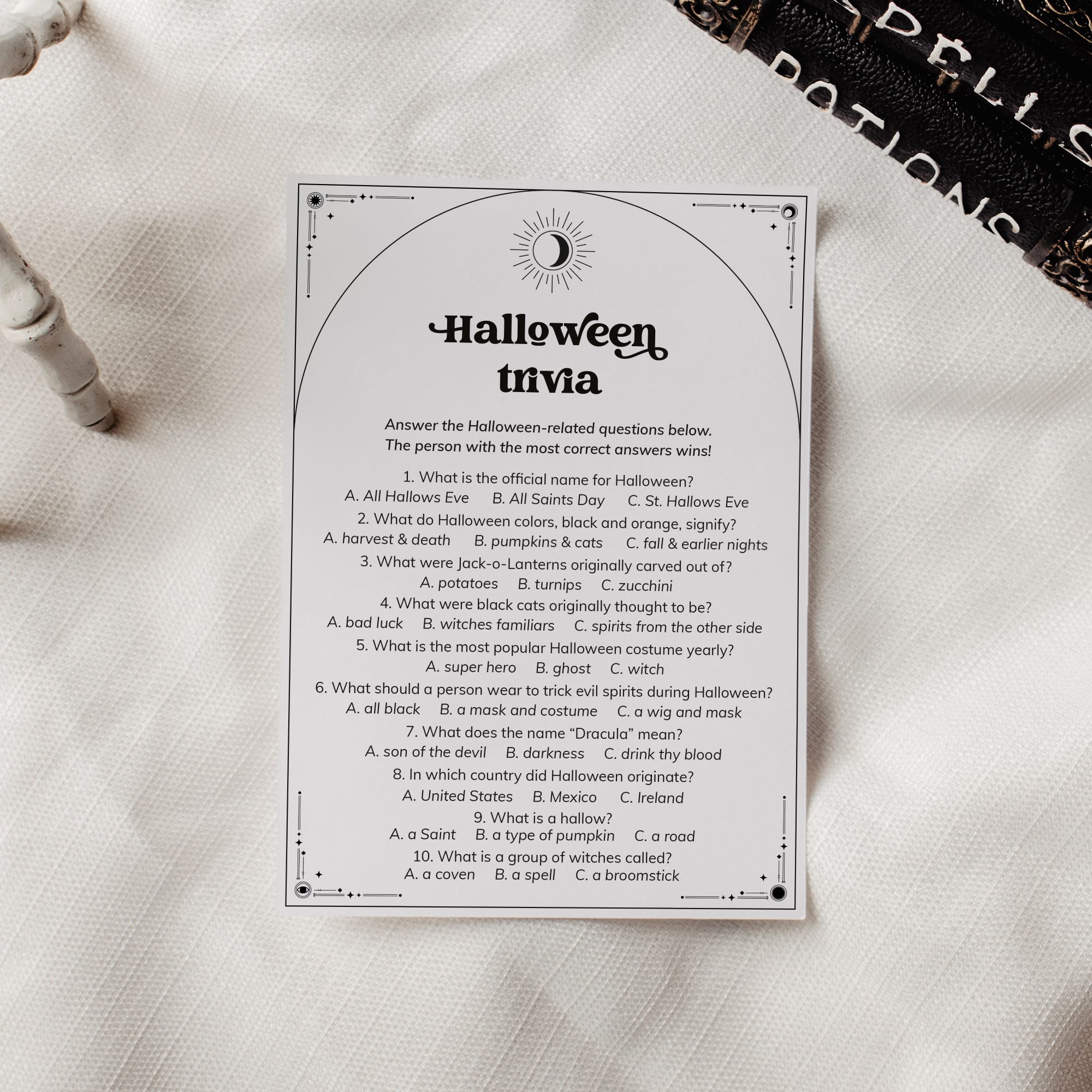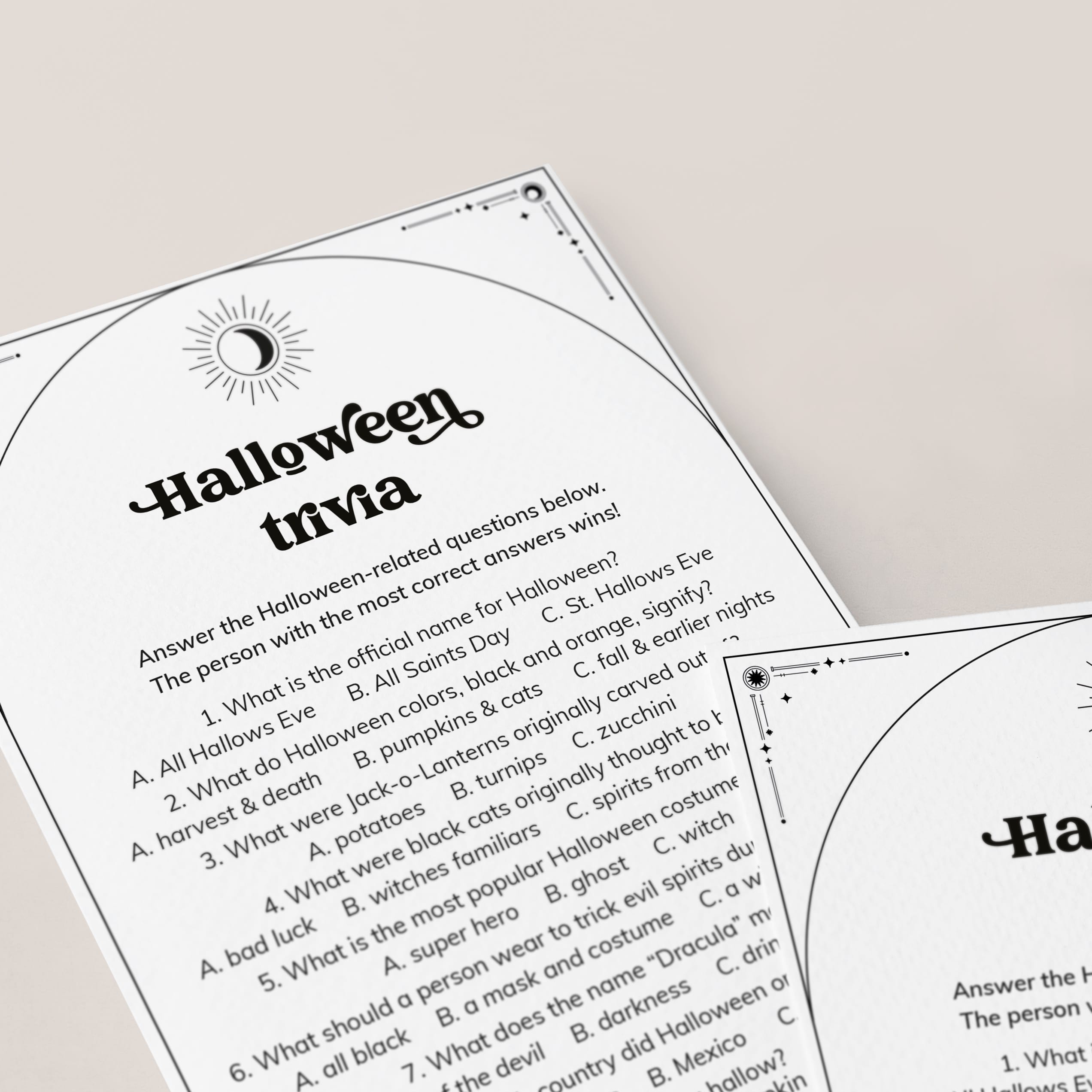 Are you hosting a celestial theme Halloween party? Use this printable Halloween Trivia Game with sun, moon and stars to test your guests Halloween knowledge. What is the most popular Halloween costume? And what do the Halloween colors, orange and black, signify? Play this fun Halloween trivia game to find out! It’s a great challenging Halloween game for both adults and kids.