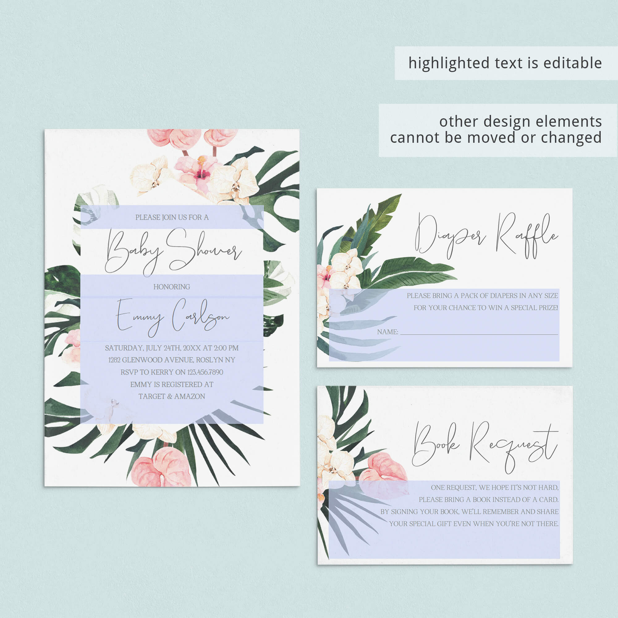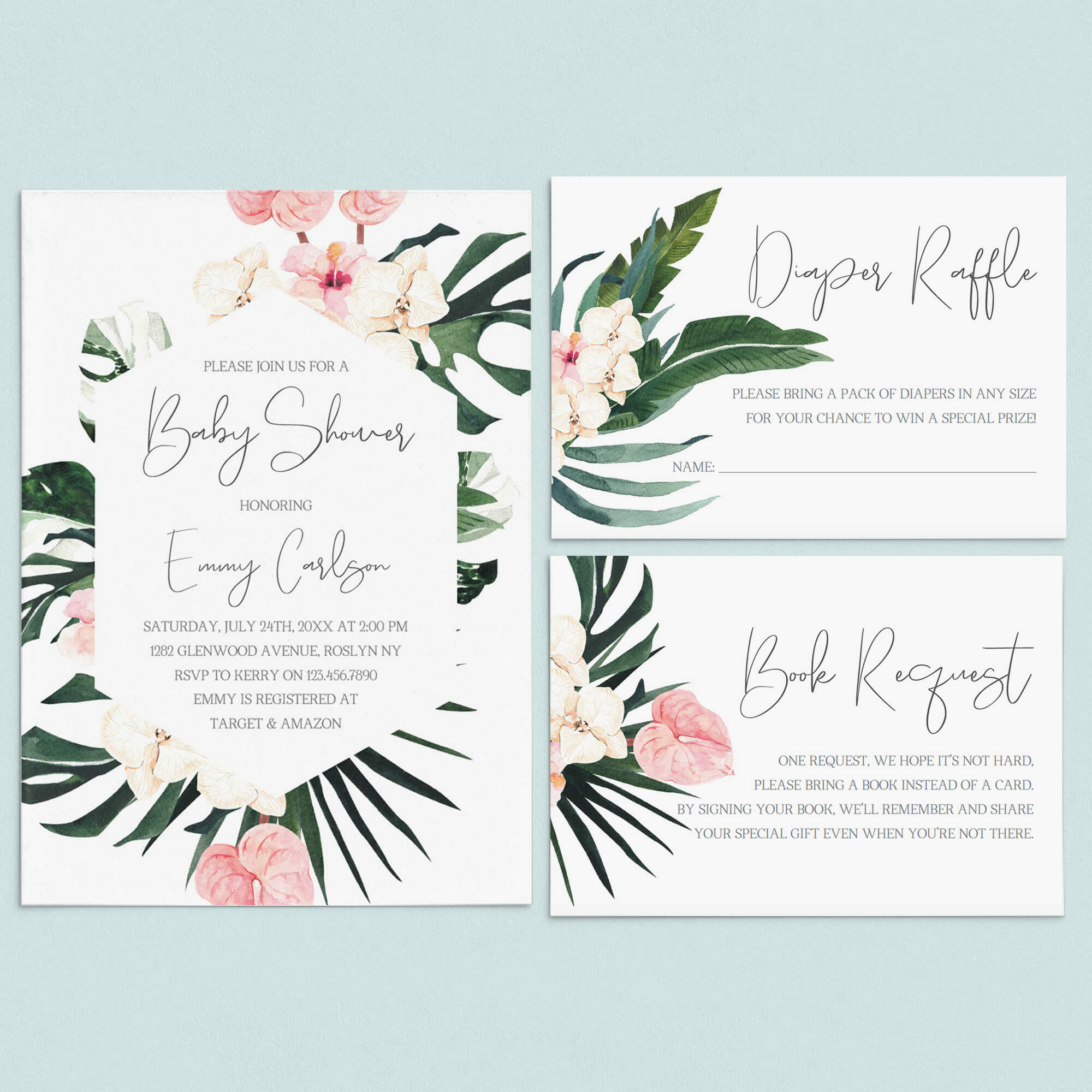 Are you hosting a botanical baby shower? Invite your guests in style with these botanical baby shower invitation and inserts. With its watercolor floral arrangements and botanical leaves, this invitation kit is perfect for a summer baby shower and will make all your guests excited for the party!
