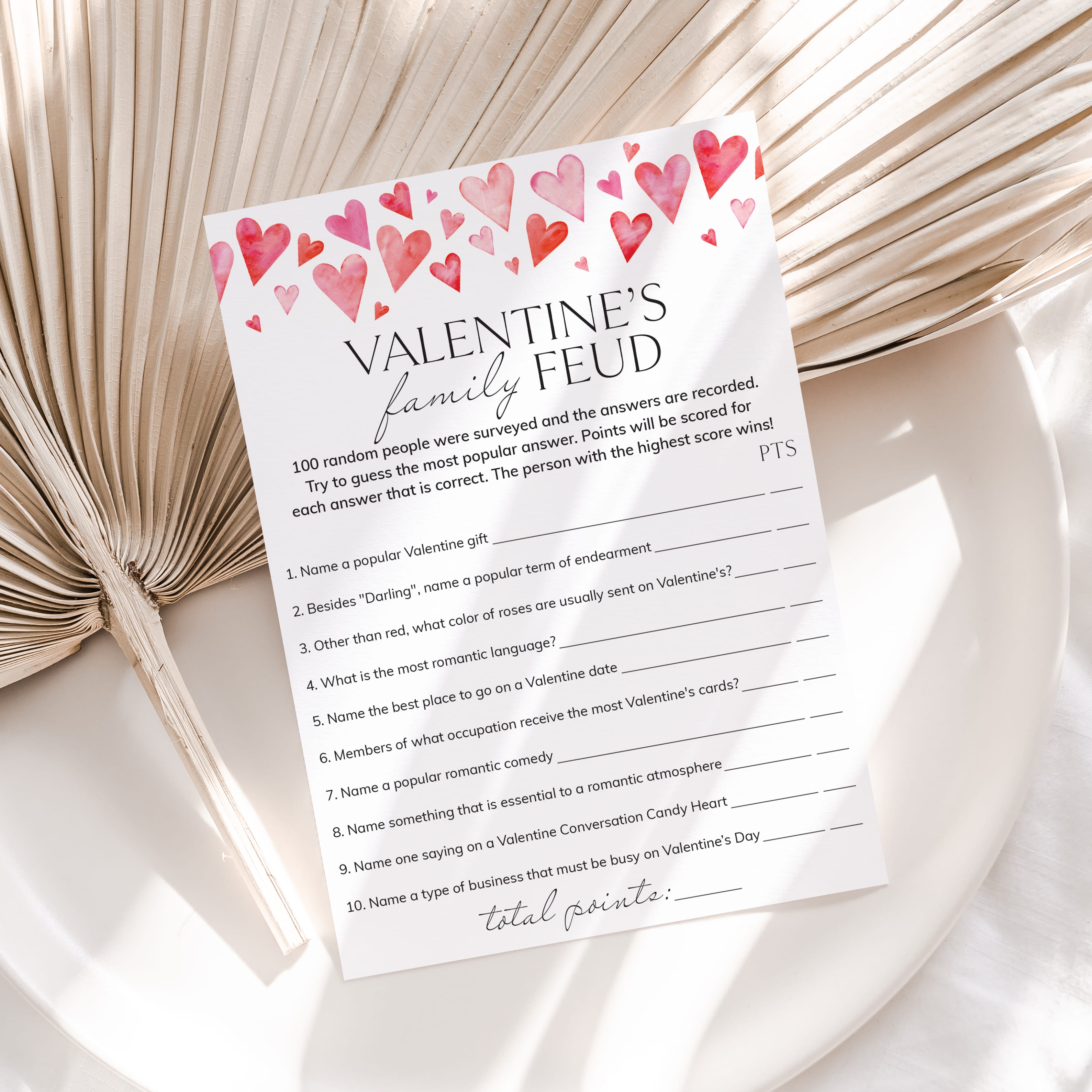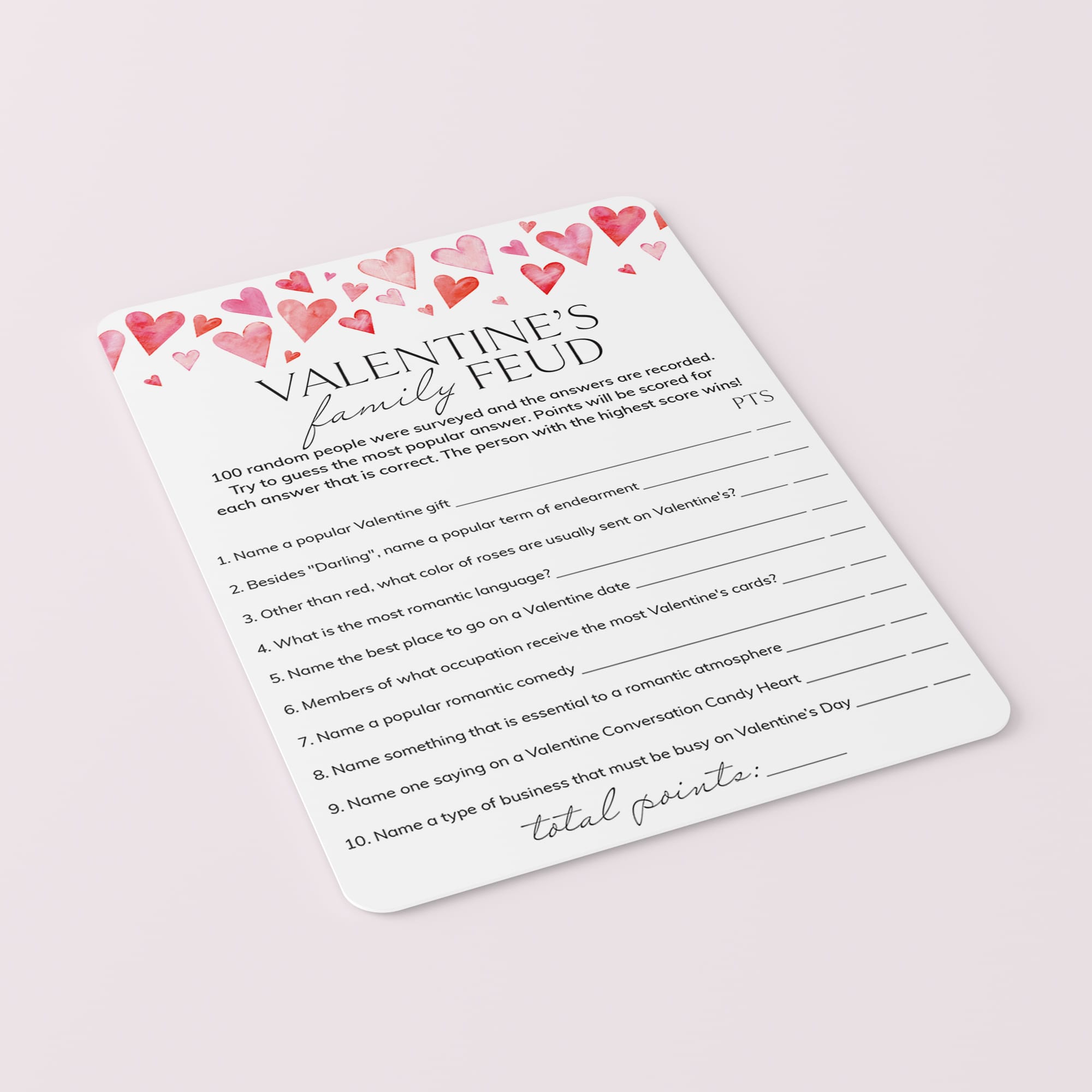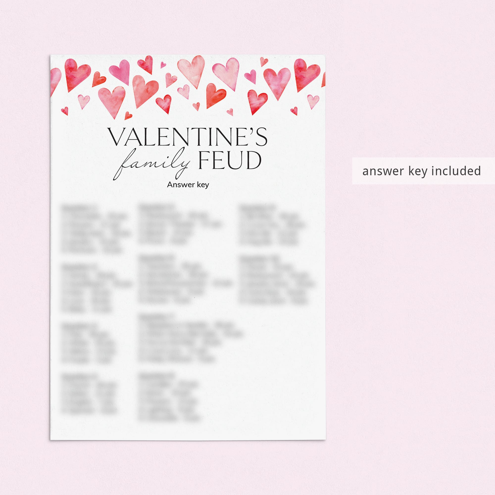 Are you looking for a fun game to play at your Valentine's Day party? Play Valentine's Feud with these cute Family Feud game cards featuring watercolor pink hearts!