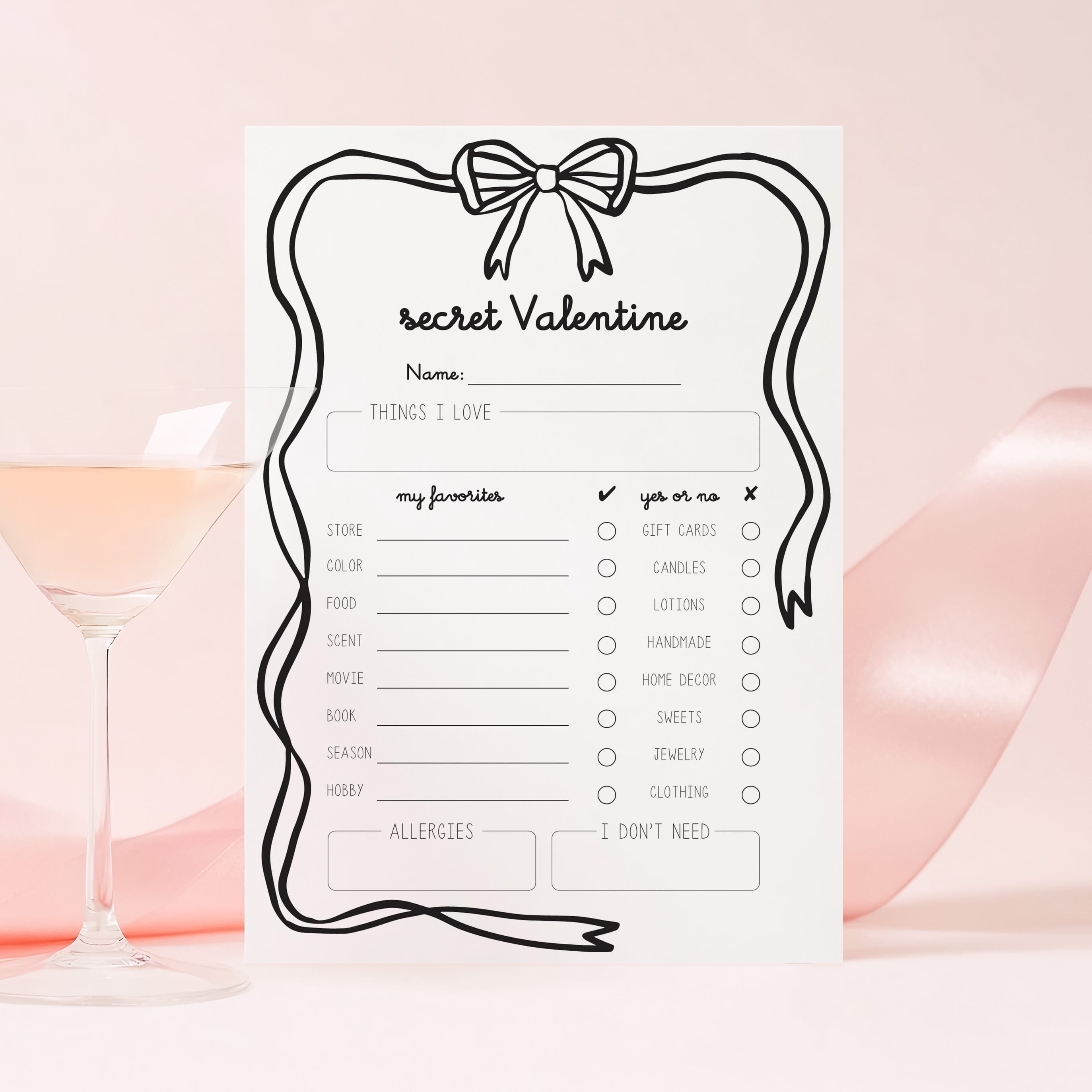 Make your Secret Valentine gift exchange extra sweet with this charming Secret Valentine Questionnaire. Designed with a playful wavy border topped with a sweet black bow, it adds a fun and festive touch to any Valentine’s celebration.