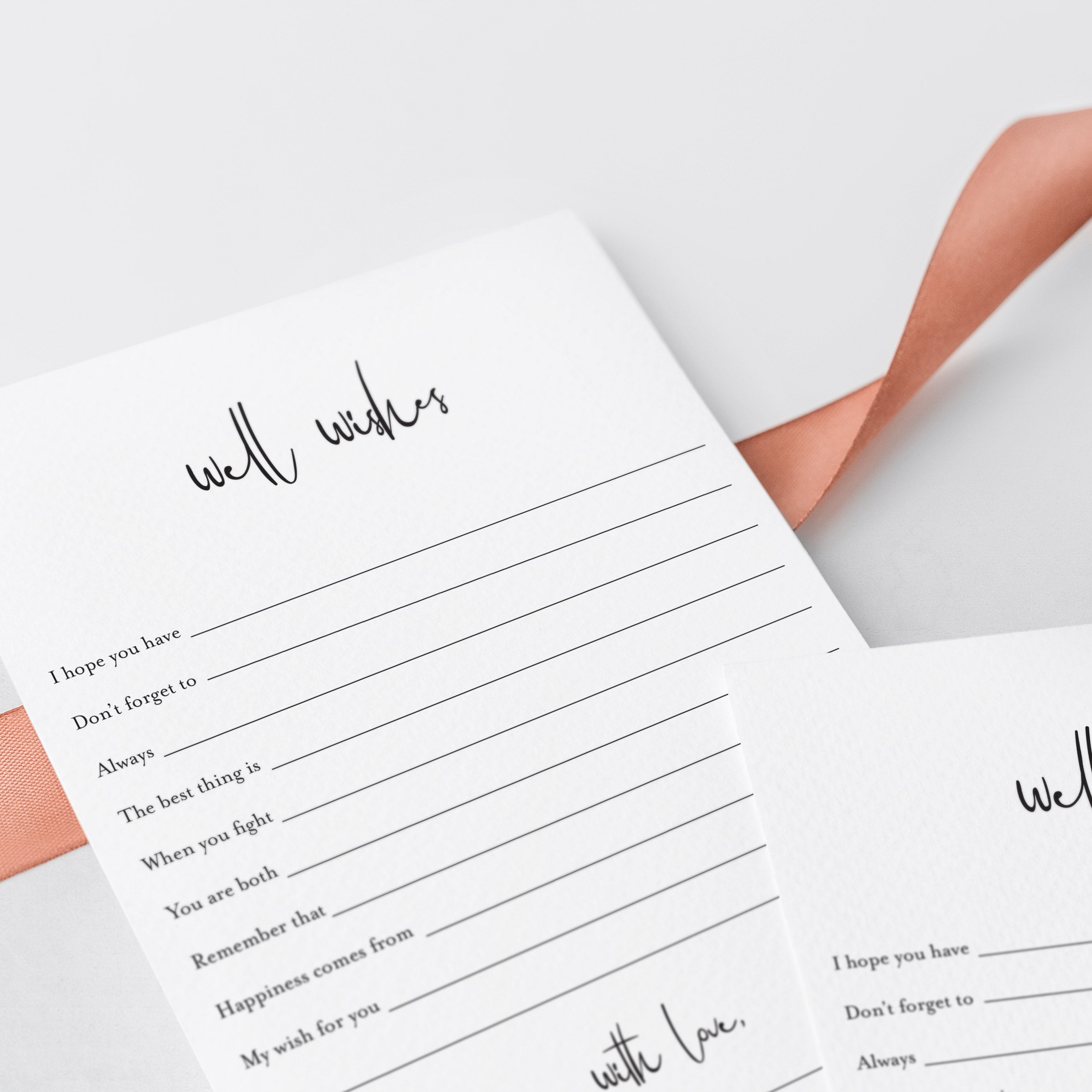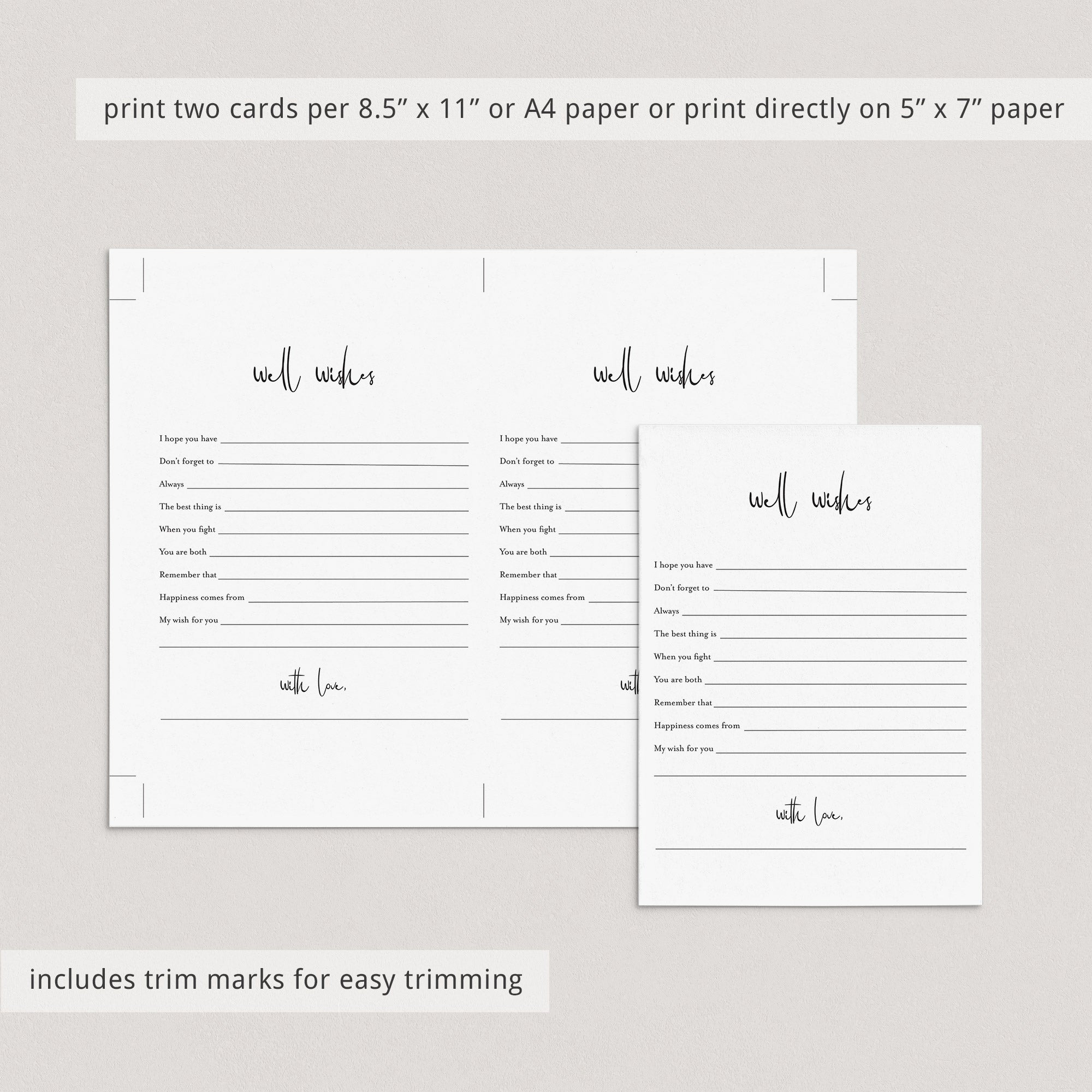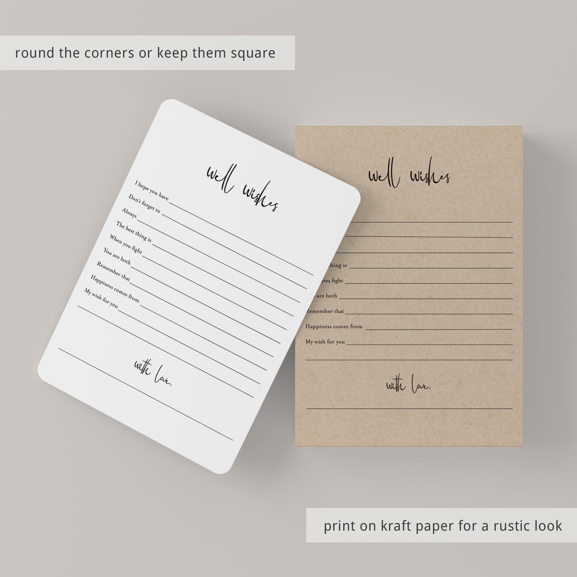 Print the cards right from your computer in a matter of minutes or have them printed at your favorite print shop. The wishes card has been designed in black and white. You can print on kraft paper to create a rustic look or print on colored card stock to match your party color palette. We recommend printing on a nice heavy card stock for highest quality feel.