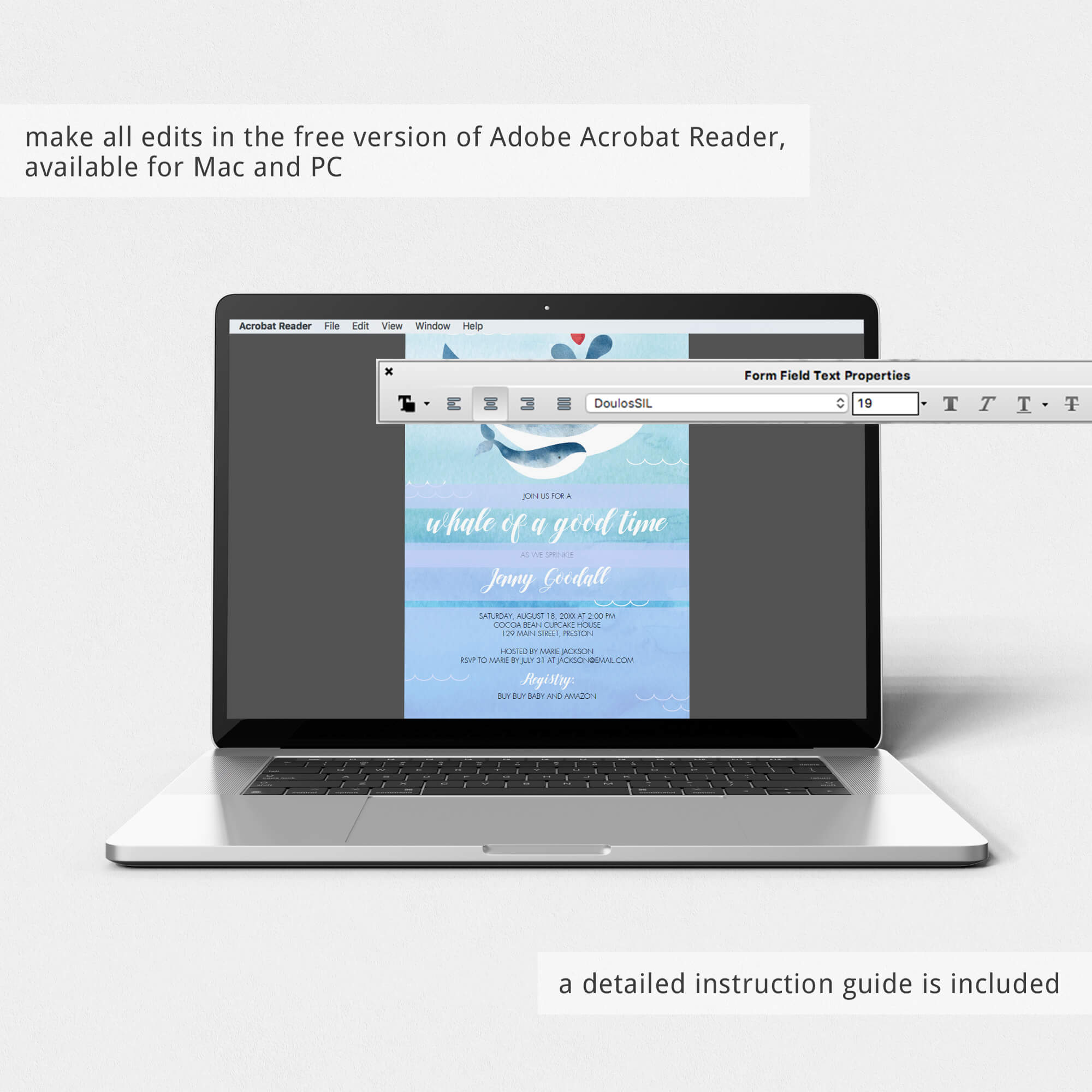 • 1 Editable PDF sized 5” x 7” to print or to use as evite