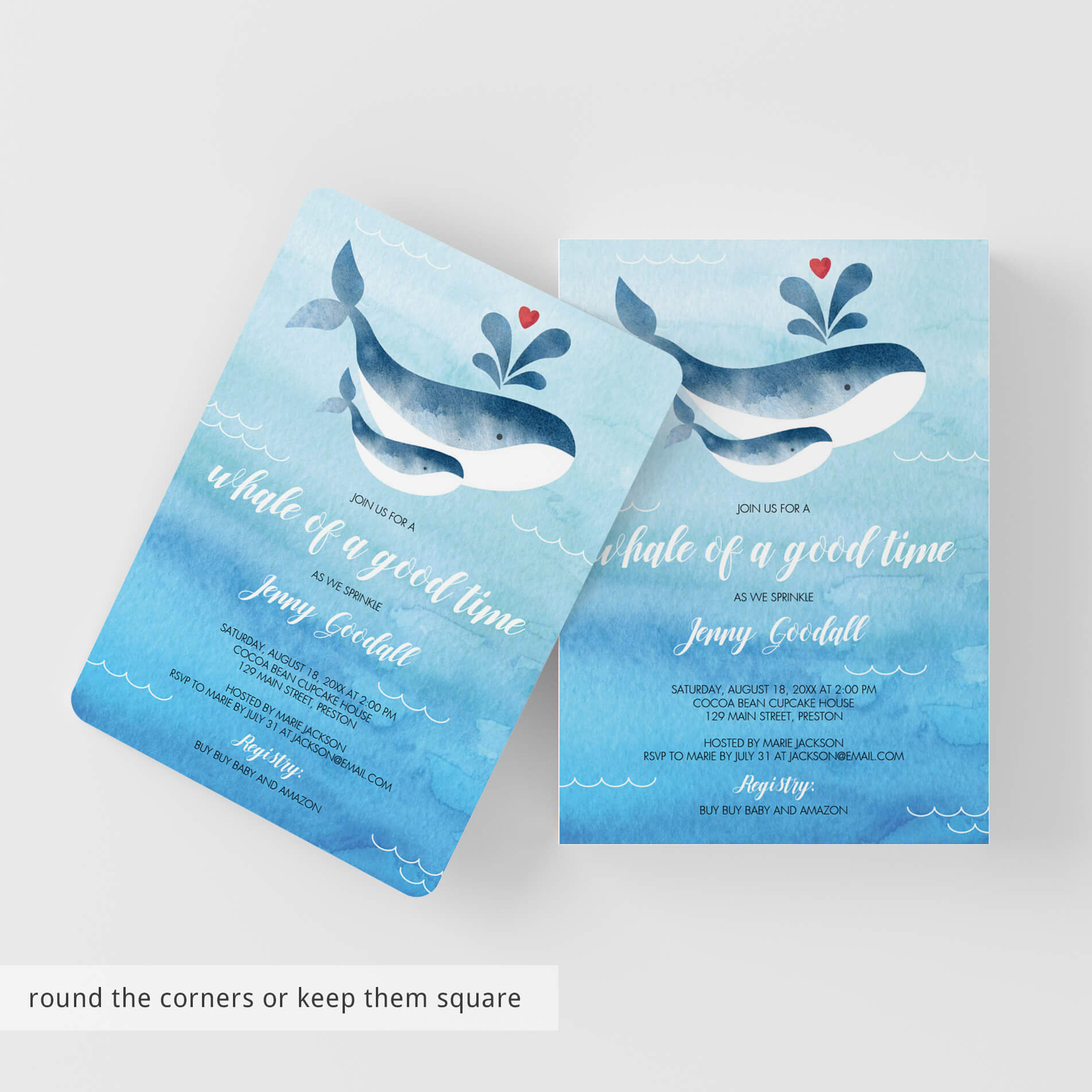 Celebrate the arrival of a baby brother and invite your guests for a 'whale of a good time' with this blue baby sprinkle invitation with mommy and baby whale. With it's shades of navy, blue and aqua you will make the perfect announcement of an adorable boy baby sprinkle.