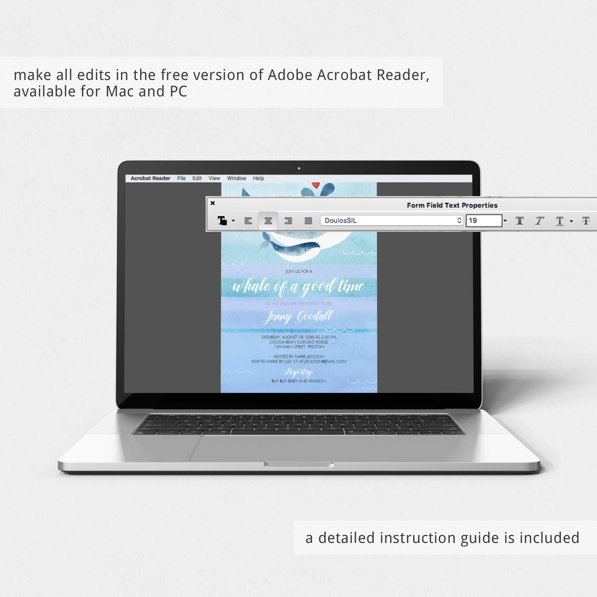 This baby shower invitation template is editable in Adobe Acrobat Reader (free download). After downloading the file, fill in your details and print in just minutes. We've included our detailed instruction guide to make the process super smooth.