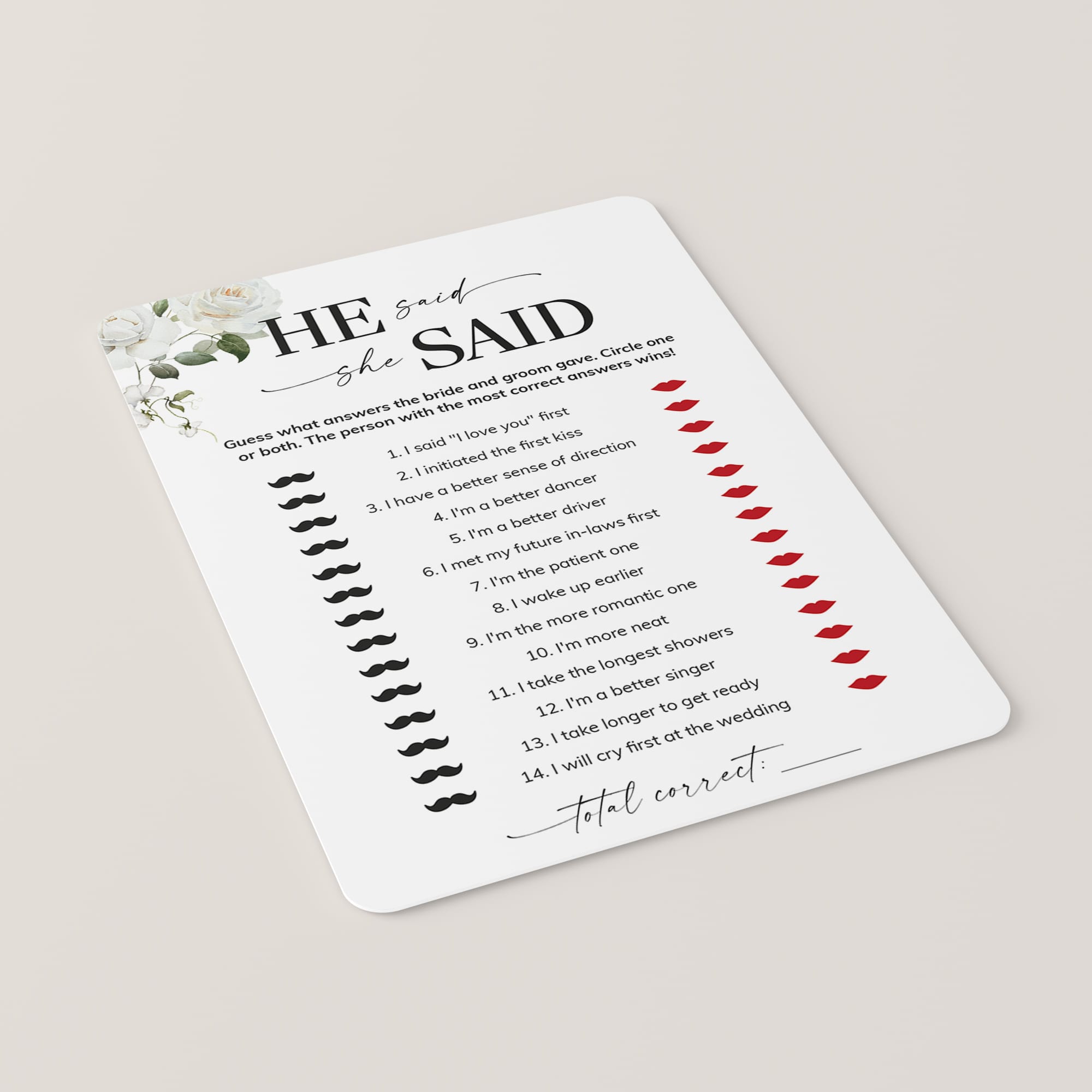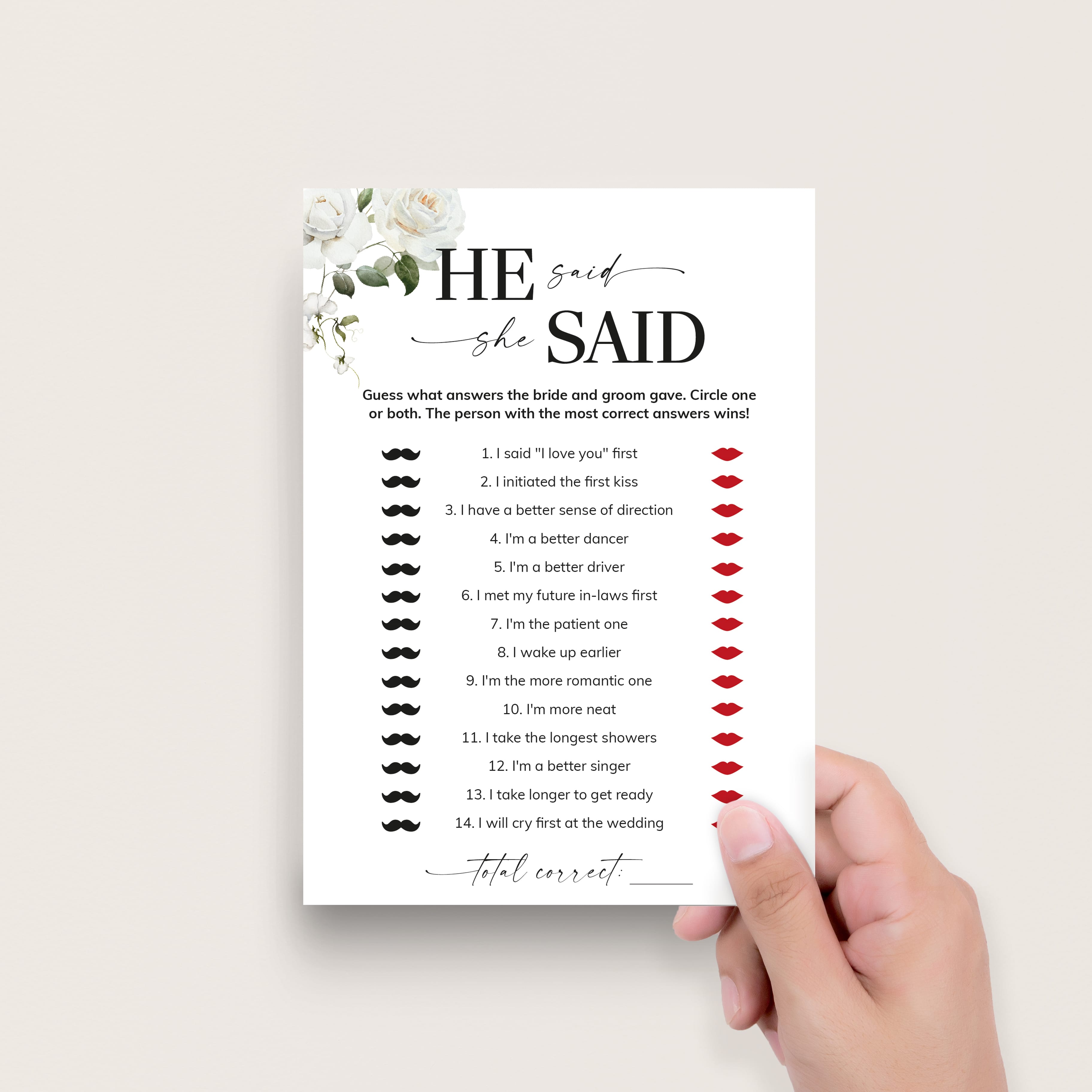 You can even make this game more lively and interactive by giving each guest their own set of lips and moustaches. As the host goes over the statements, everyone has to show their guess by holding up the lips or the moustache to their faces. Have the bride and groom reveal the answer by doing the same.