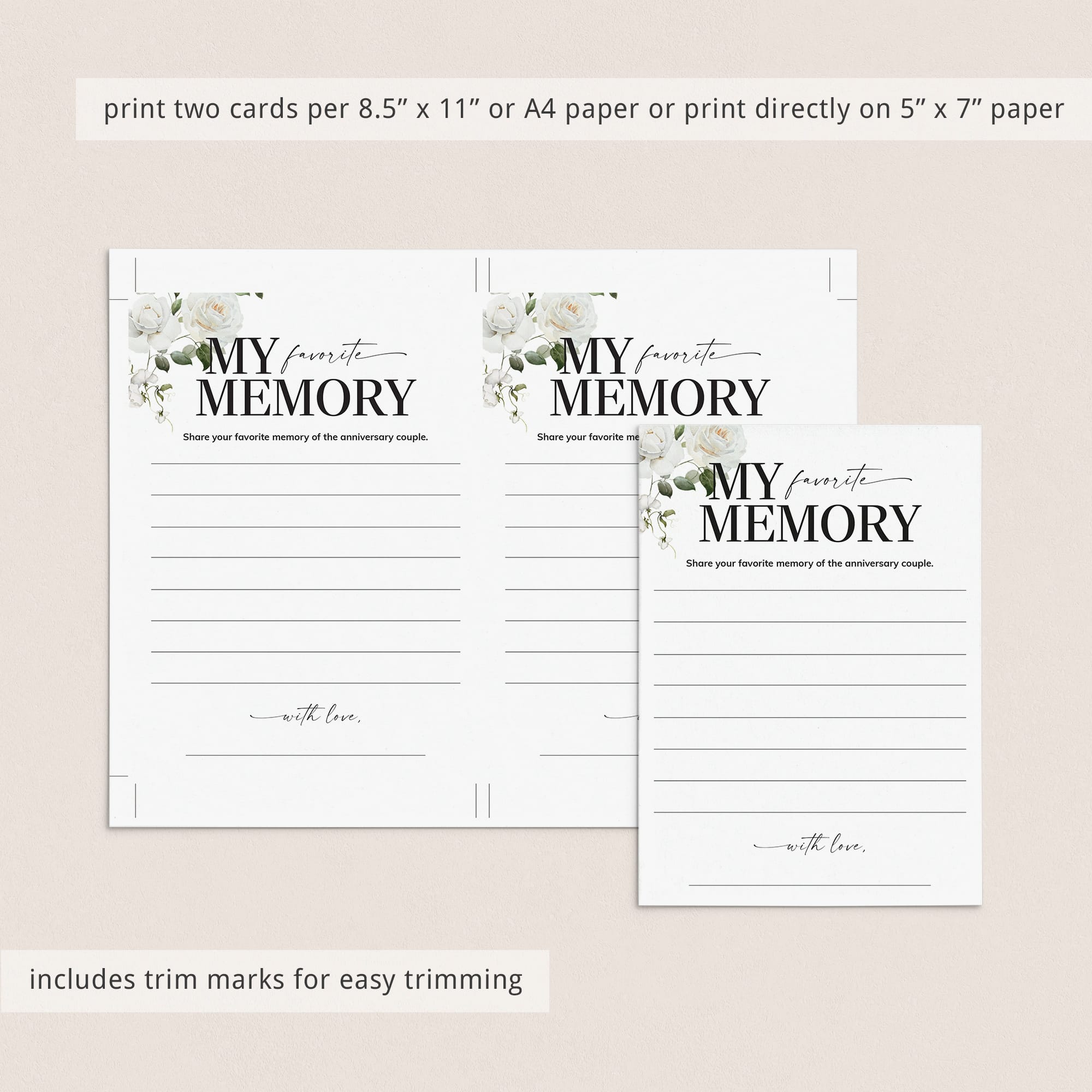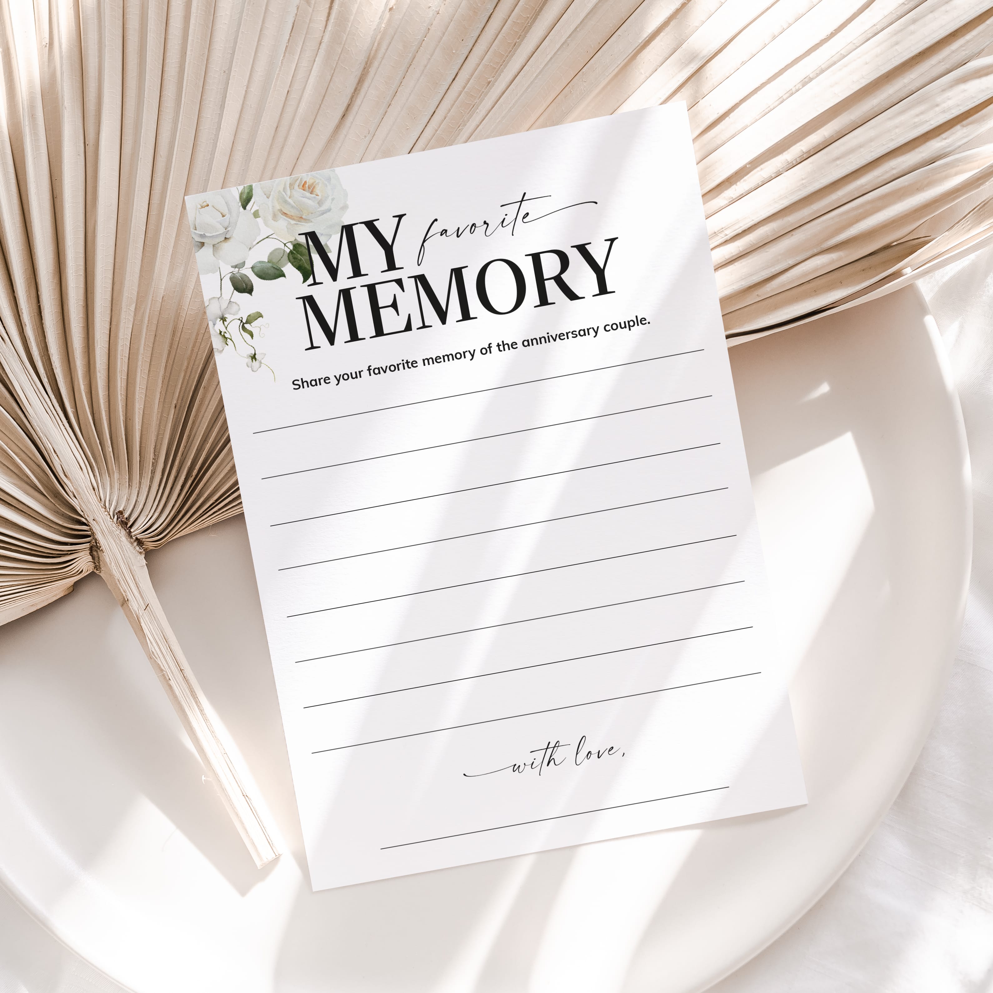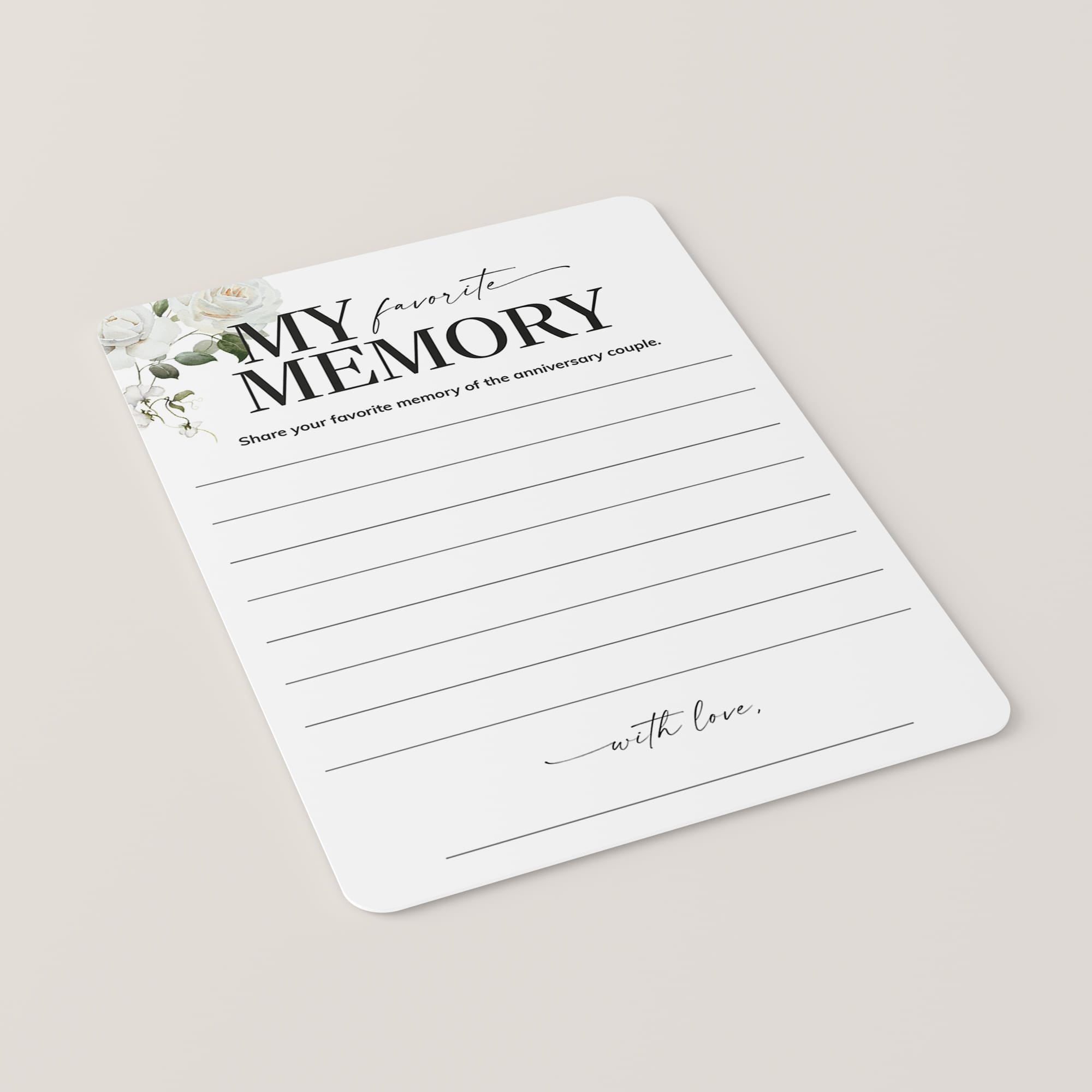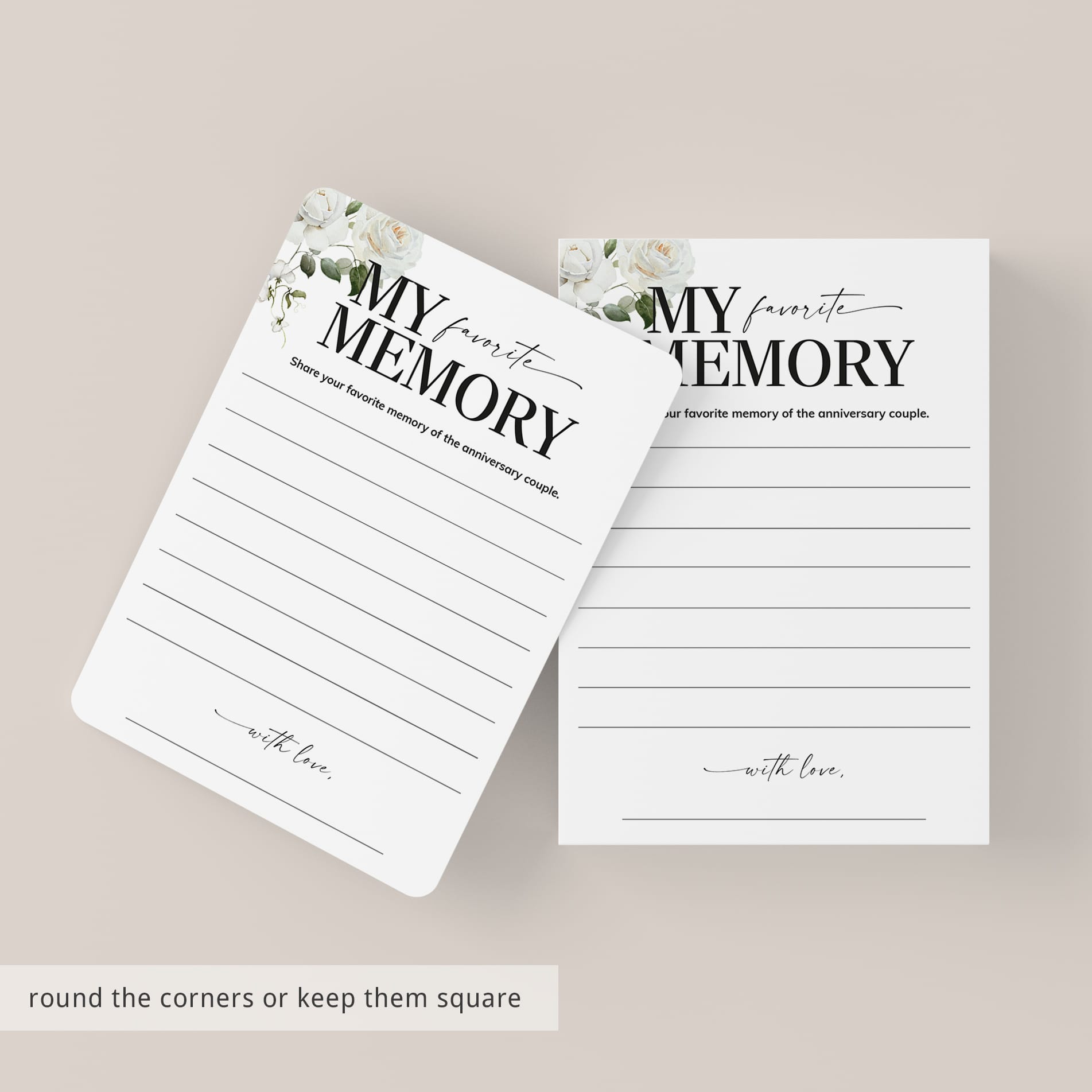 Are you looking for a memorable keepsake for an anniversary party? Have your guests share their Favorite Memory with the anniversary couple with these elegant white floral cards. It's the perfect addition to your anniversary party and sure to be a hit!