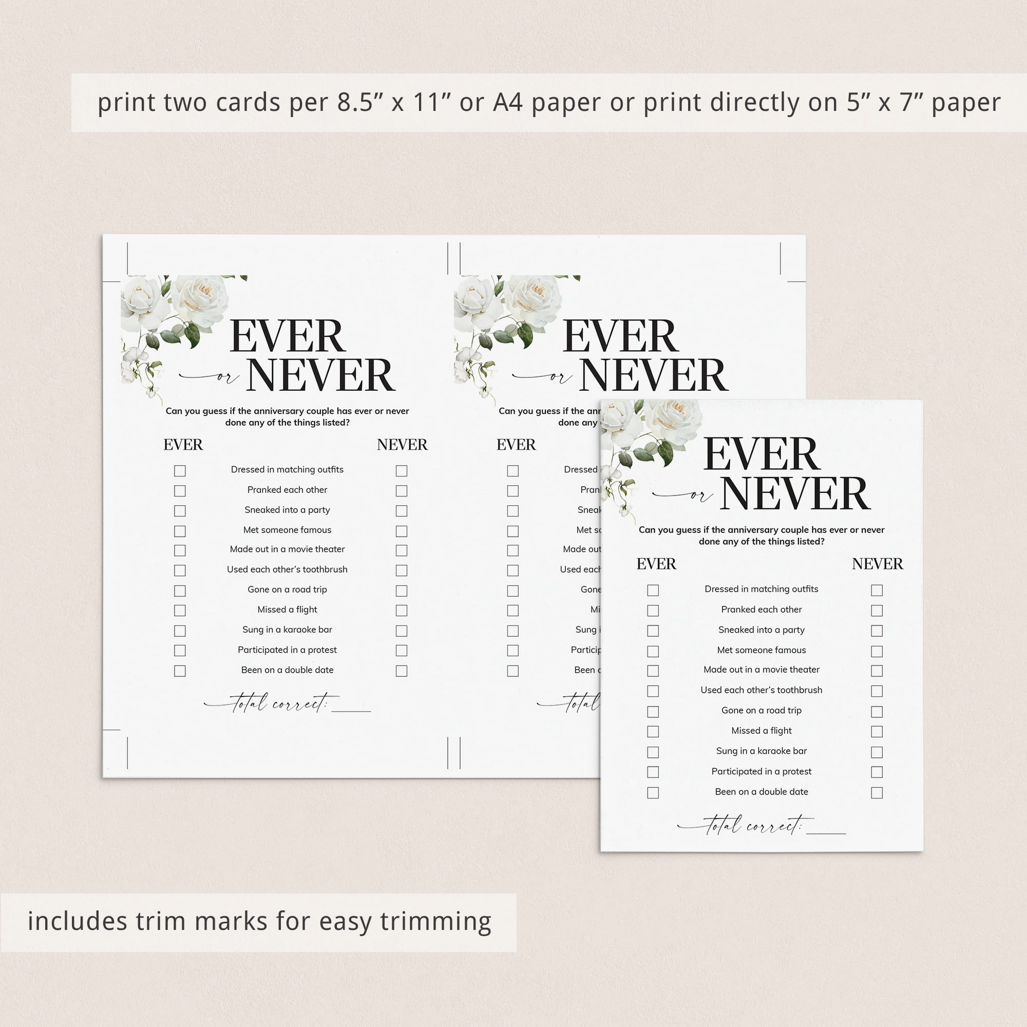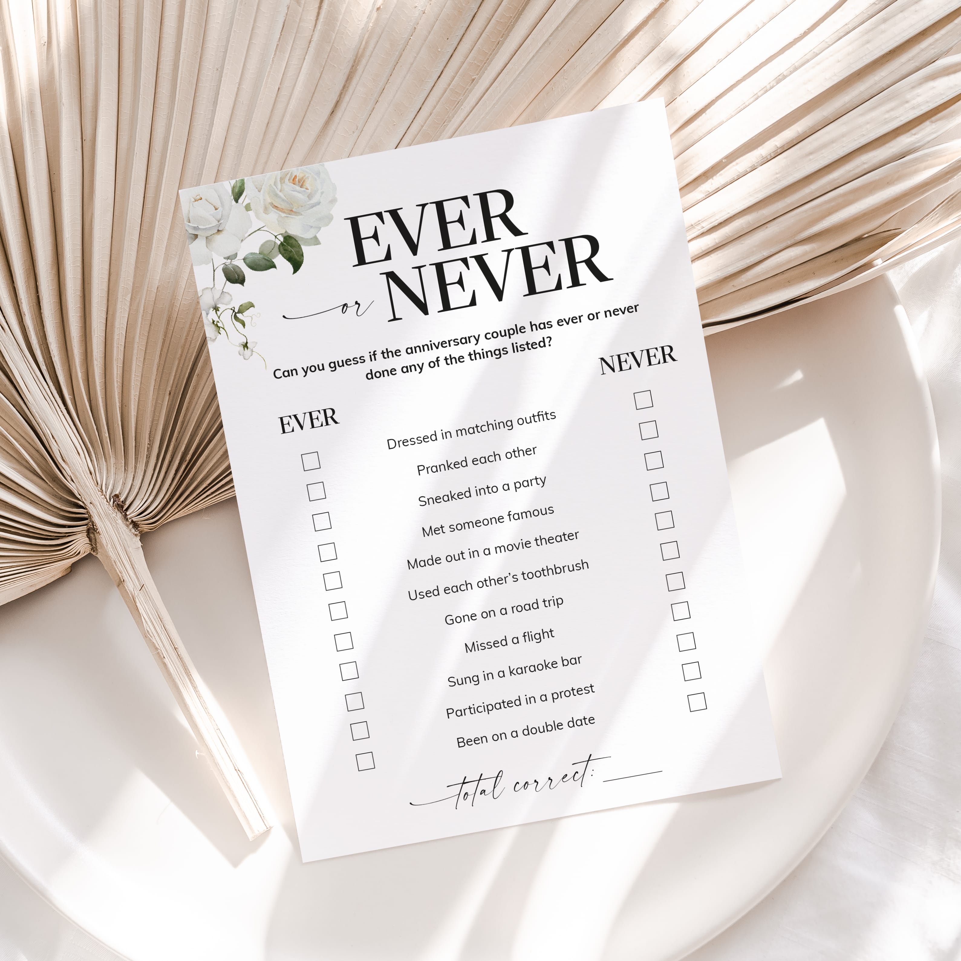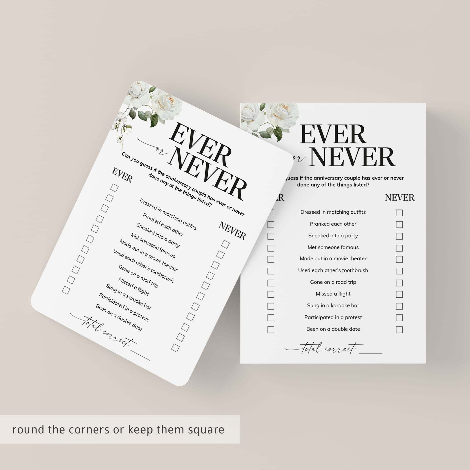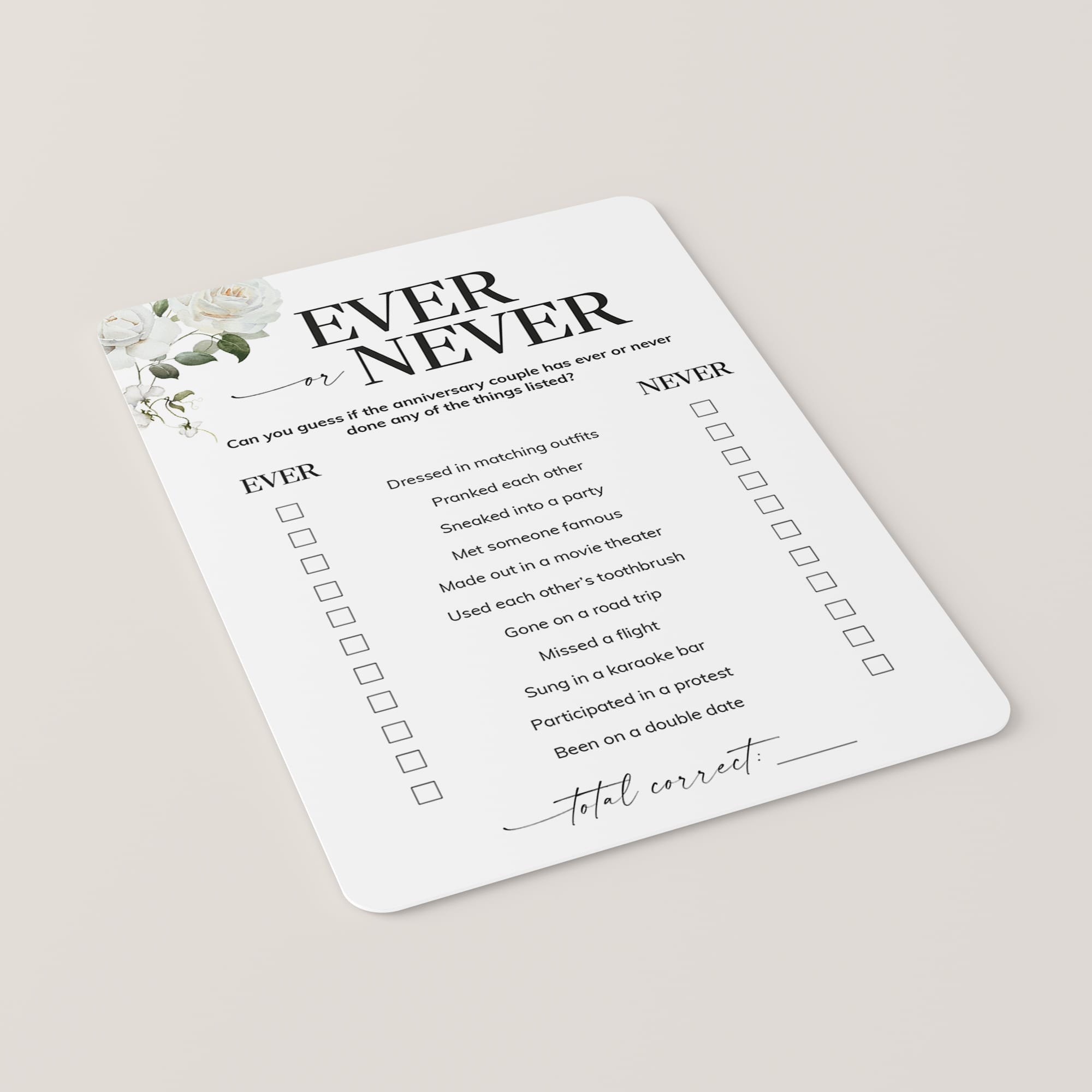 Have the couple fill out this elegant floral Ever or Never game card as an answer key before the party starts. Then compare their responses to what your guests guessed. The player with the most correct wins bragging rights.