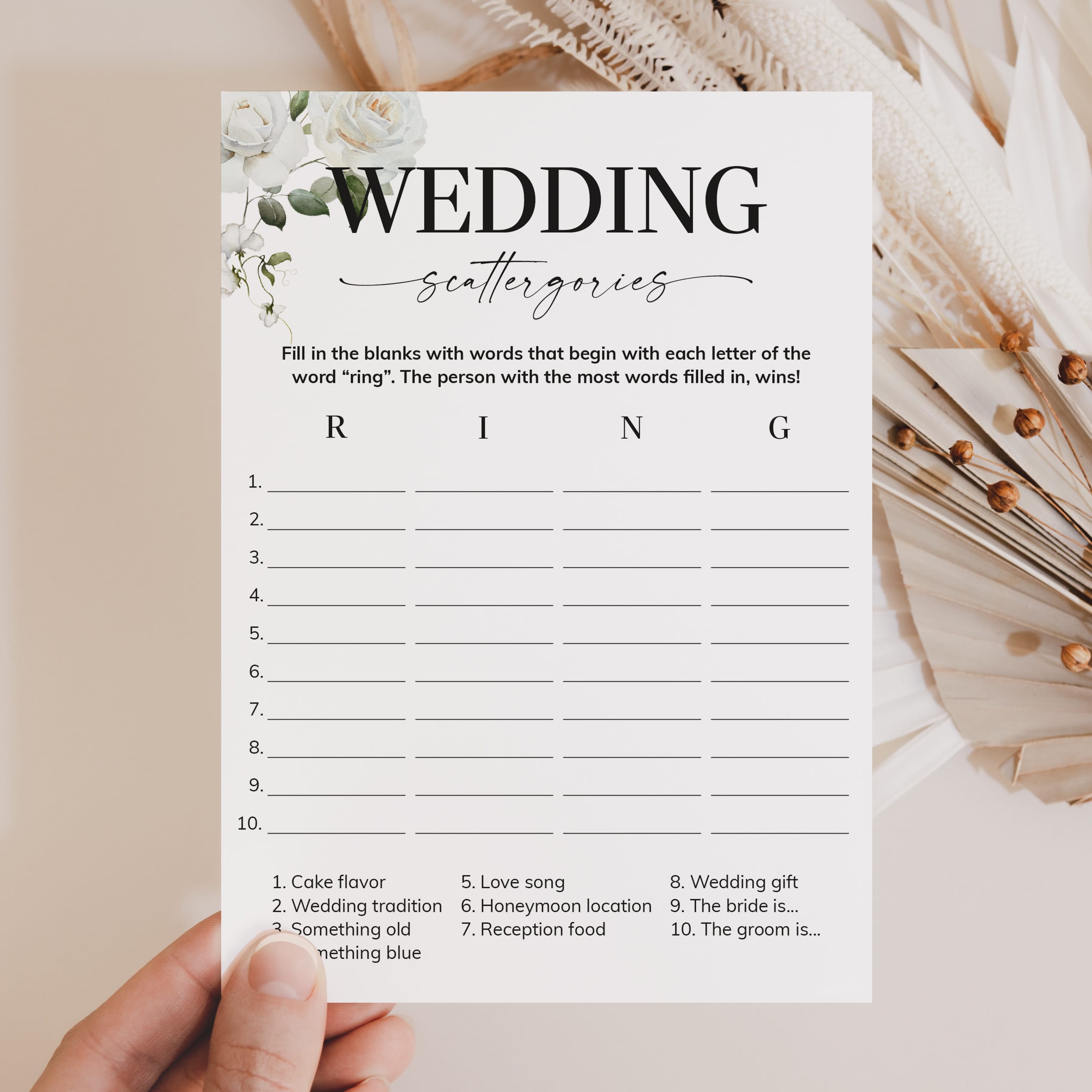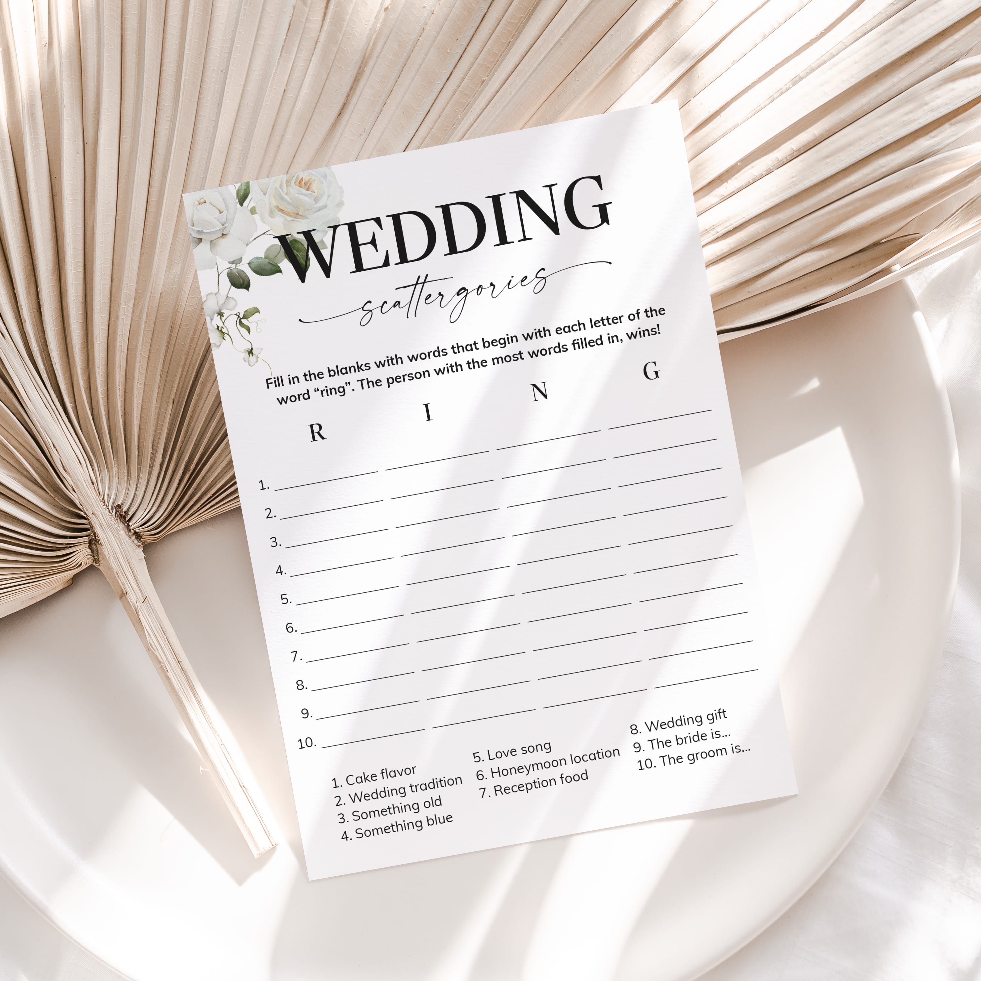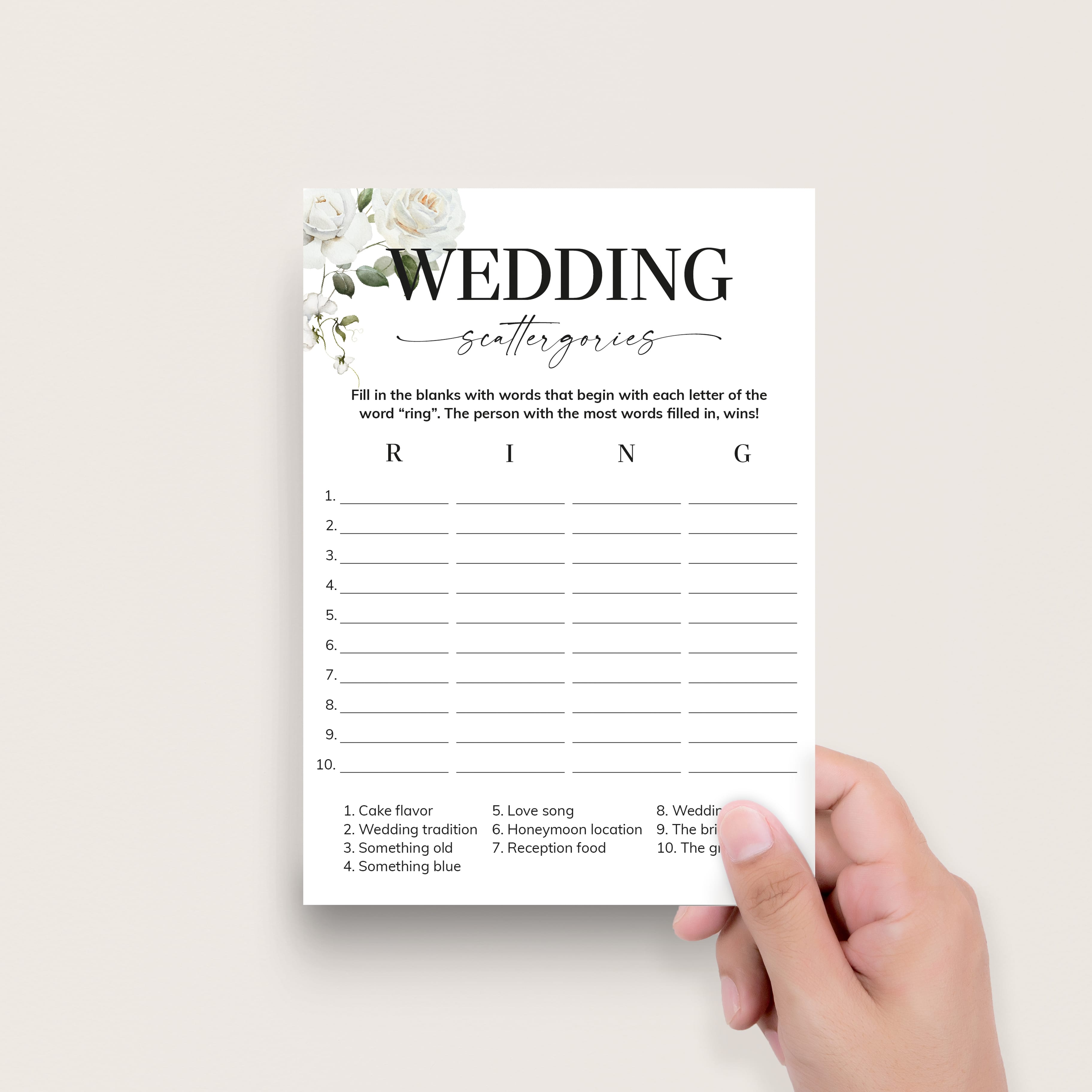 How many words can you fill in with the letters "R", "I", "N" and "G"? Play Wedding Scattergories at your couples shower or engagement party with these elegant white floral game cards to ensure lots of fun and laughter.