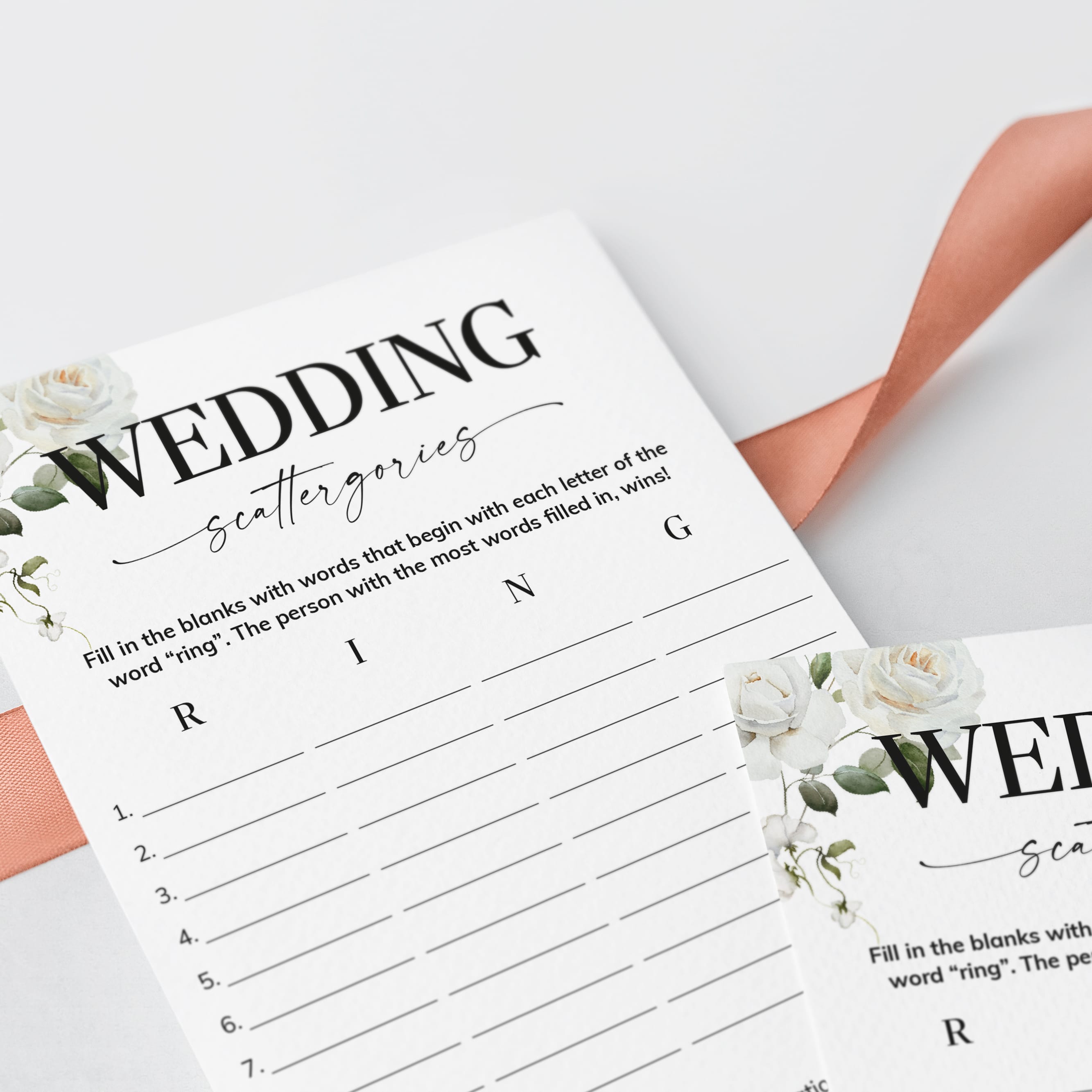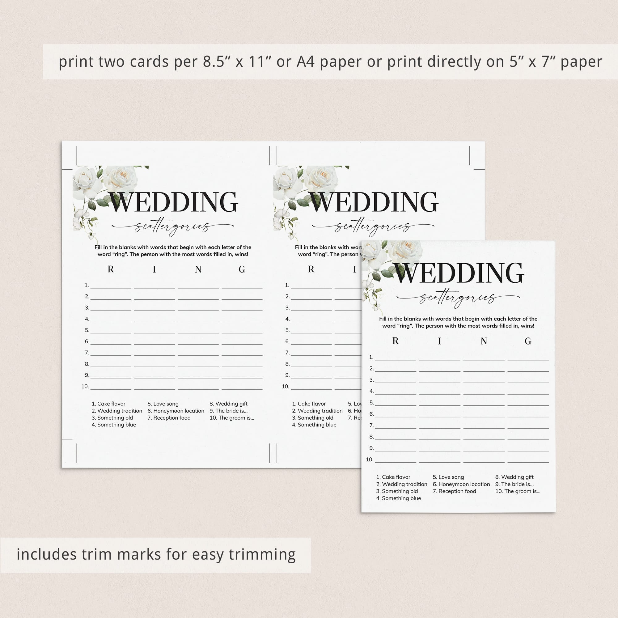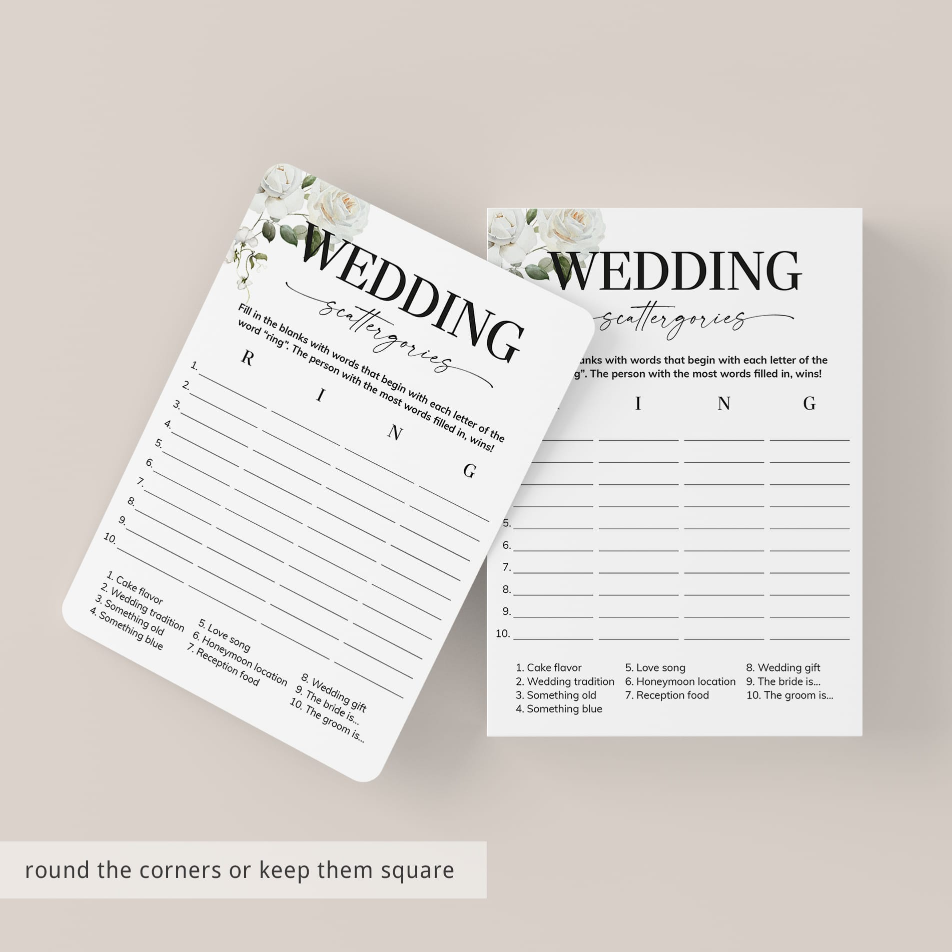 How many words can you fill in with the letters "R", "I", "N" and "G"? Play Wedding Scattergories at your couples shower or engagement party with these elegant white floral game cards to ensure lots of fun and laughter.