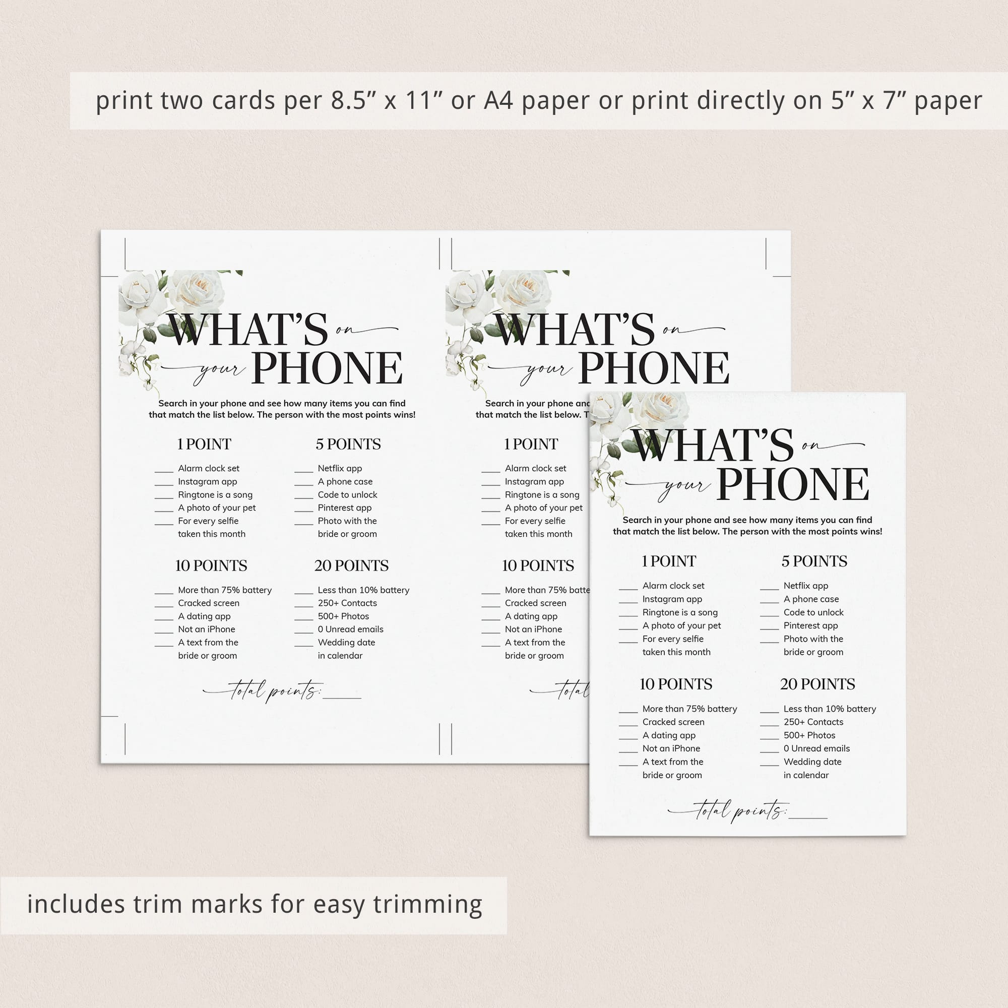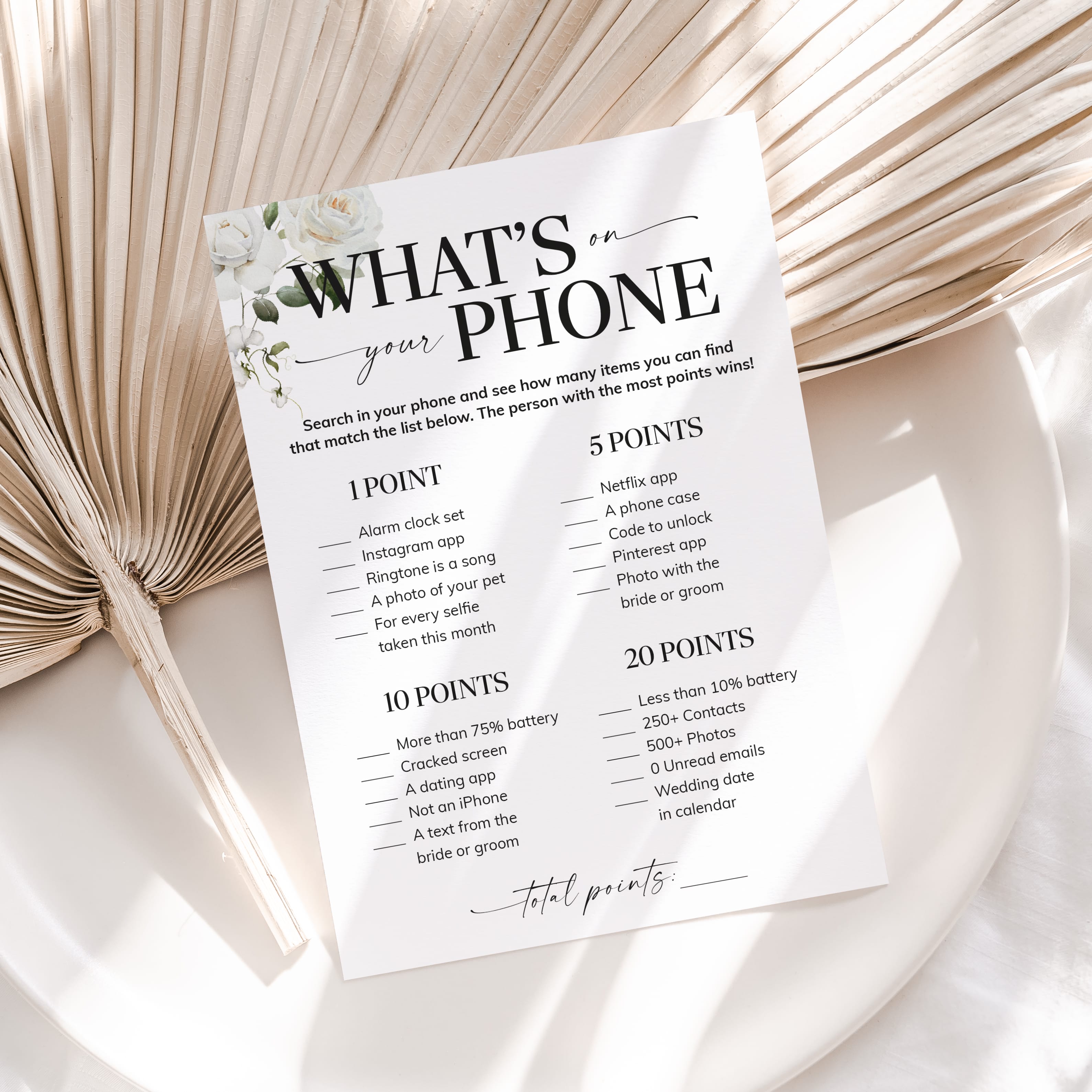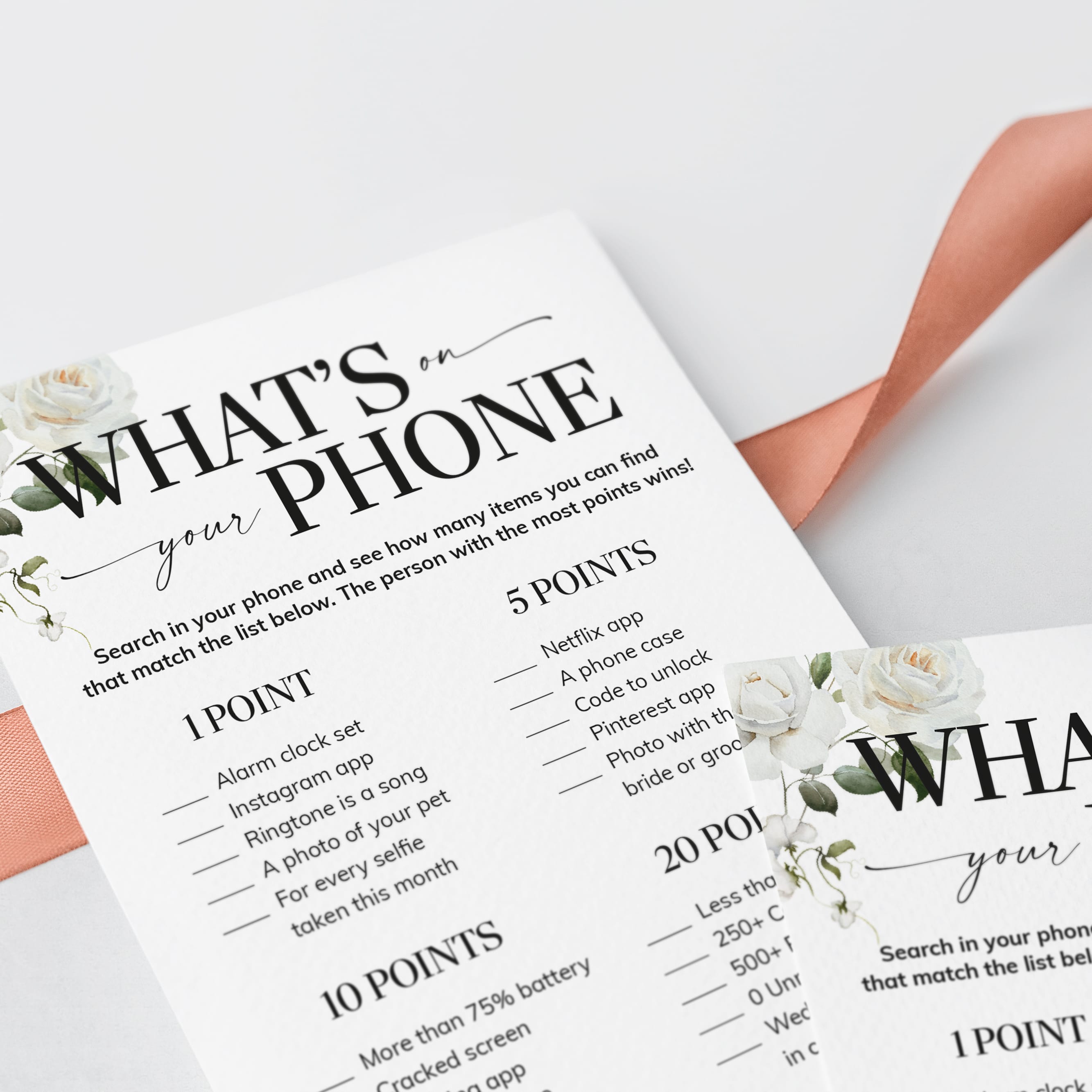 Does this sound familiar to you? Then this What’s In Your Phone game is the perfect icebreaker for your engagement party or wedding shower. It’s super easy to prepare for and simple to play. All guests need to play is a smartphone, one of these elegant white floral Whats In Your Phone game cards and a pen.