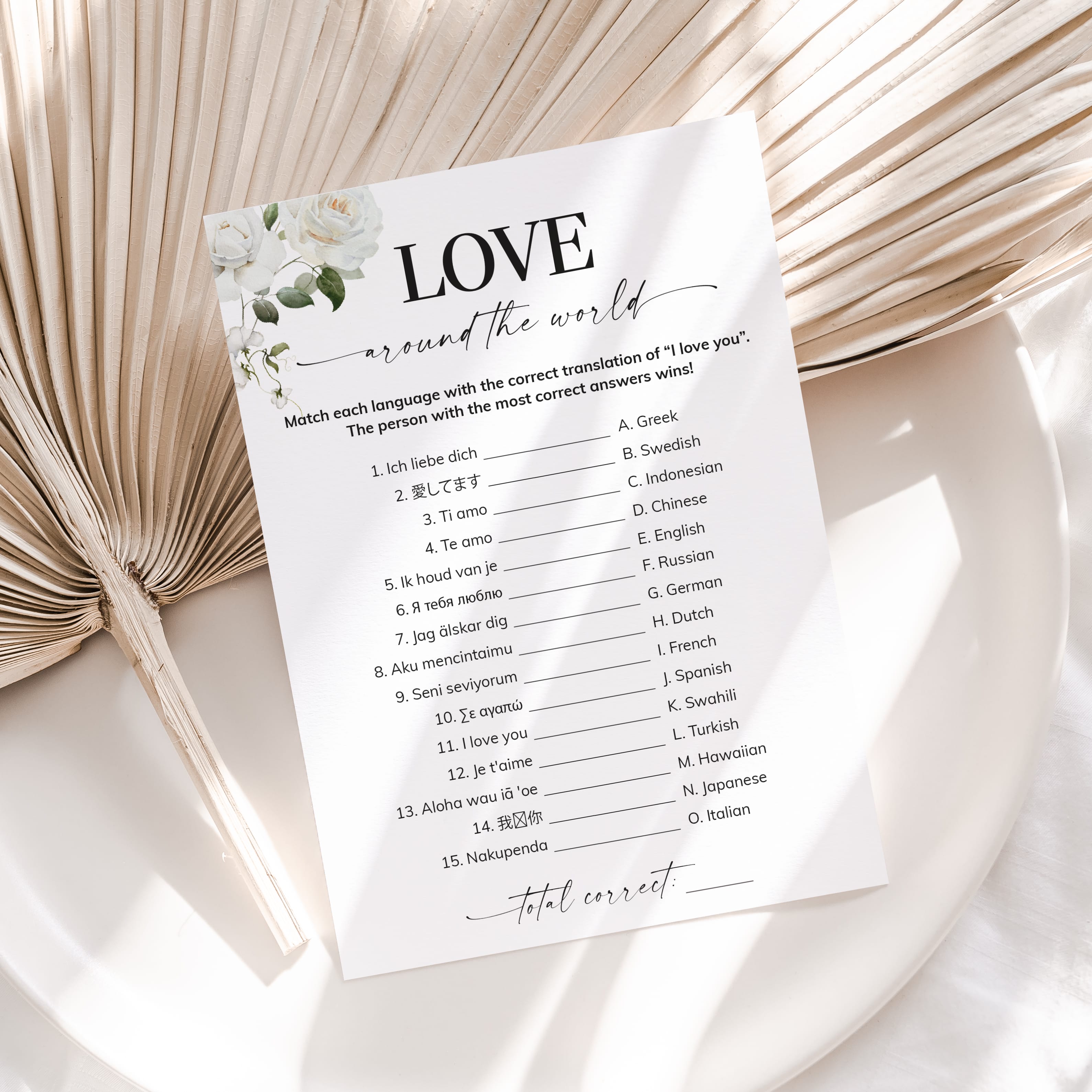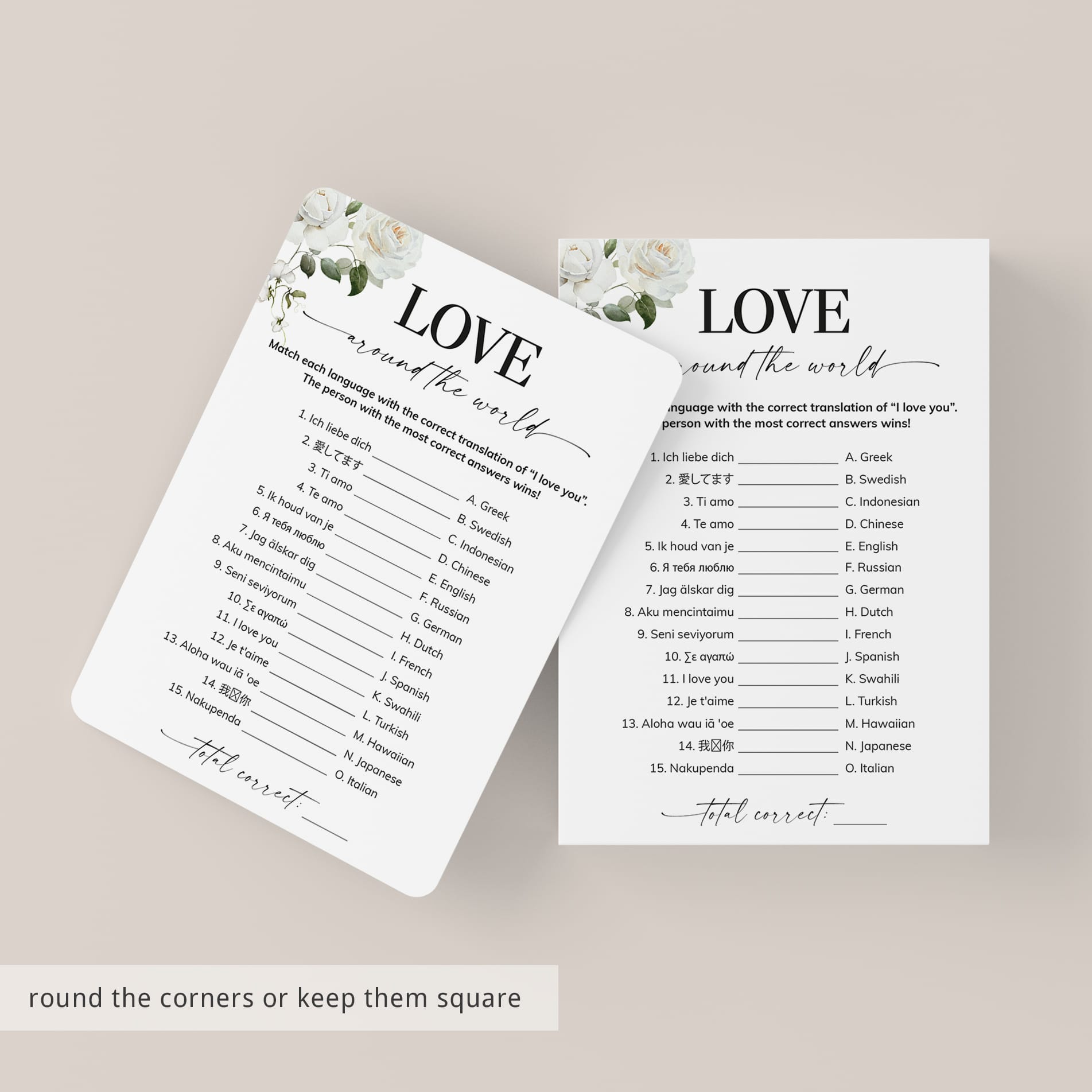 The game is very easy to play. Print and distribute these elegant Love Around The World game cards with gorgeous white floral arrangements and a pen to each of your guests. They have to match each version of the words “I Love You” with its language of origin. The person with the most correct answers wins.