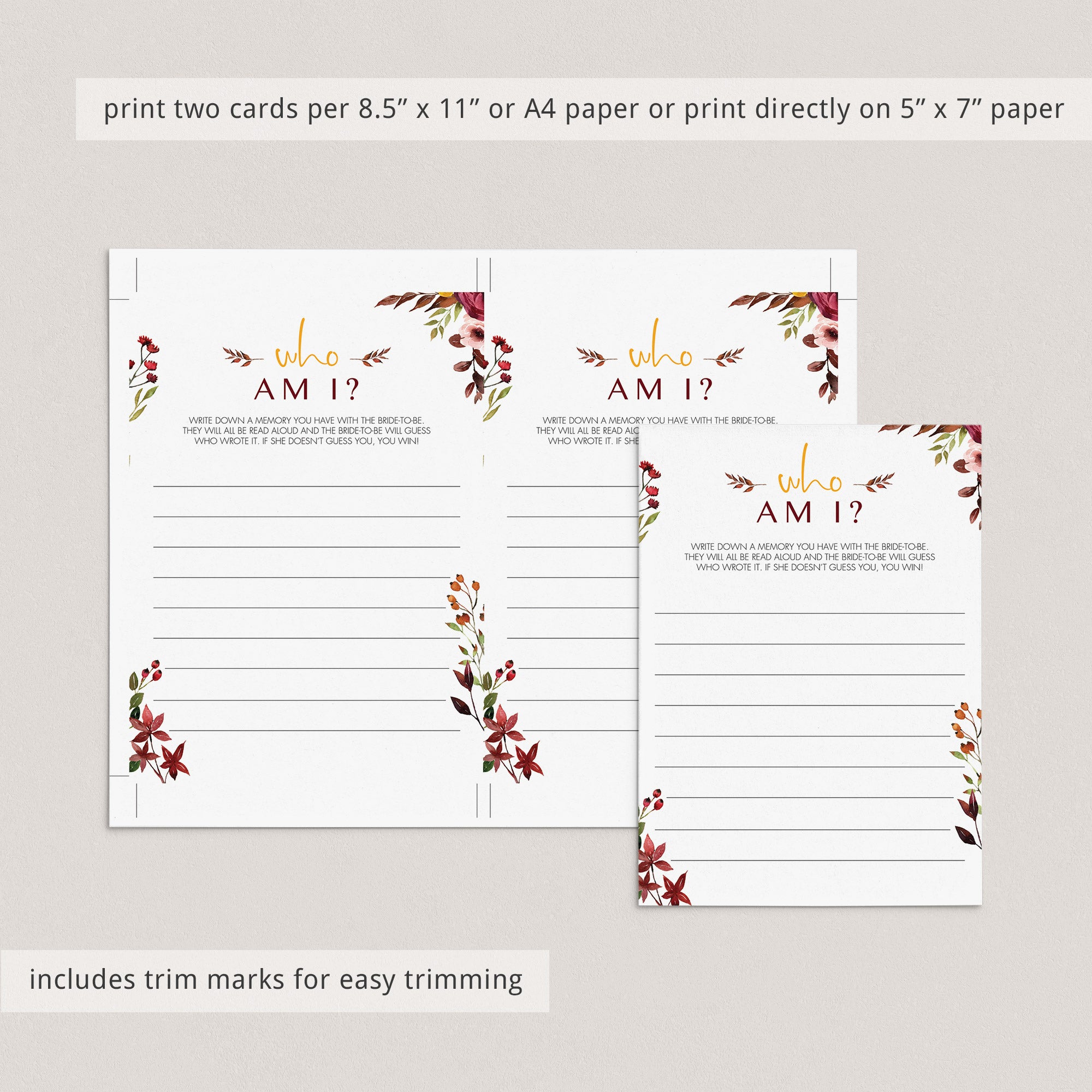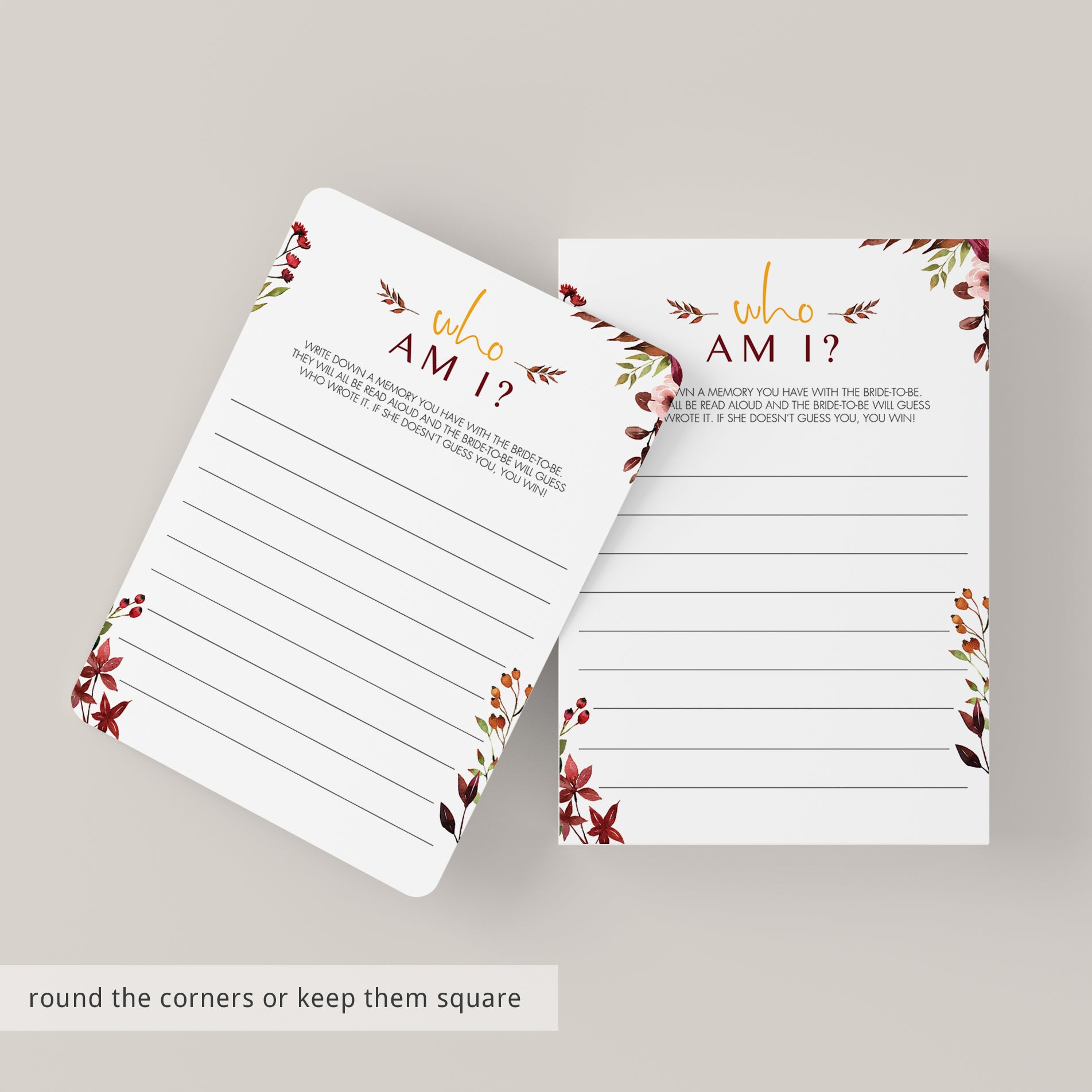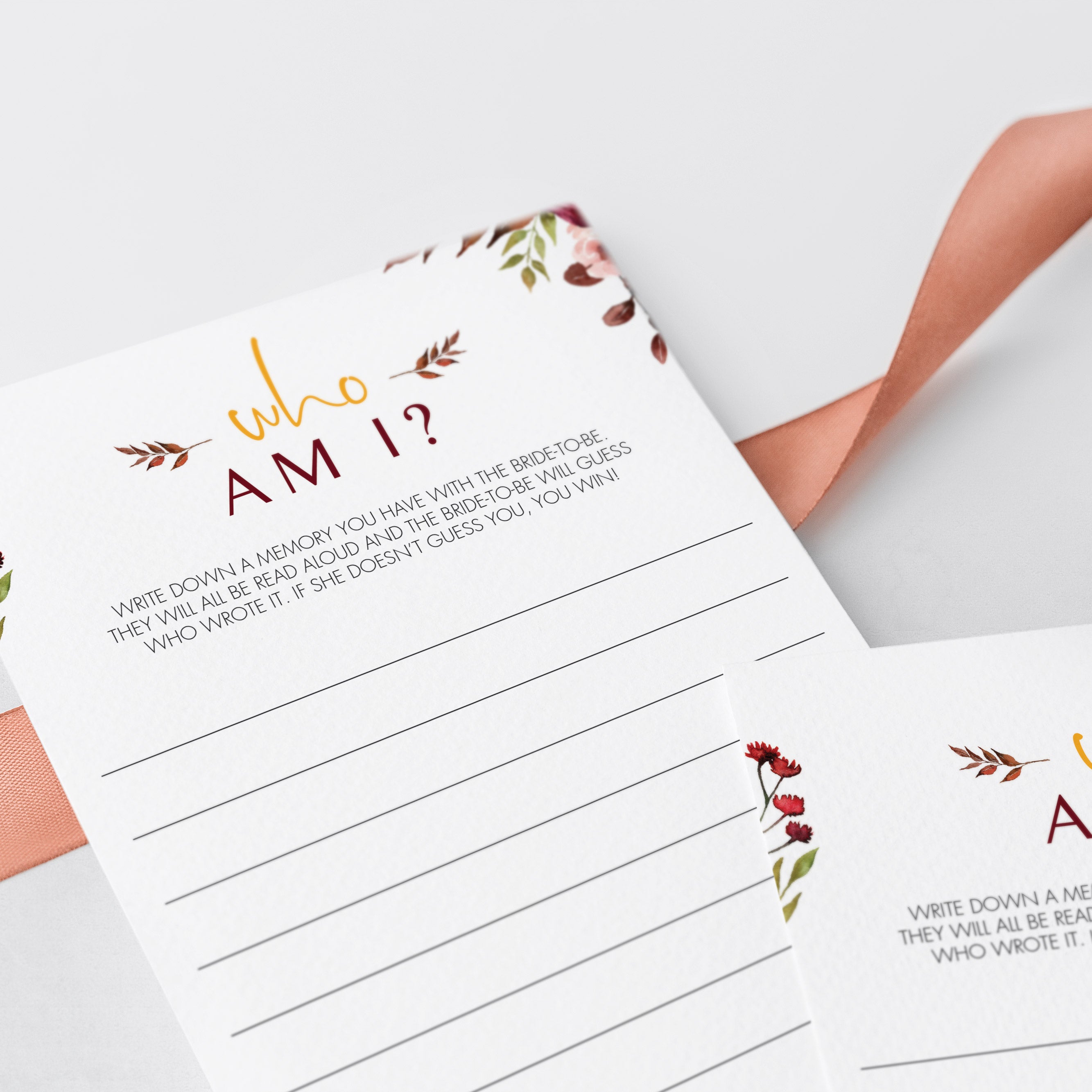 Are you looking for a fun icebreaker game to play at your bridal party? Play Who Am I with these beautiful burgundy floral game cards. It's the perfect addition to your boho theme bridal shower and it will sure get your guests mingling!
