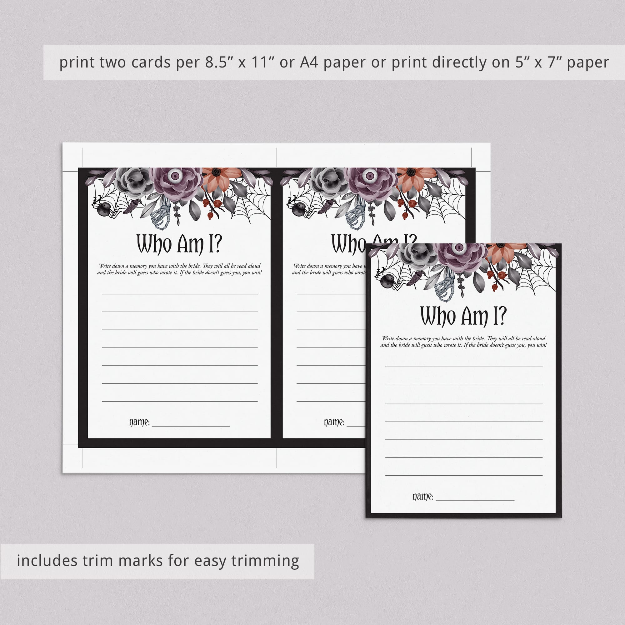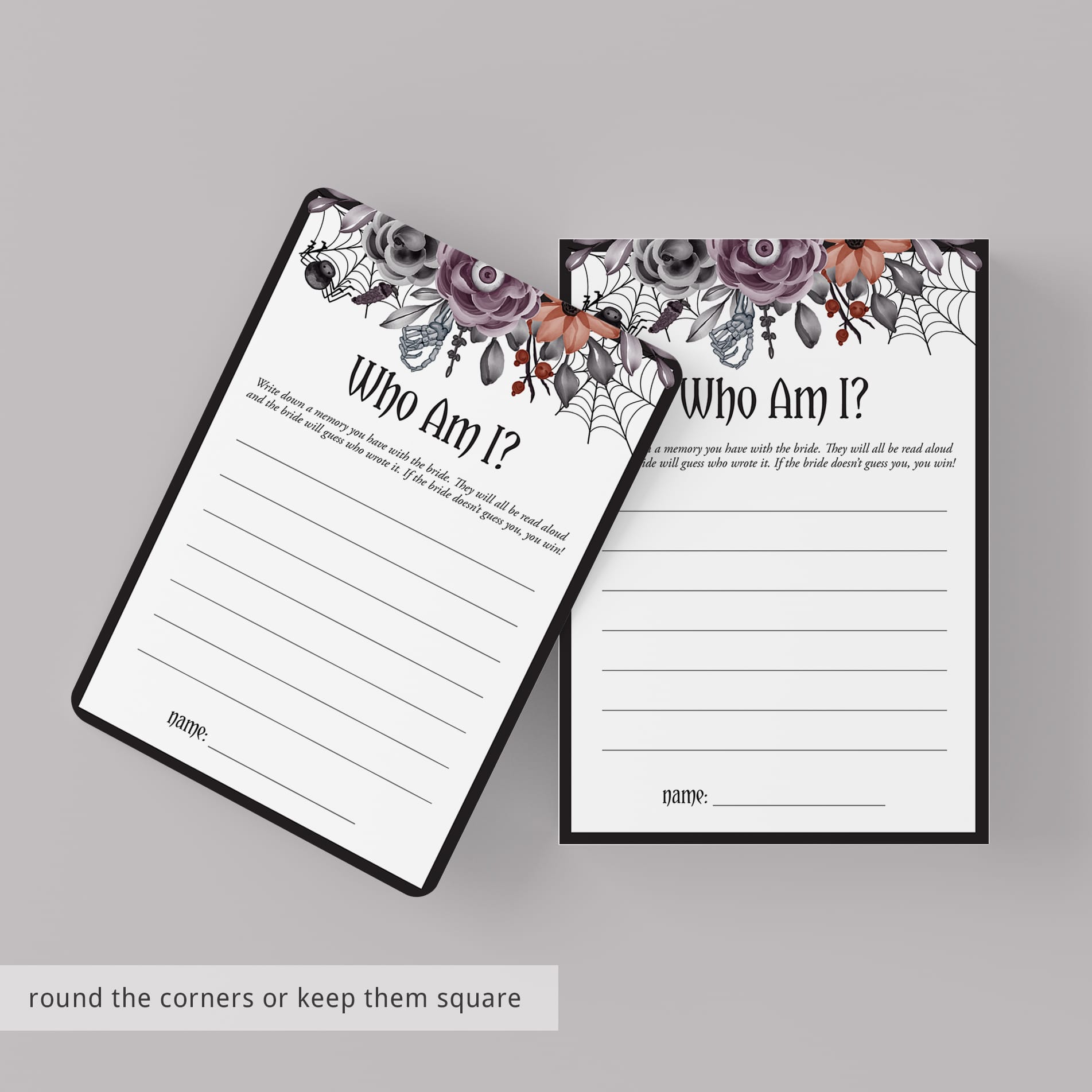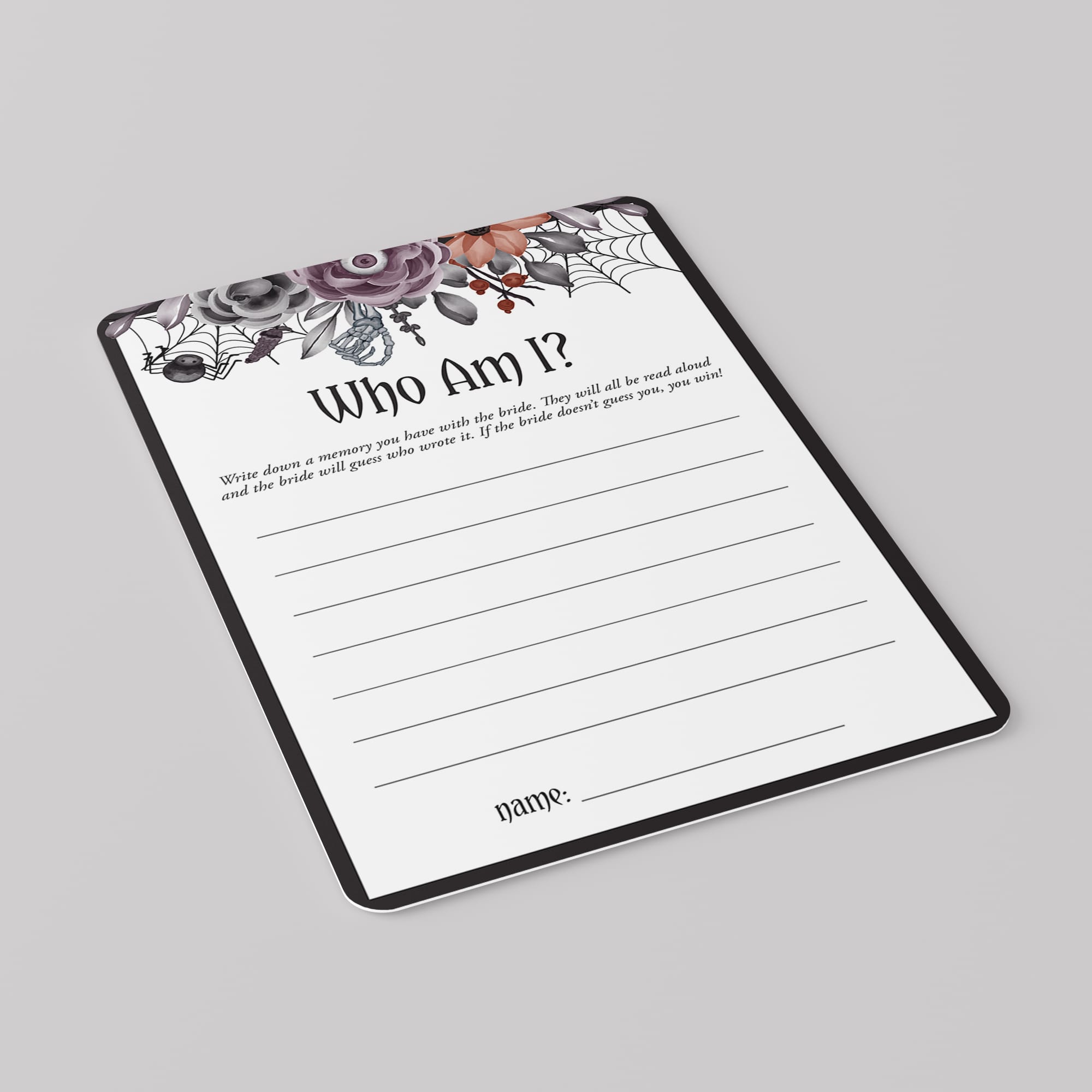 Are you looking for a fun game to play at your Halloween bridal shower? Play Who Am I with these moody purple and black floral game cards. It's the perfect addition to your Halloween theme or Gothic bridal shower and it's sure to be a hit at your party!